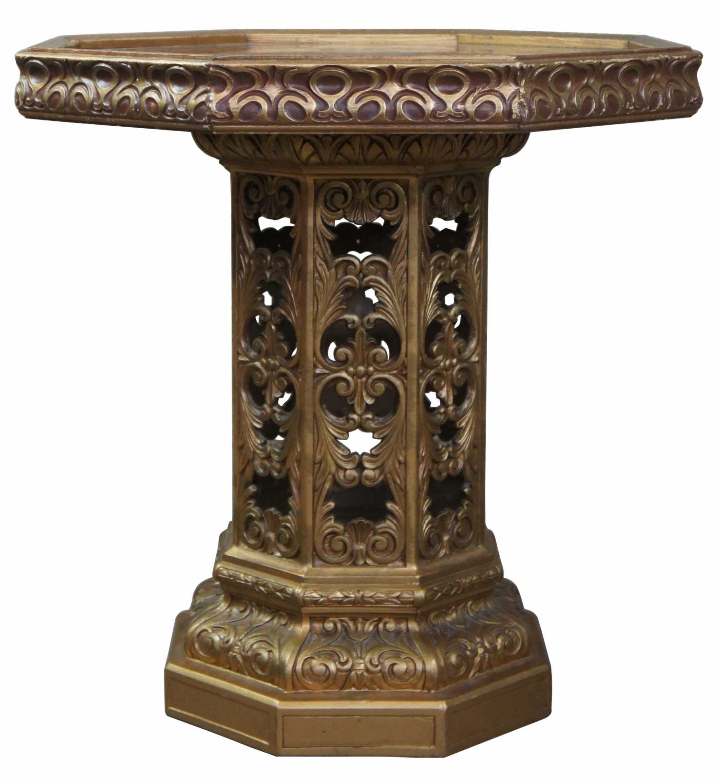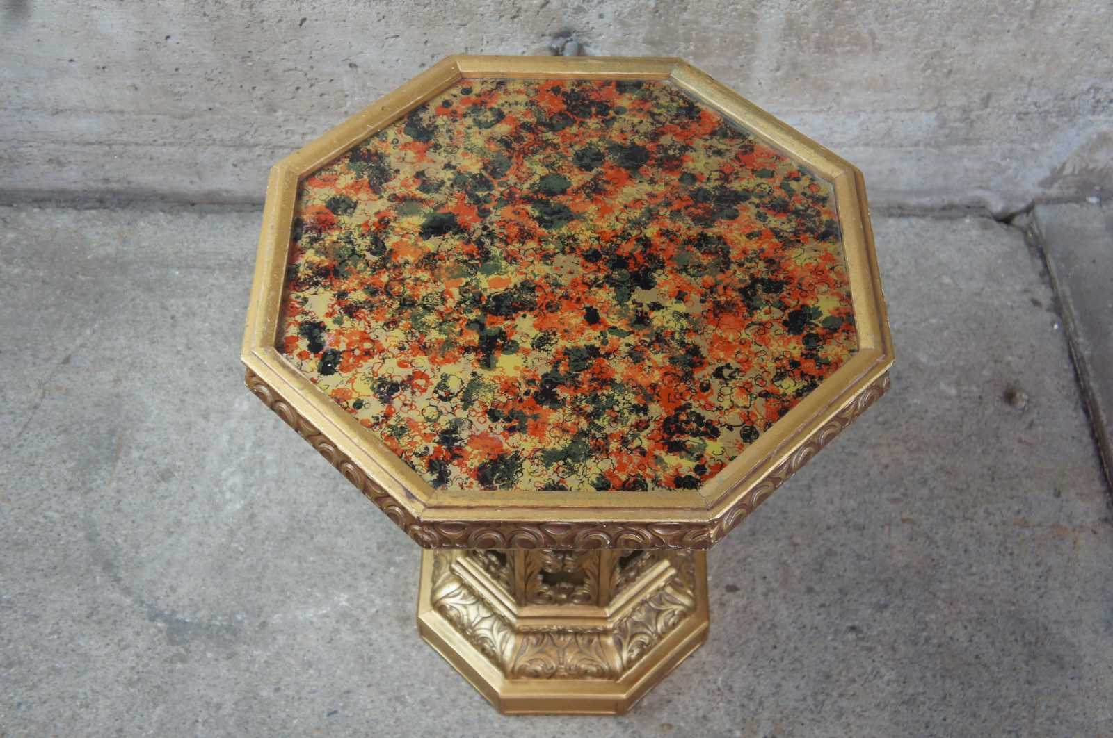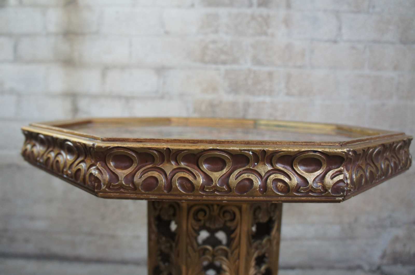 Circa 1970s French inspired gold tone pedestal table with octagon shaped eglomise top. Made in Chicago Illionois.