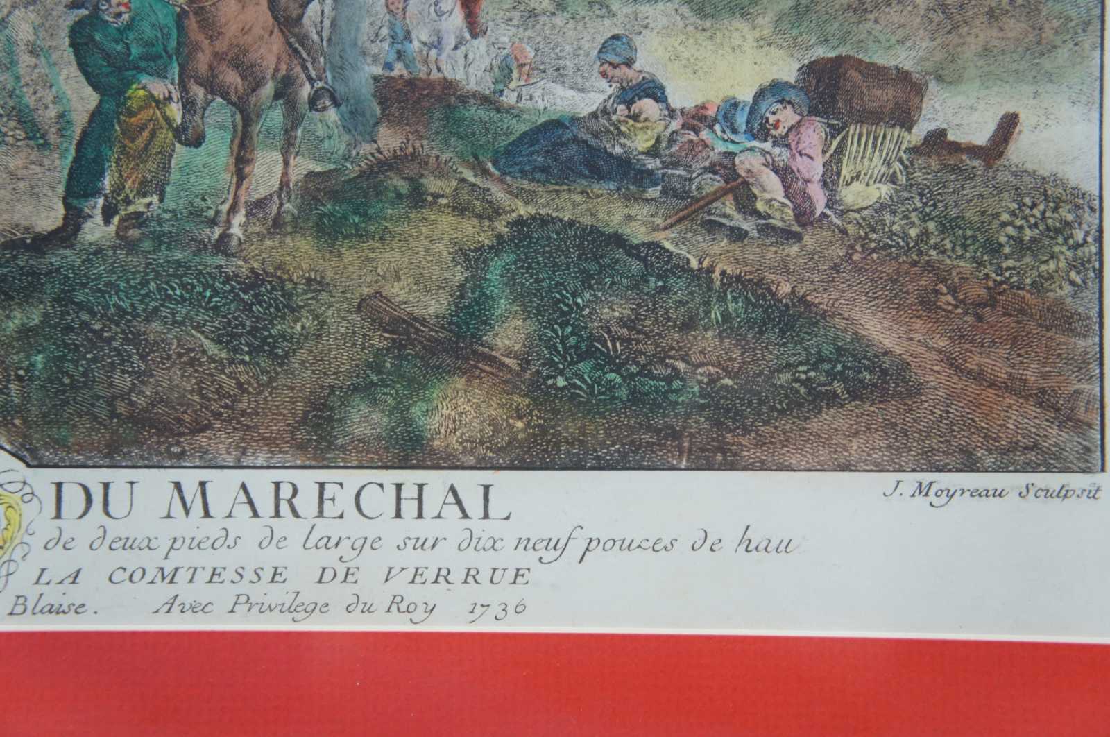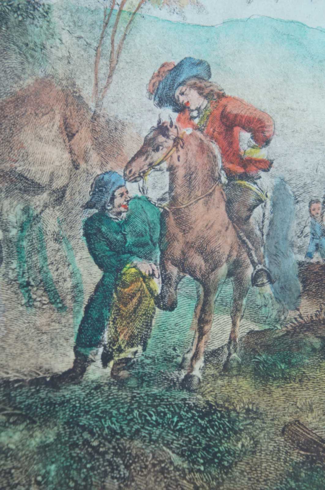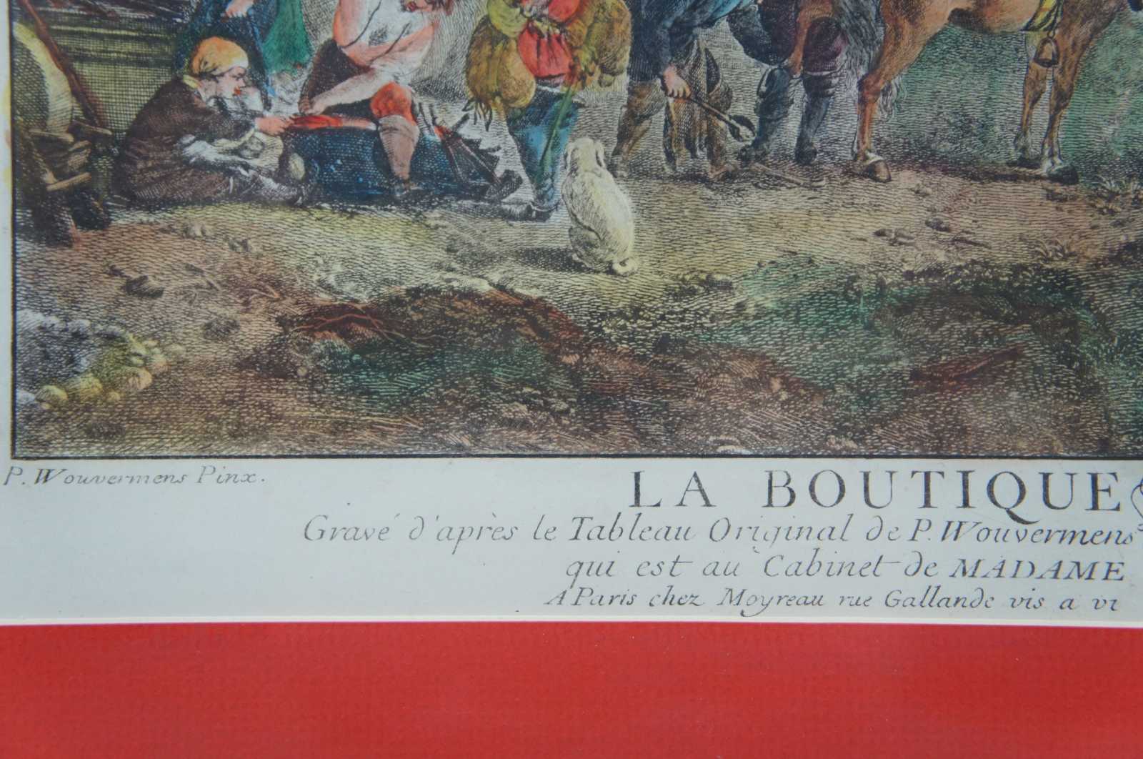 20th century lithograph print, after Philips Wouwerman (Dutch, 1619-1688) by Jean Moyreau , features a rural landscape scene depicting horsemen or riders stopping at a Blacksmith "aka Marshalls Shop" in the mountains, a farrier shoeing a horse in the foreground with a castle in the distance.