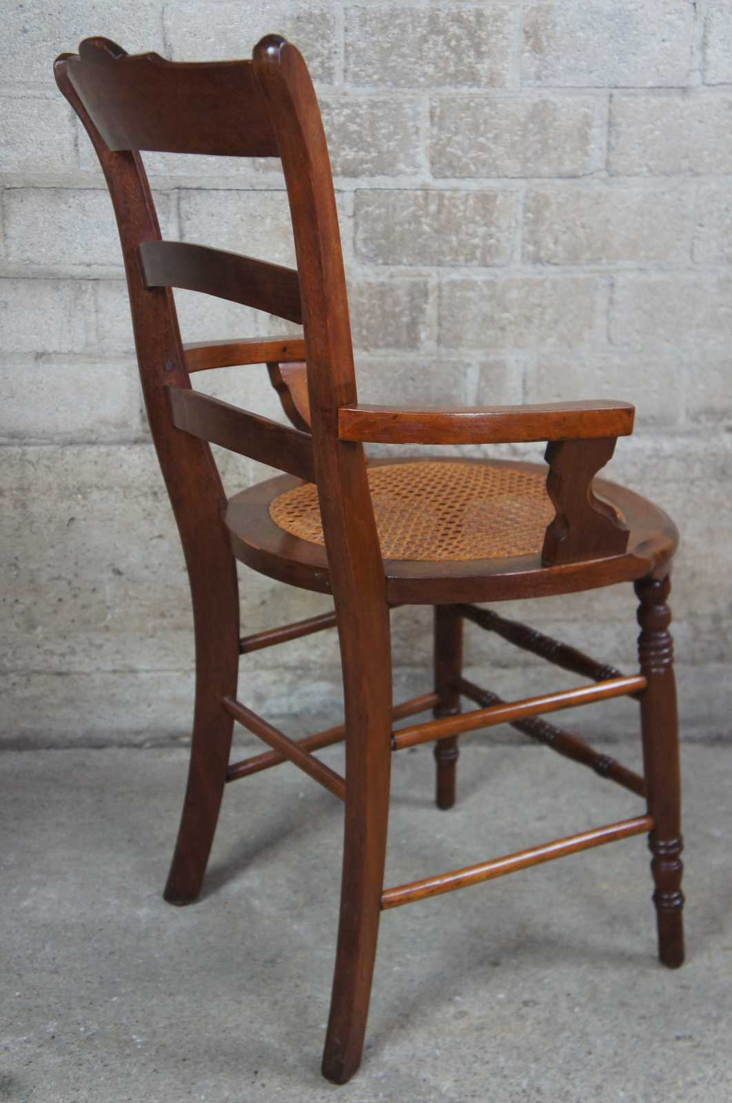A neat pair of Victorian chairs. Circa late 19th century. Made from walnut with burled panels, carved accents and a cane seat.