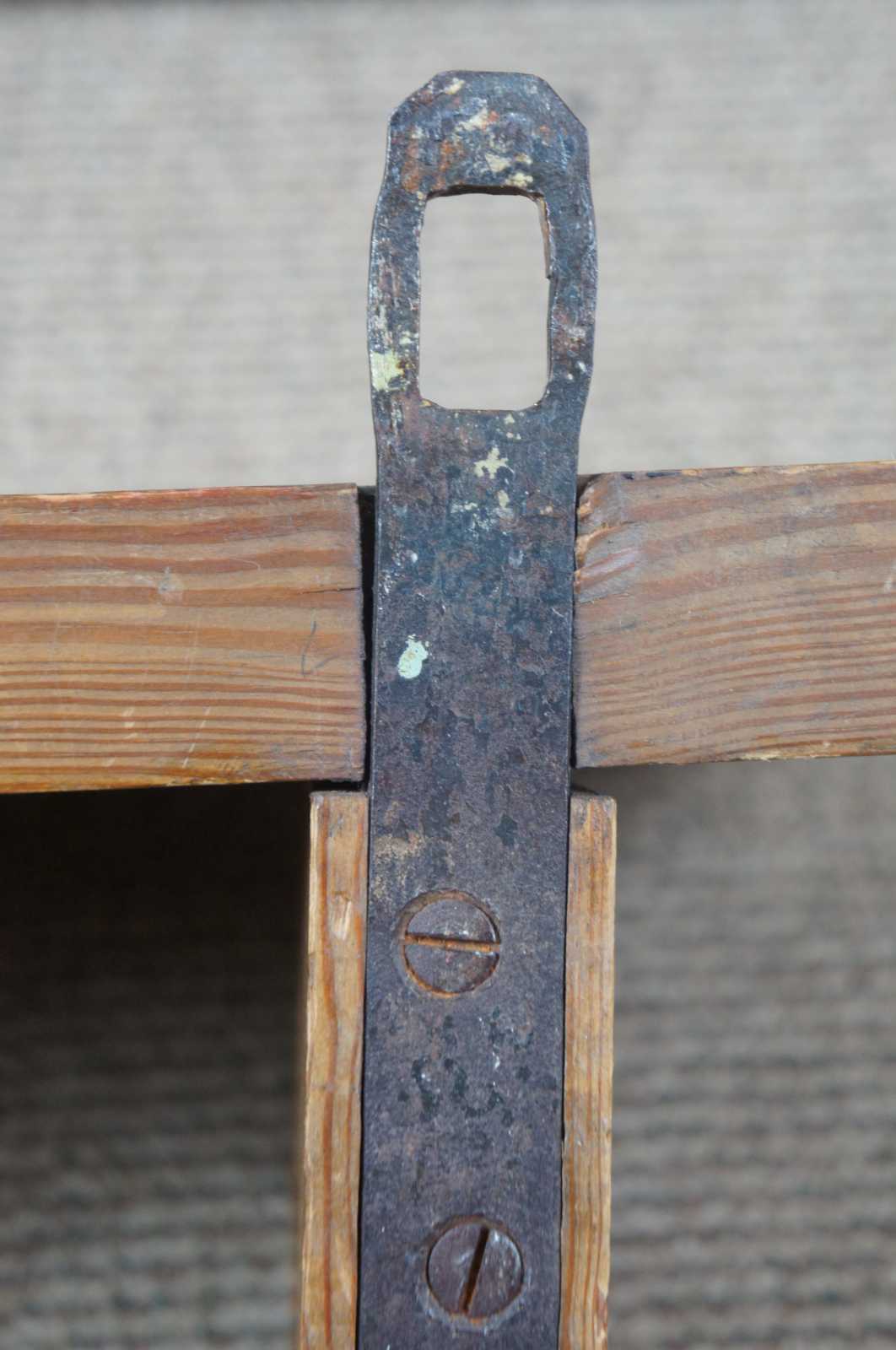 Early 20th century antique european pine wall shelf. Features engraved side panels, serpentine supports and heavy iron bracket for mounting.