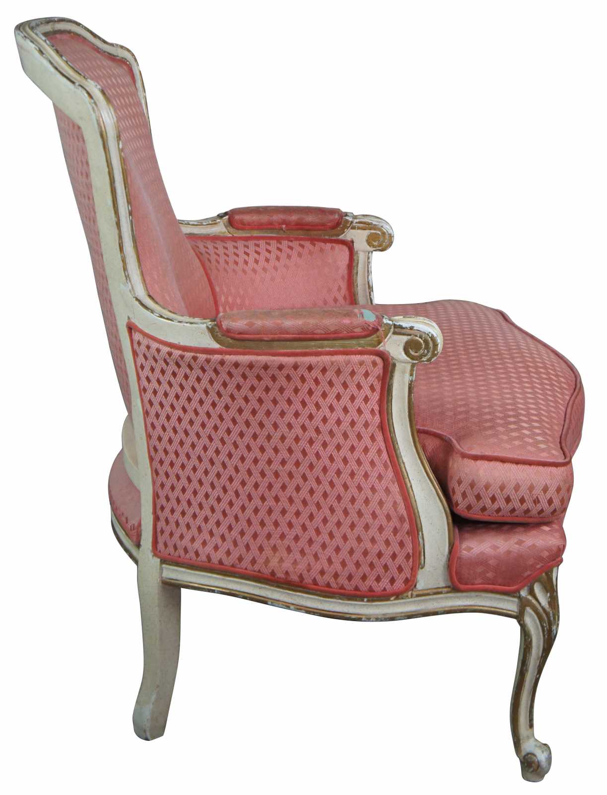 Circa 1930s French Provincial arm chair. Off-white with gold trim and red/pink upsholstery with interwoven design.