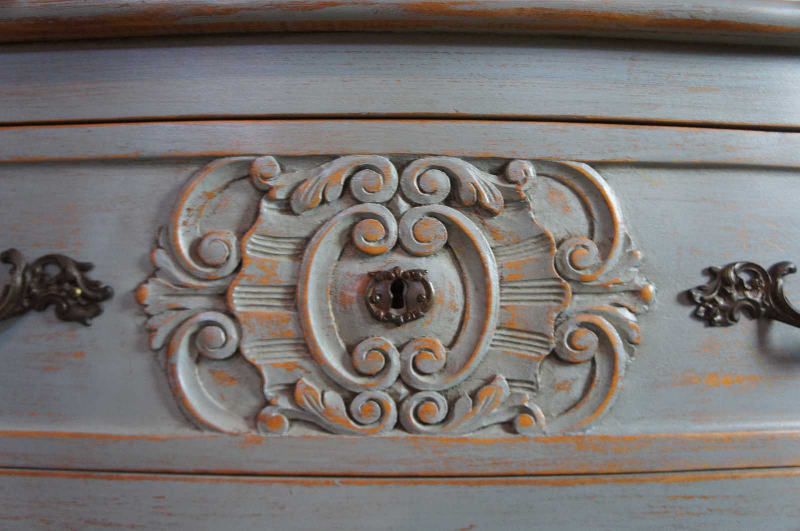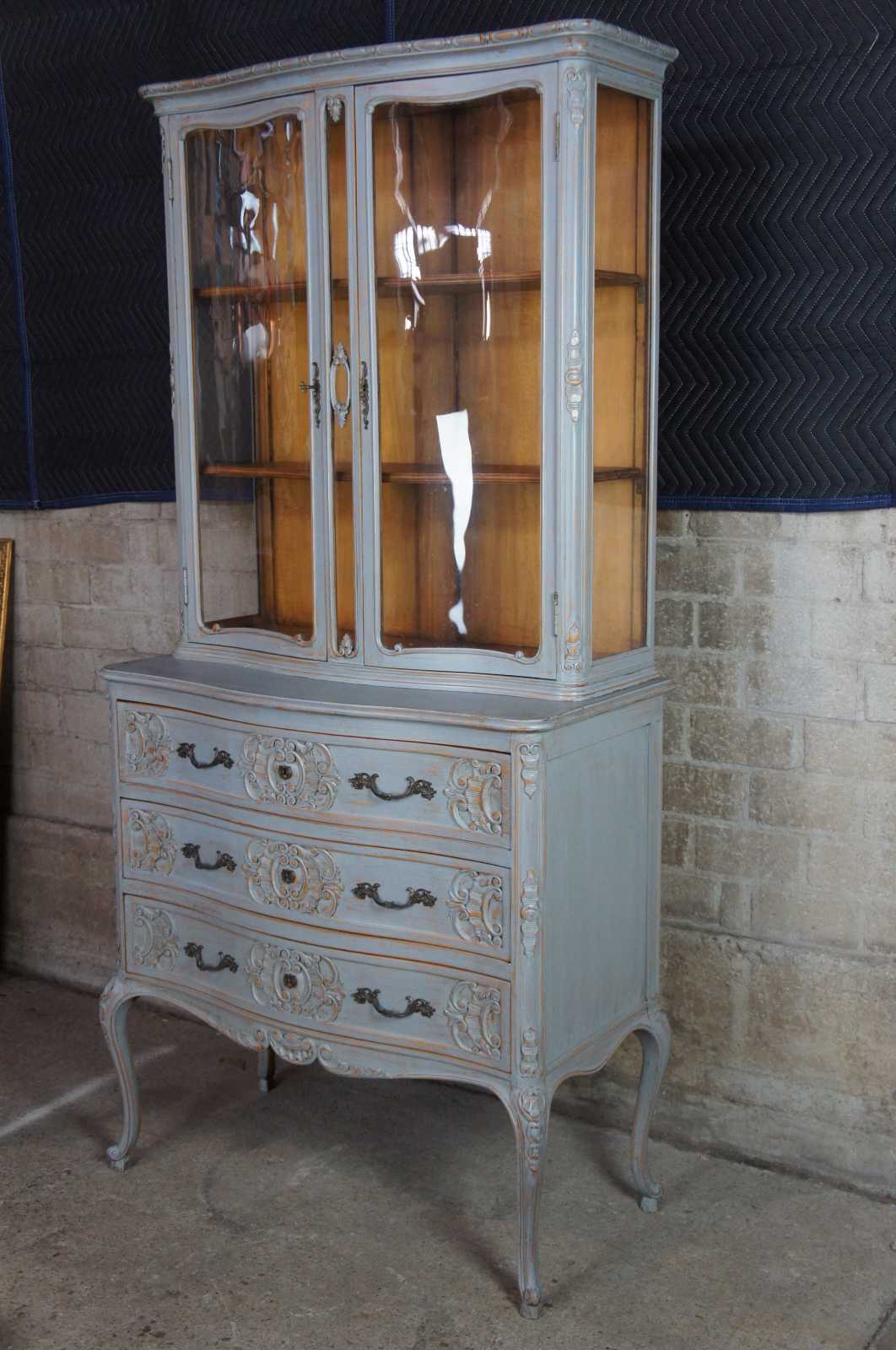 Early 20th century French curio cabinet. Made from oak. Features three scalloped and carved drawers, cabriole legs and a glass covered hutch with two shelves. Painted grey with metal hardware.