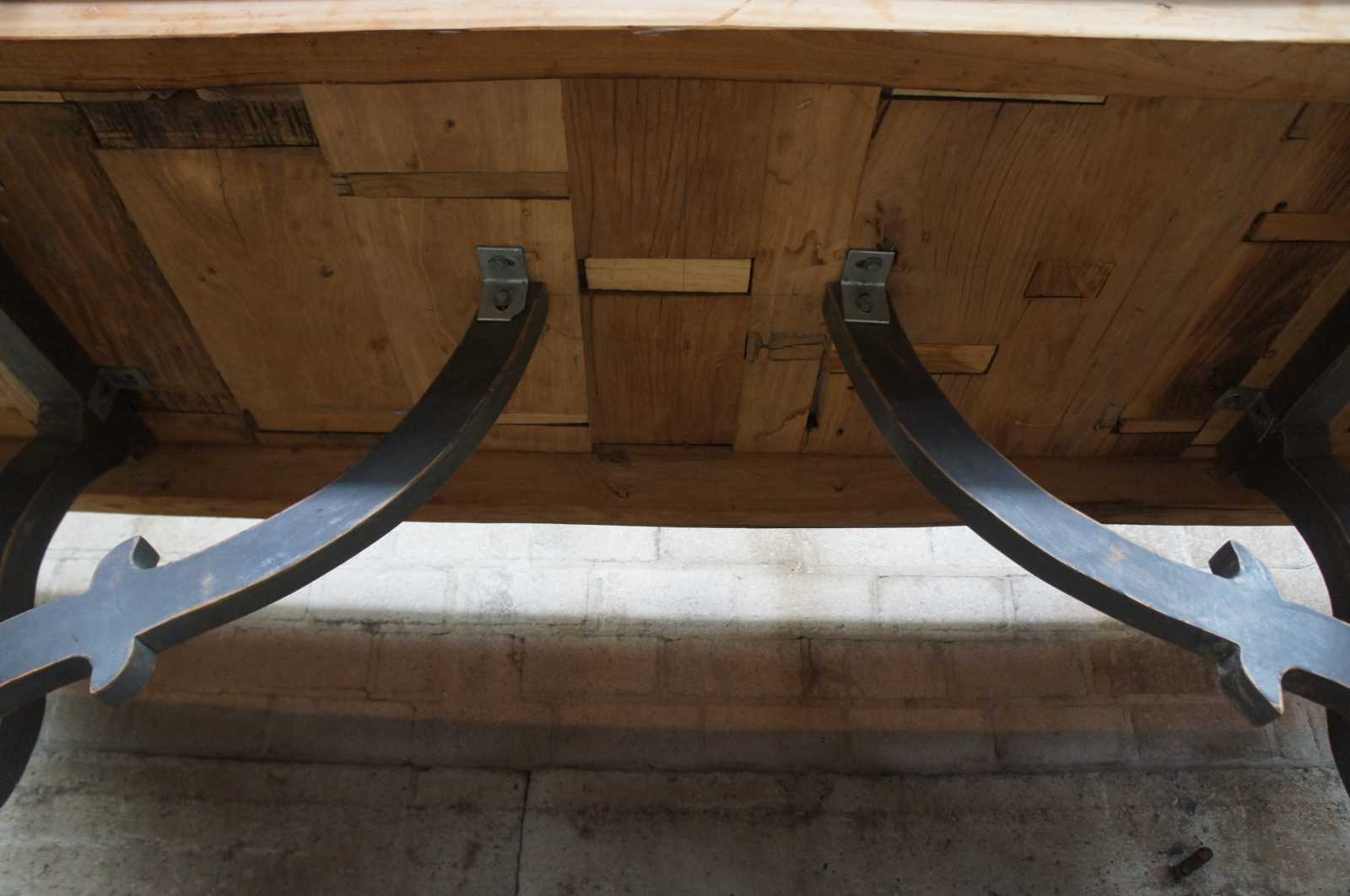 20th century custom made Chinese plank dining table with old world design and painted base.