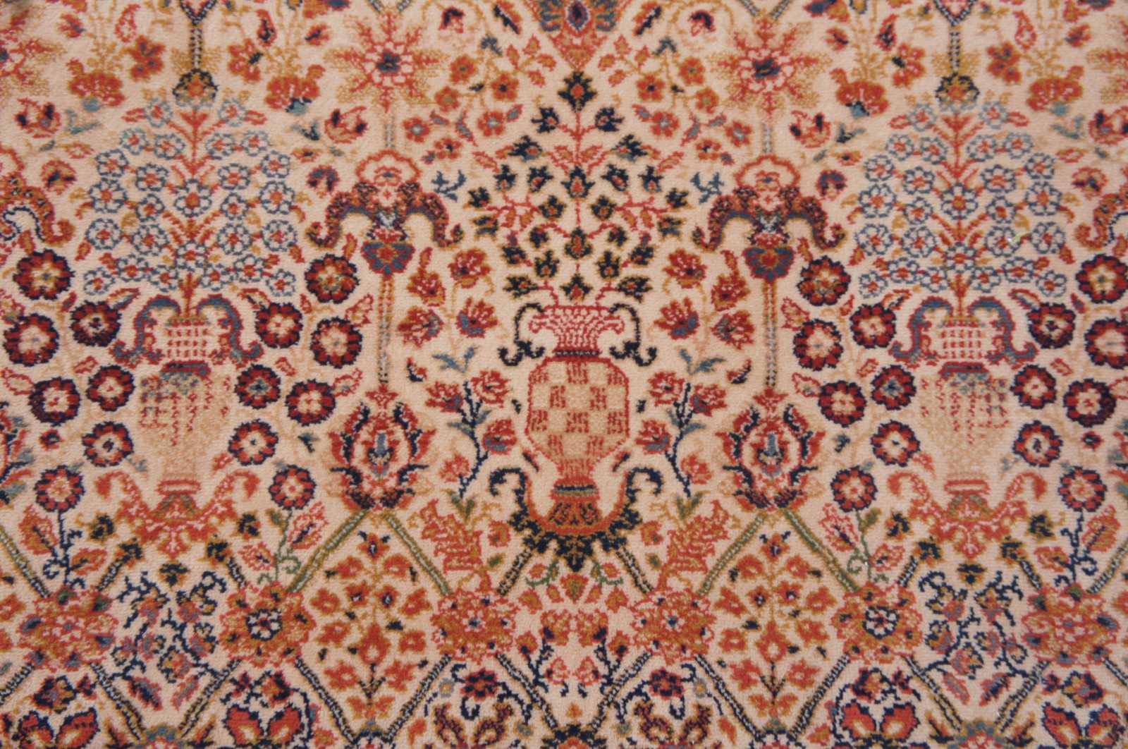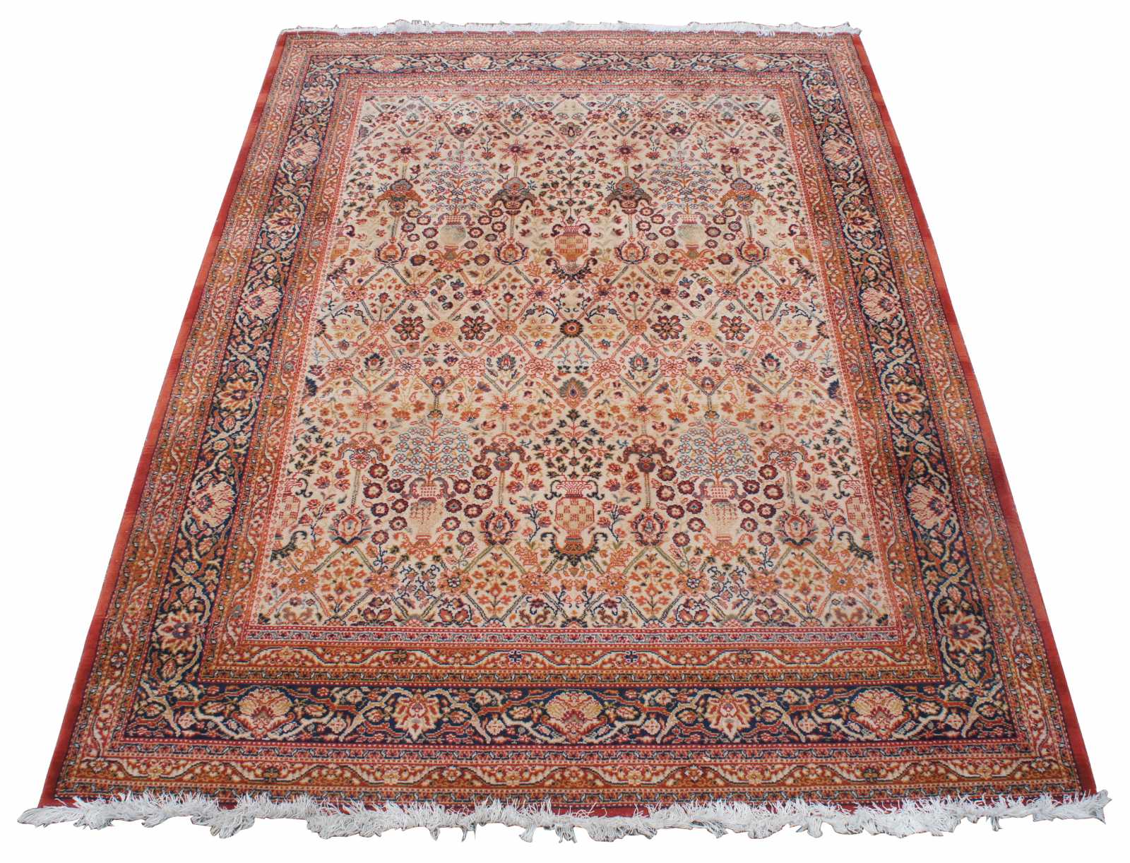 A contemporary Karastan Antique Tabriz area rug, from their “Persian Treasures” collection. It is machine-woven, with a 100% wool pile, made in Belgium. It features a stylized floral pattern in shades or red, navy, and beige, with a white fringe to two sides and serged selvedges.