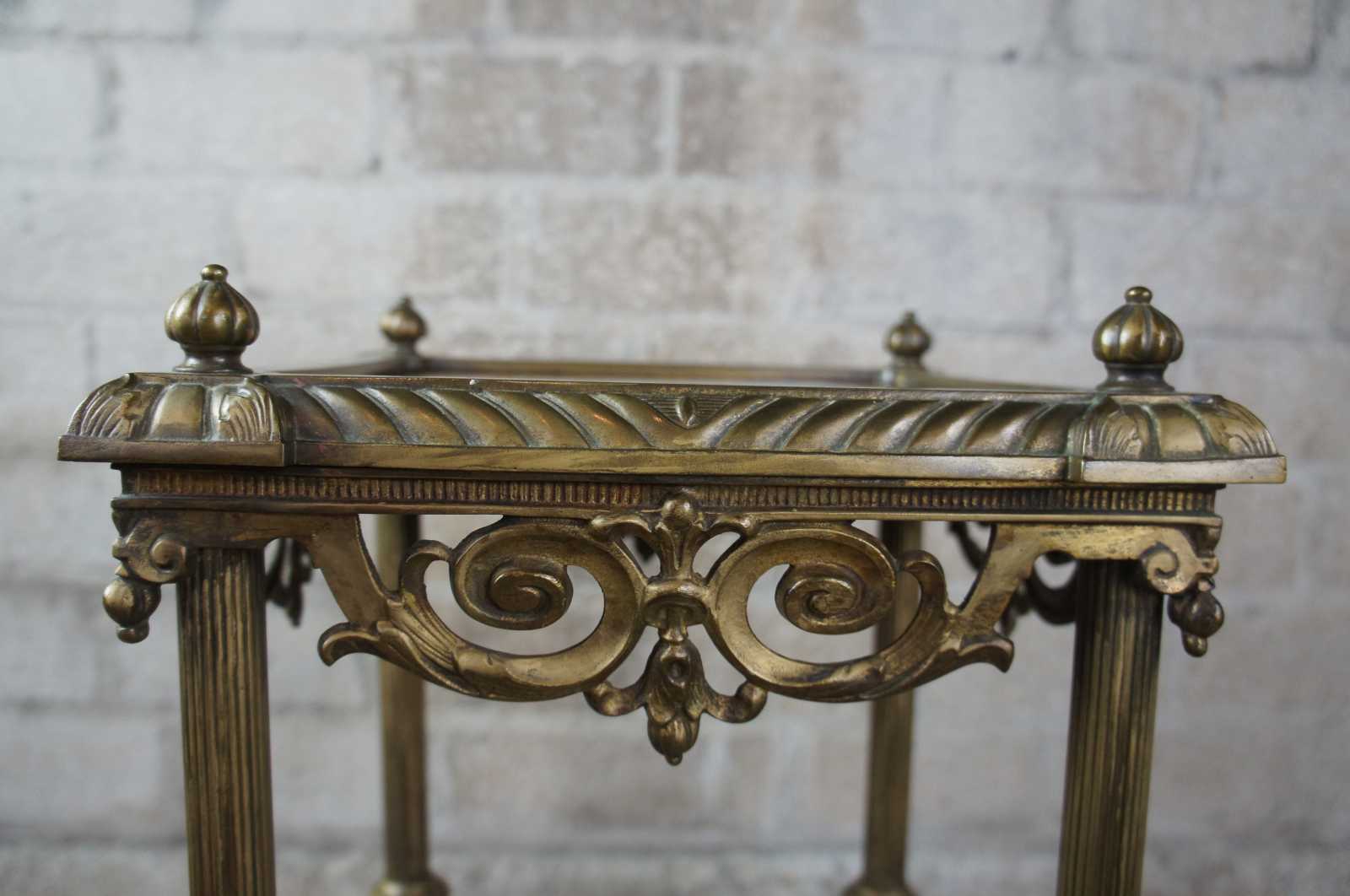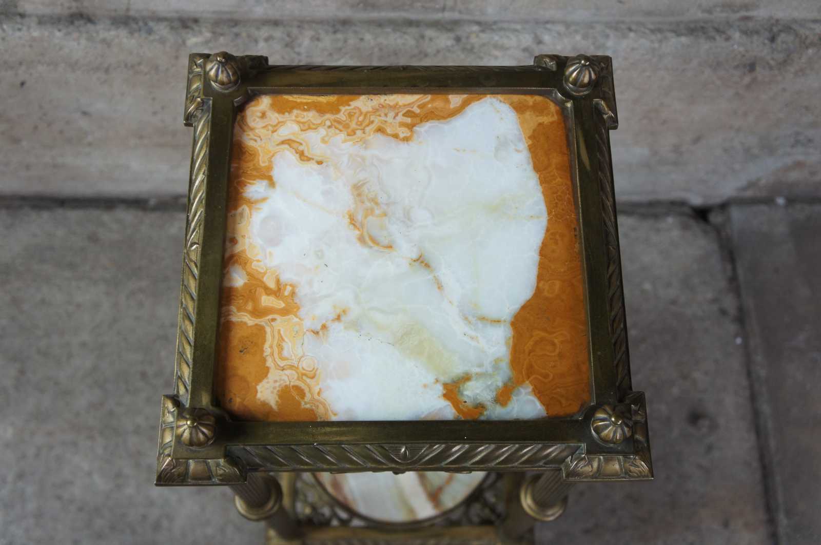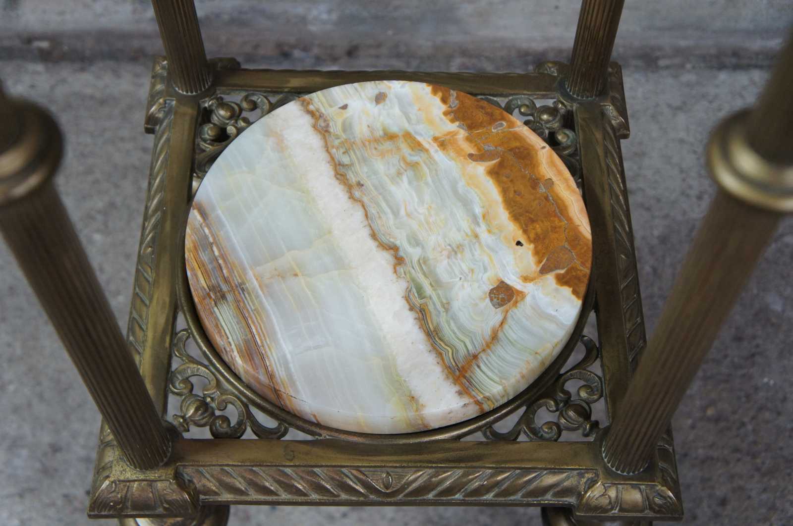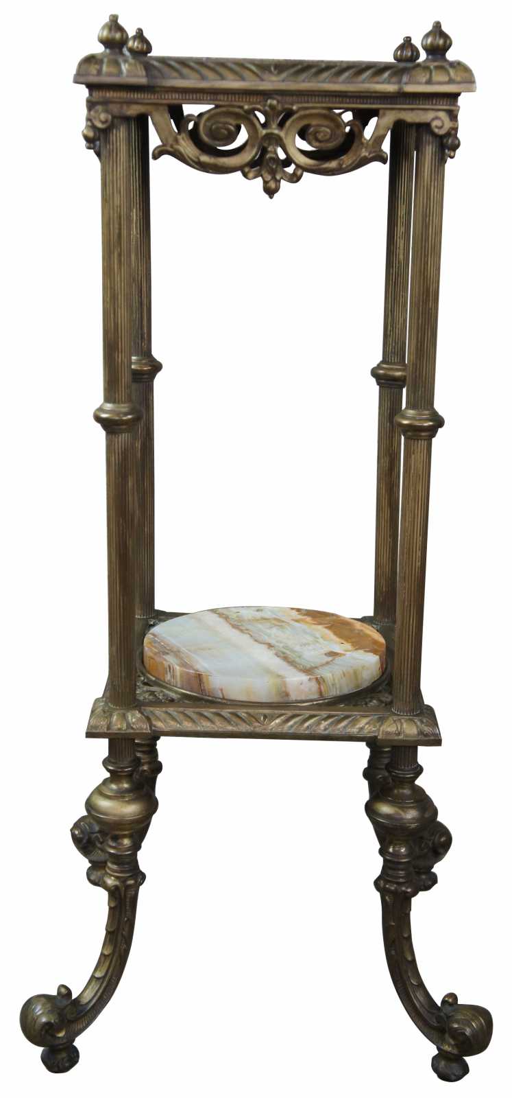 Antique Victorian plant stand or parlor table. Late Victorian period. Featurs ornate design with two tiers, fleur de list details, onyx stone and bronze frame.