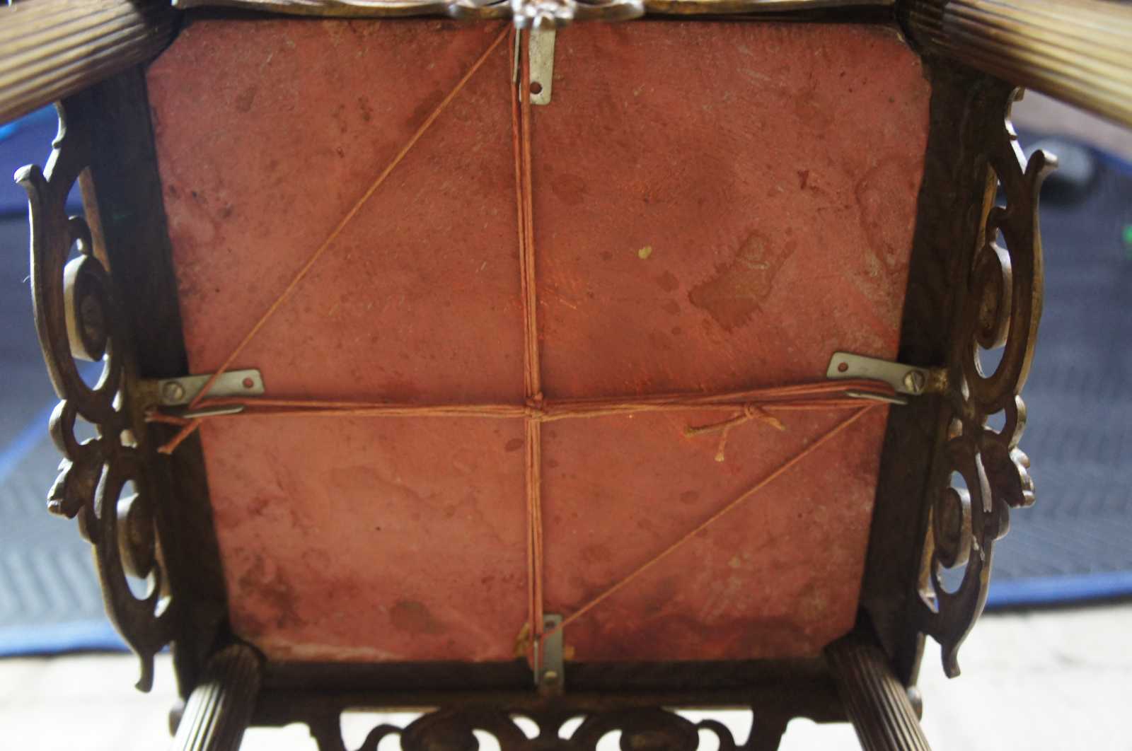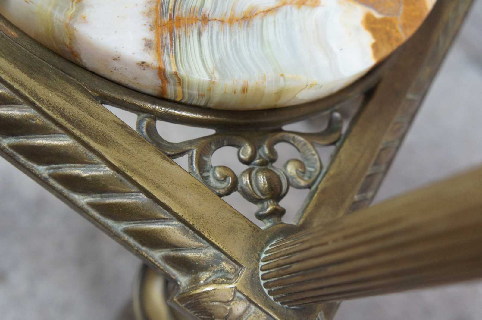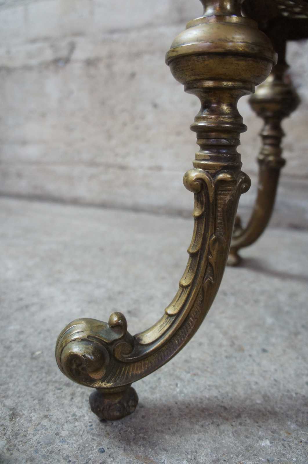 Antique Victorian plant stand or parlor table. Late Victorian period. Featurs ornate design with two tiers, fleur de list details, onyx stone and bronze frame.
