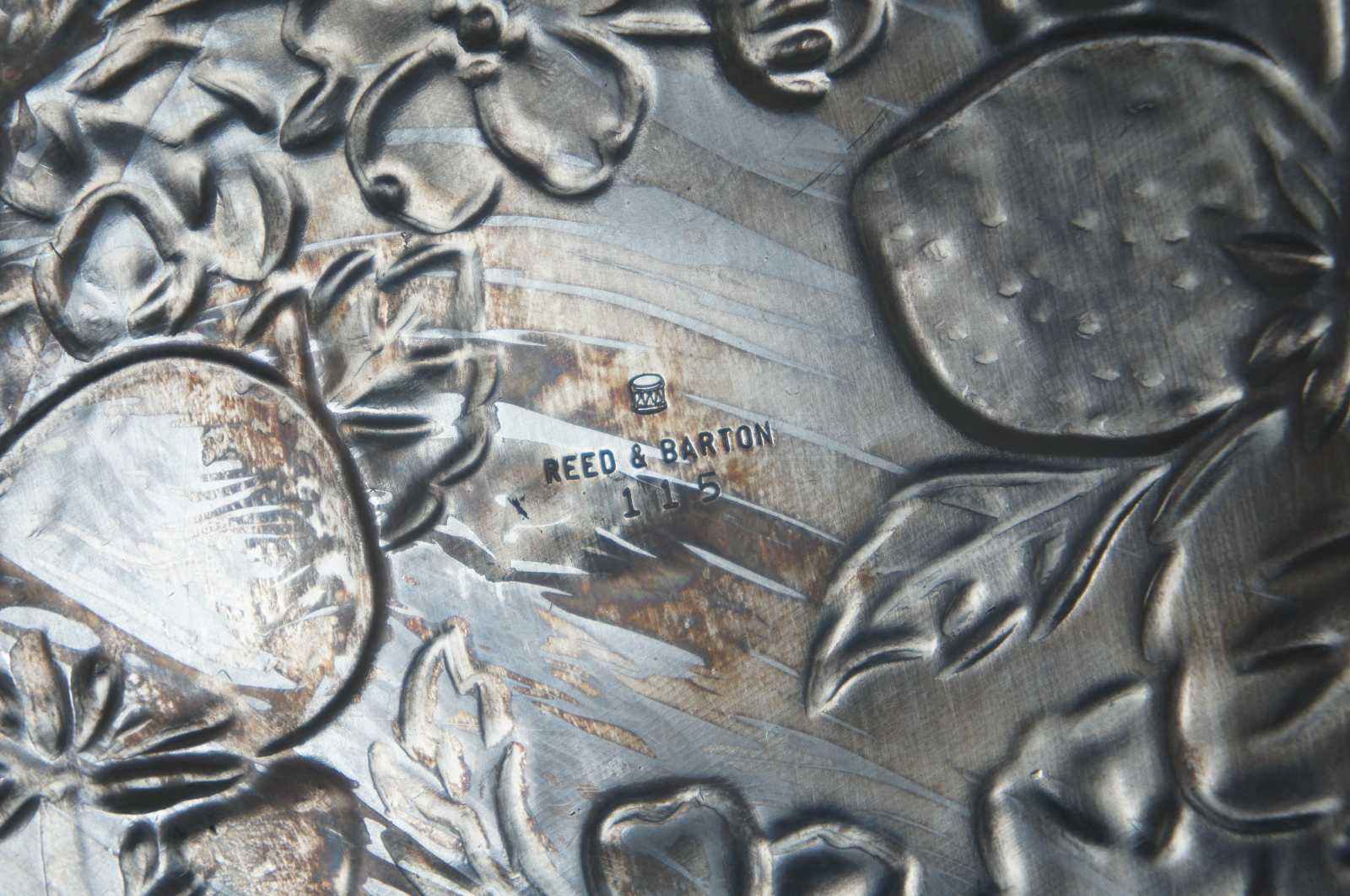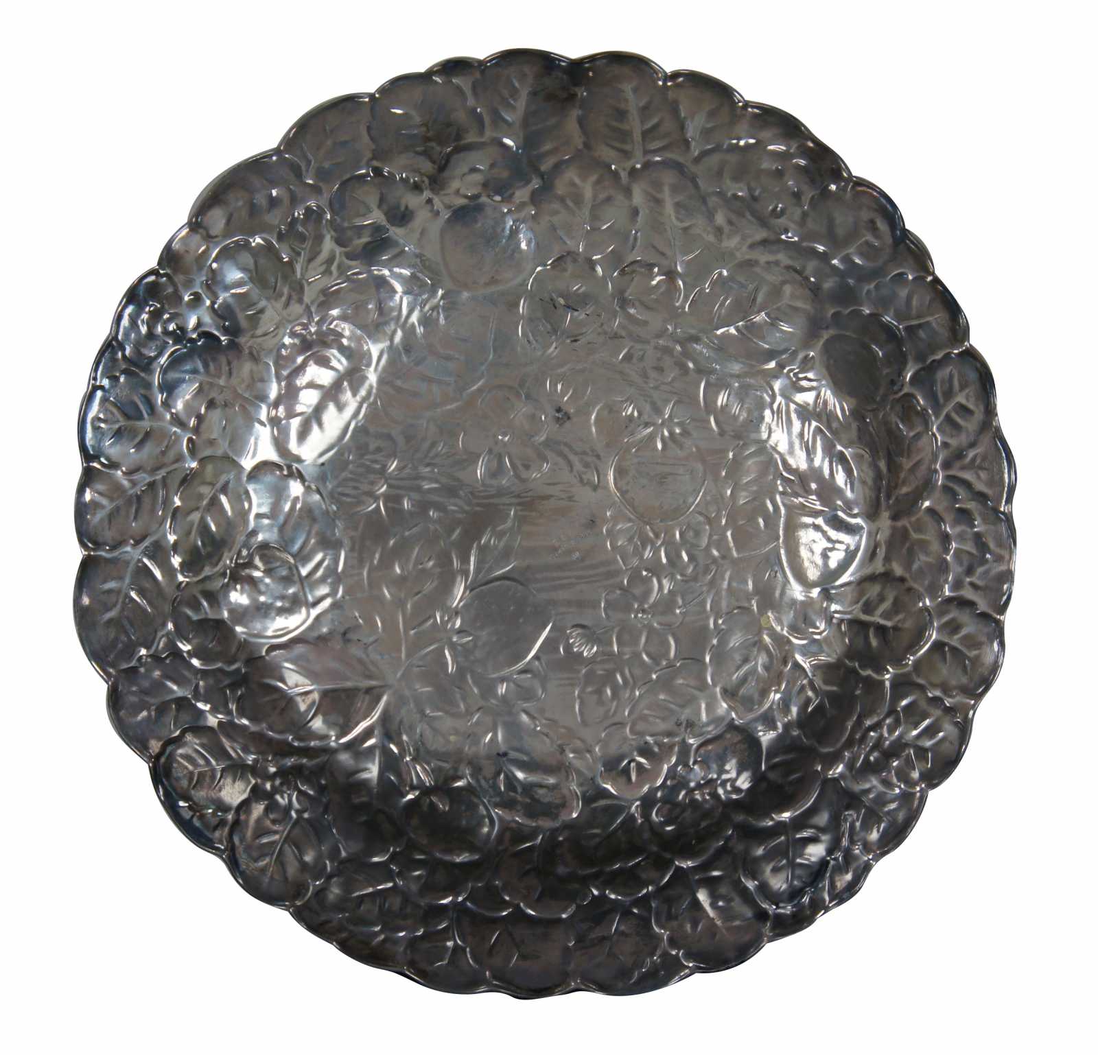 Reed & Barton repousse silverplate hollowwware embossed fruit / strawberry patterned centerpiece, serving tray or charger.