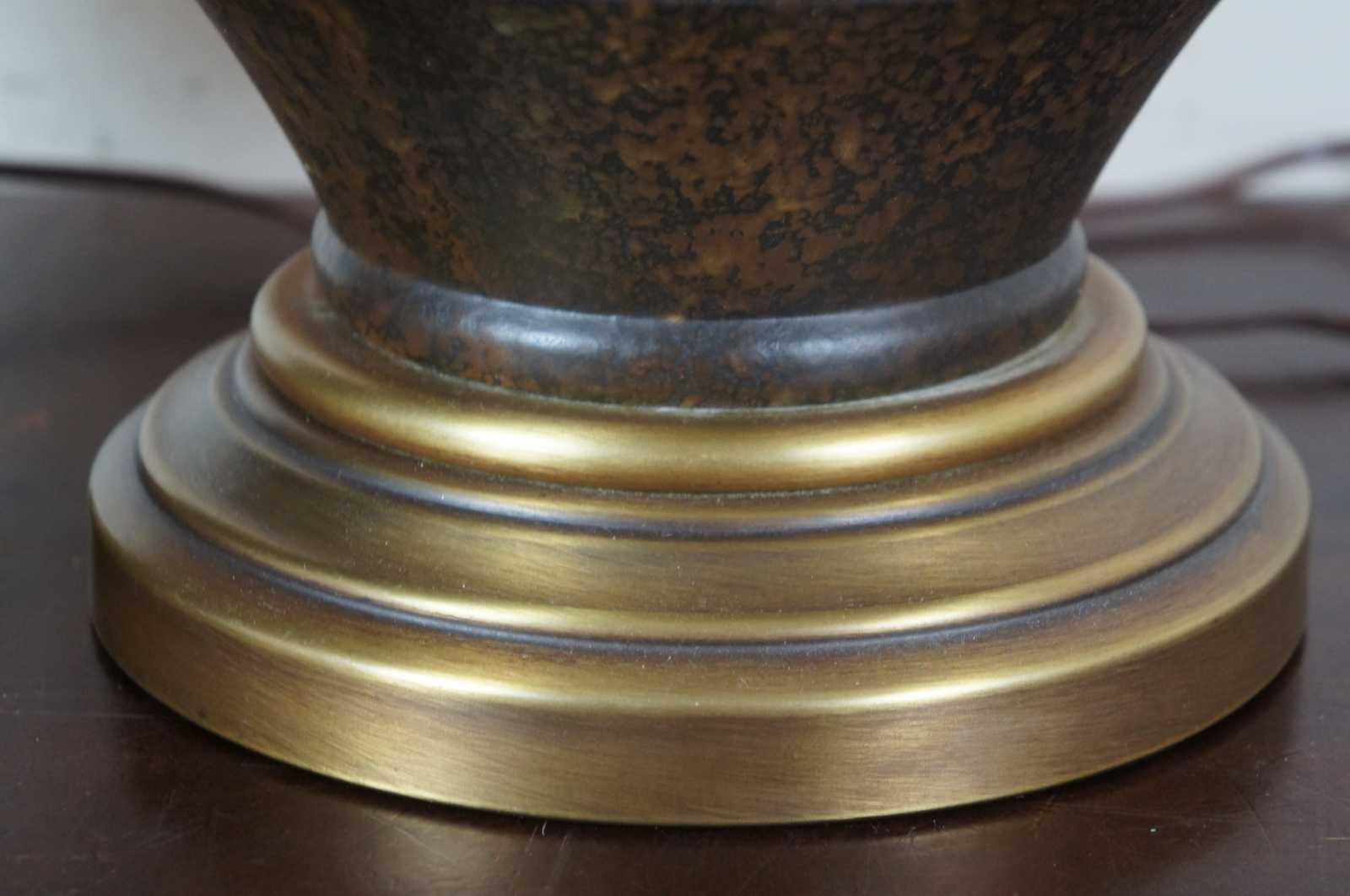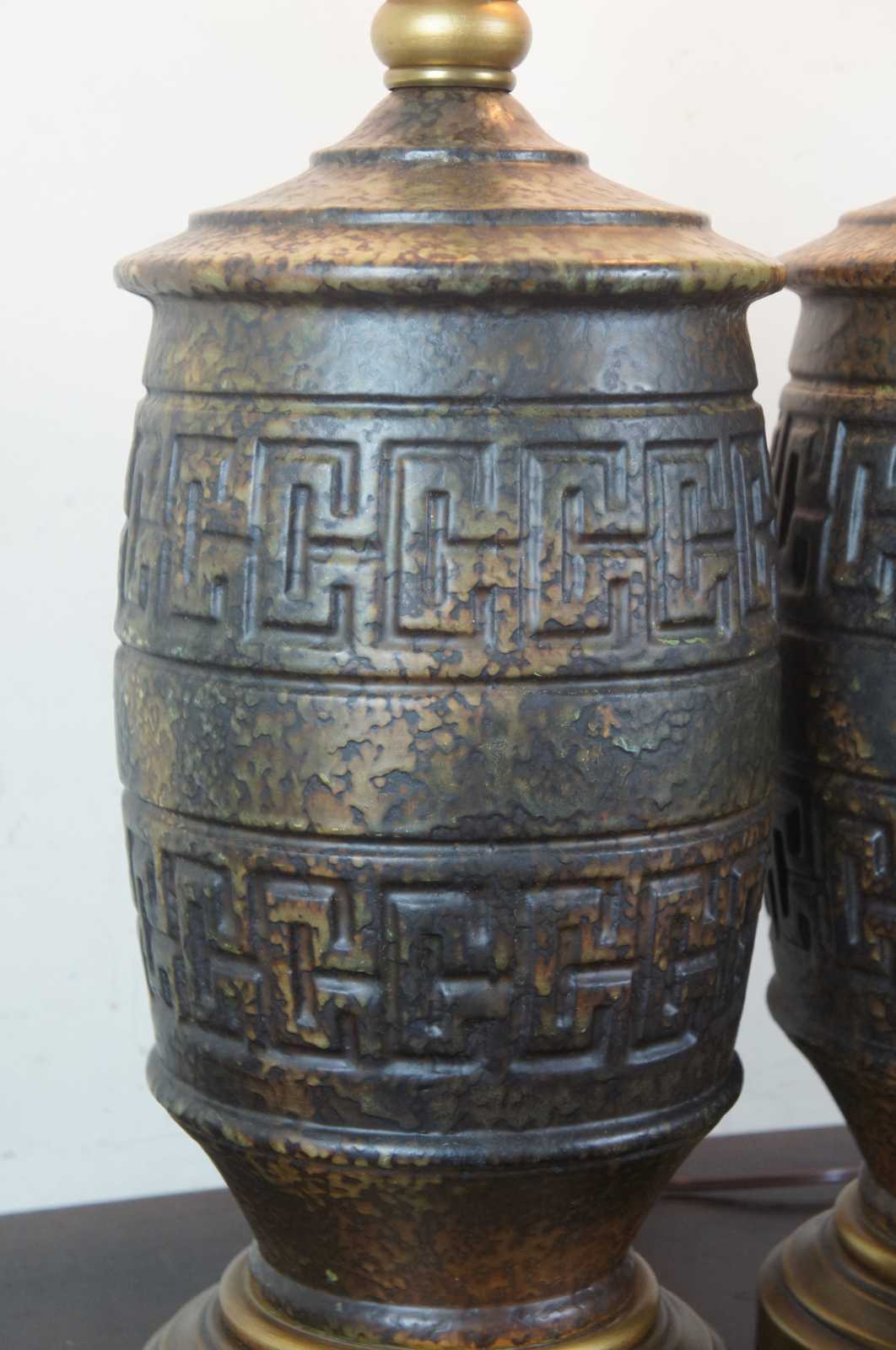 Two contemporary ceramic table lamps with a Greek key design, painted to look like bronze mottled with moss.