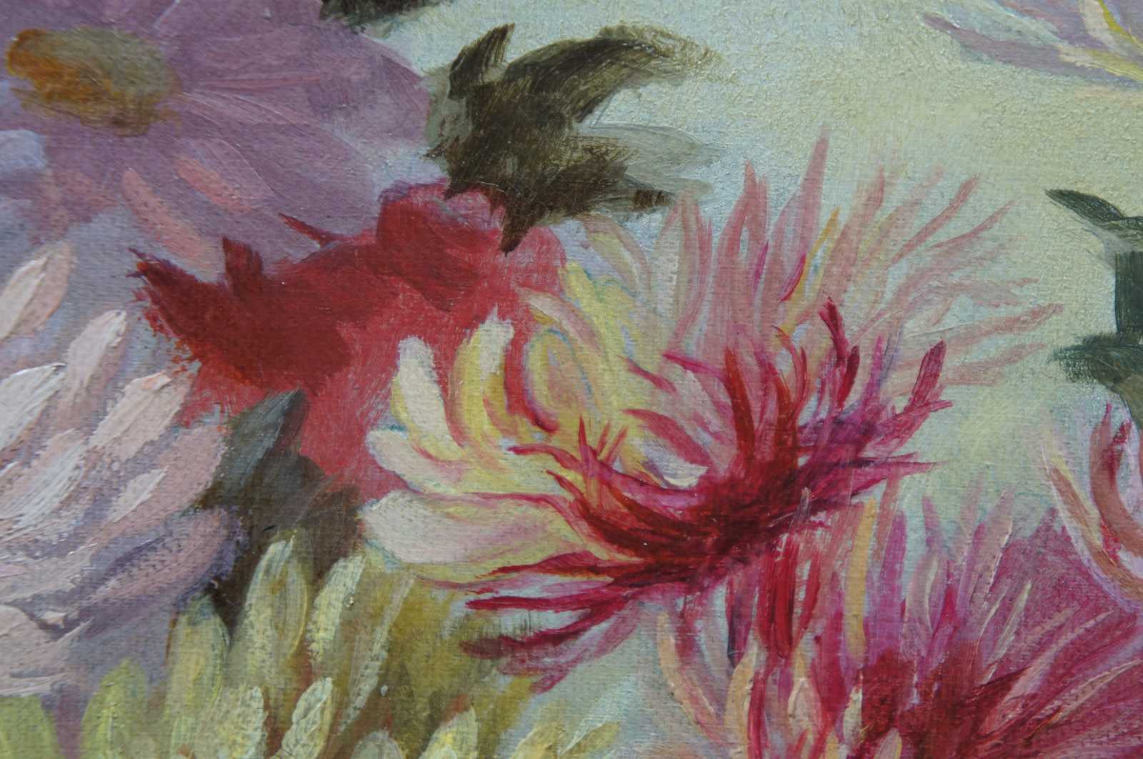 Late 19th / Early 20th century still life painting. Feautres a colorful array of peonies next to a blue porcelain vase. Includes an art deco era wooden frame finished in gold.