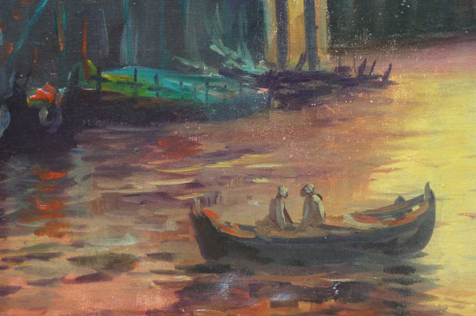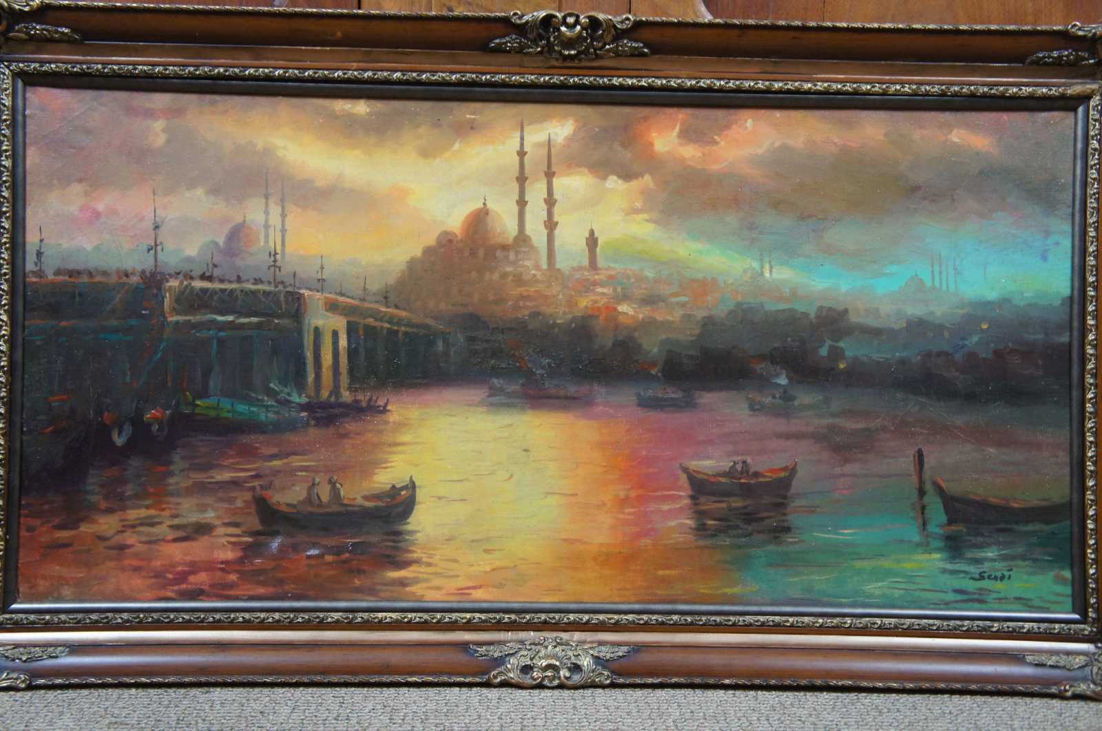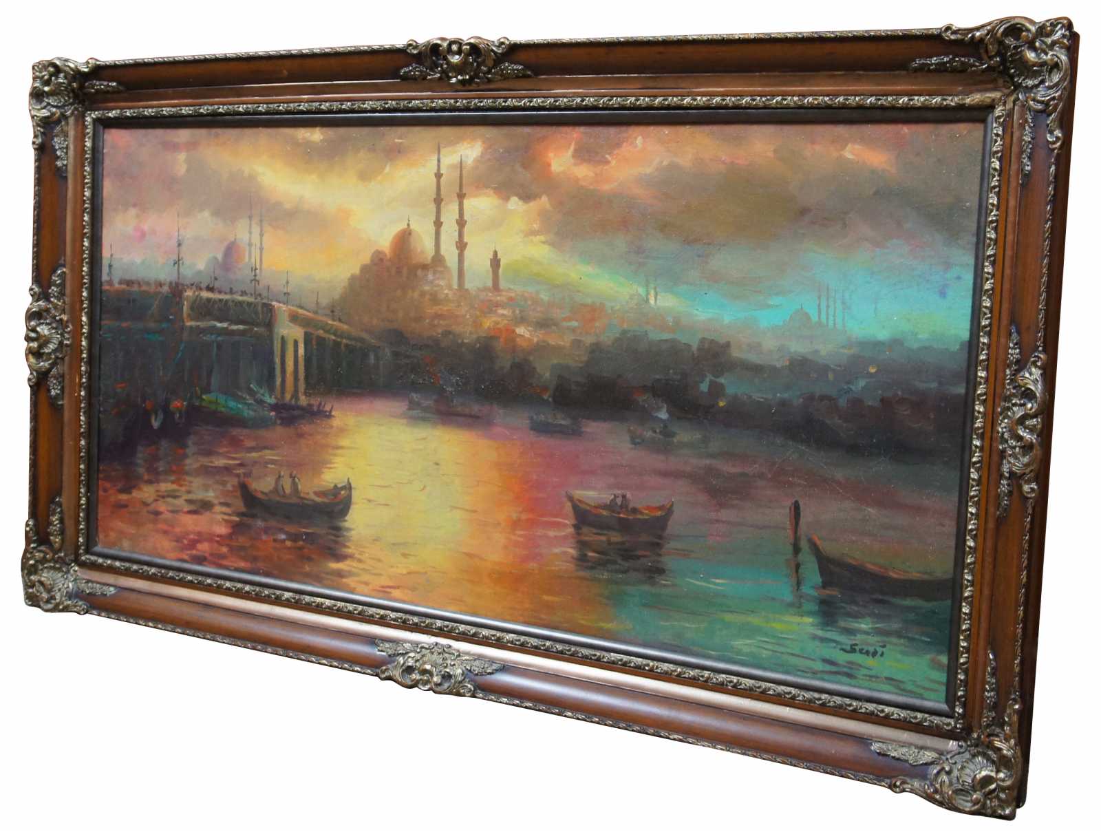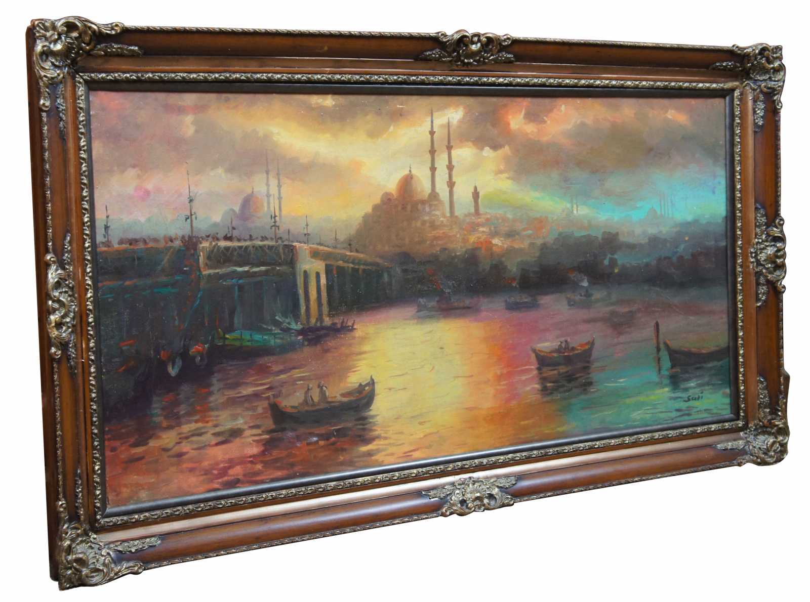 A colorful cityscape of Isfahan, Iran from the first half of the 20th century. A riverscape in the foreground leading up to the beautiful city and its mosques in the skyline. Features boats and sailers as the sun is setting. Signed lower right. Includes a Mahogany finished frame with baroque styling in gold.
