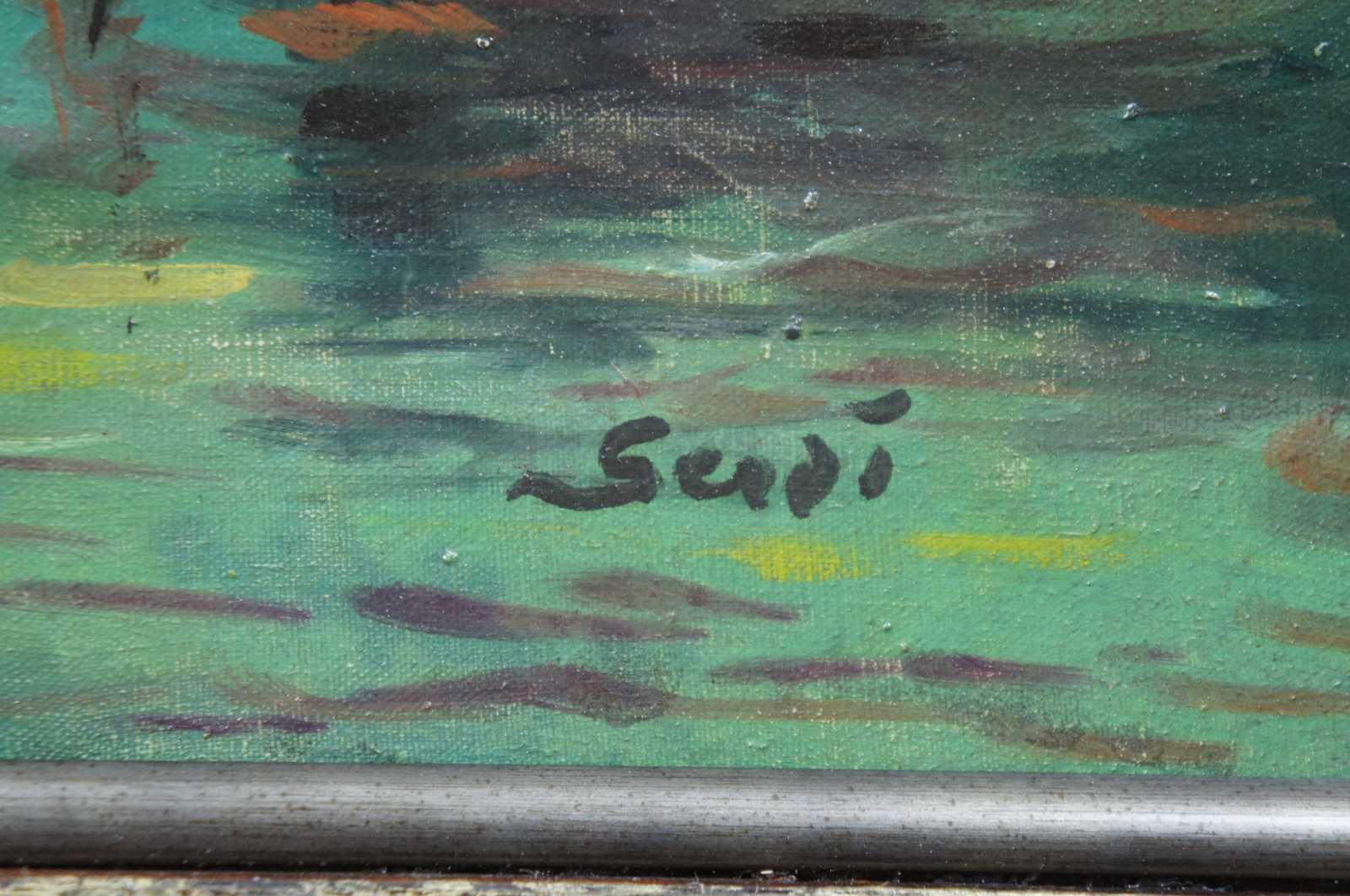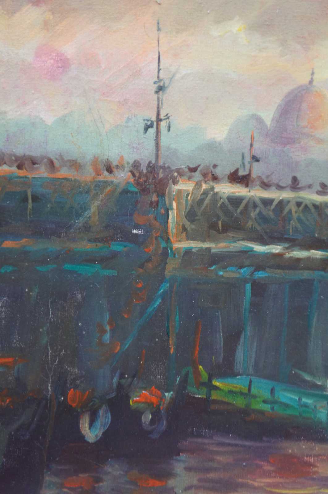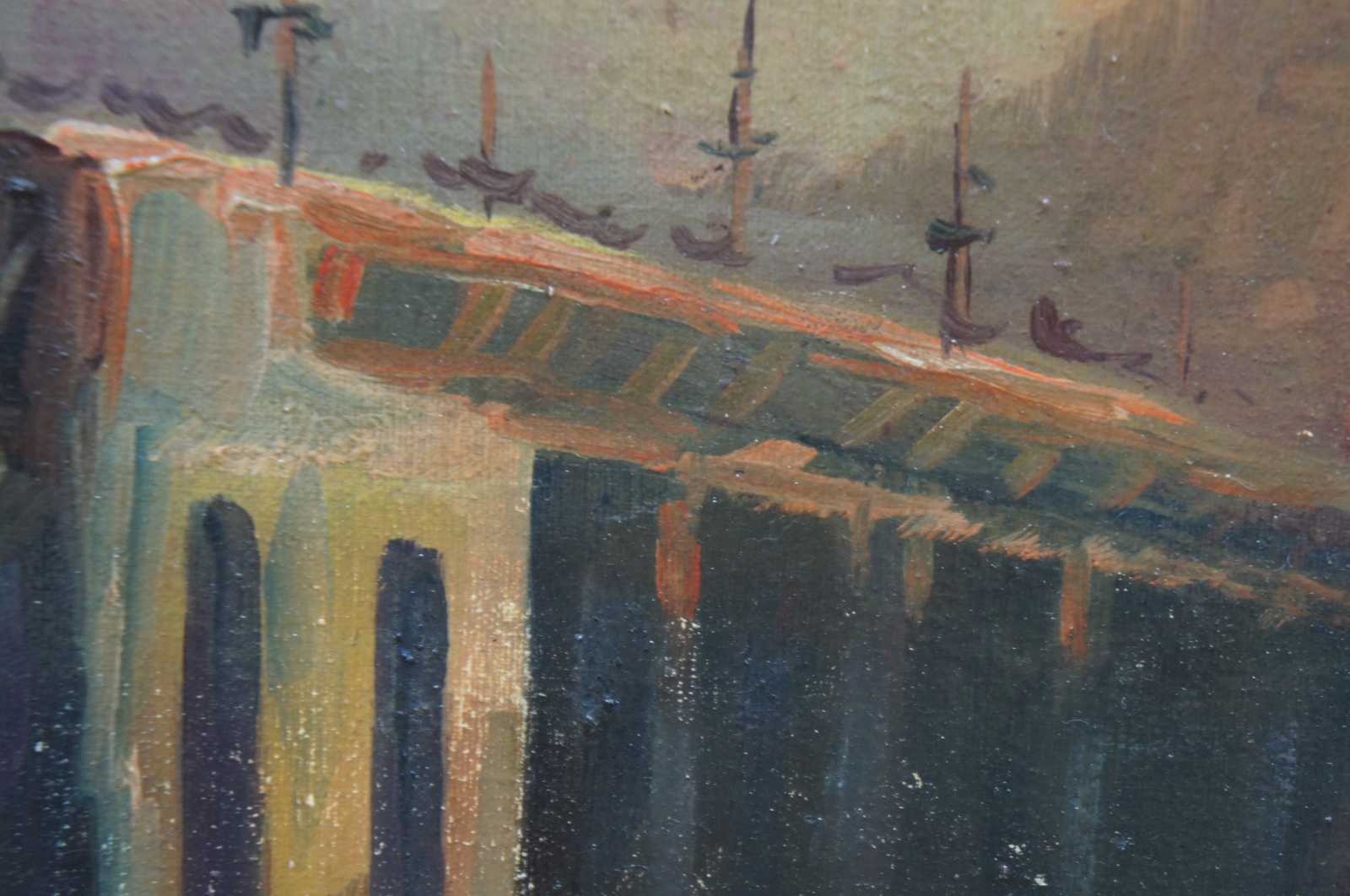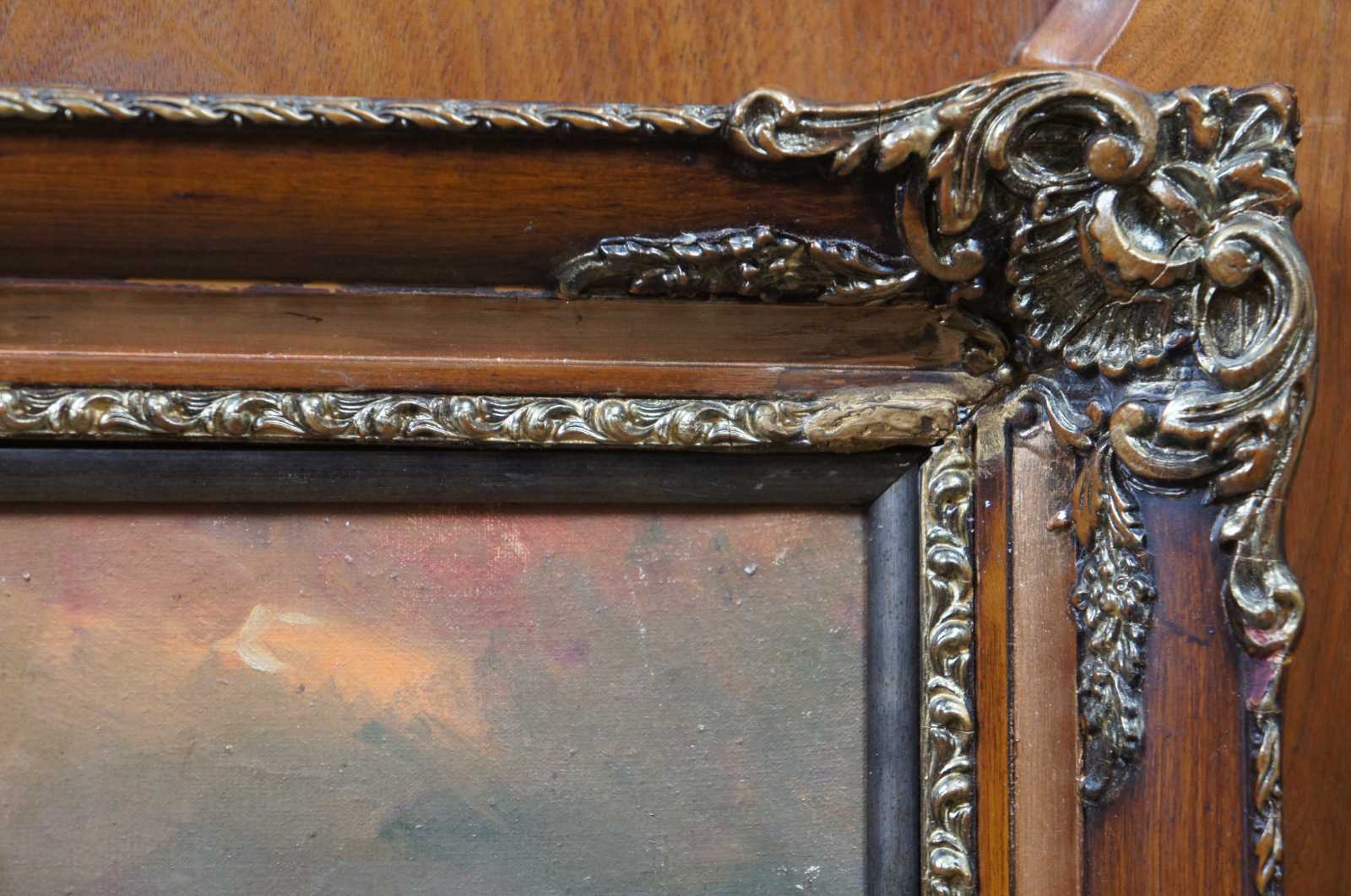 A colorful cityscape of Isfahan, Iran from the first half of the 20th century. A riverscape in the foreground leading up to the beautiful city and its mosques in the skyline. Features boats and sailers as the sun is setting. Signed lower right. Includes a Mahogany finished frame with baroque styling in gold.