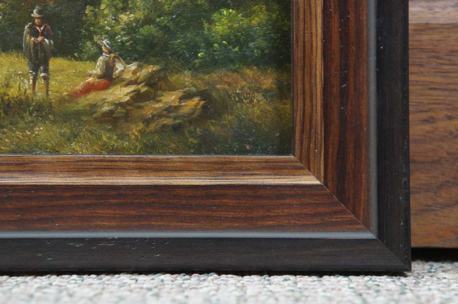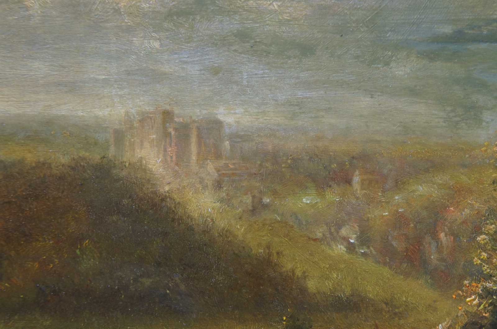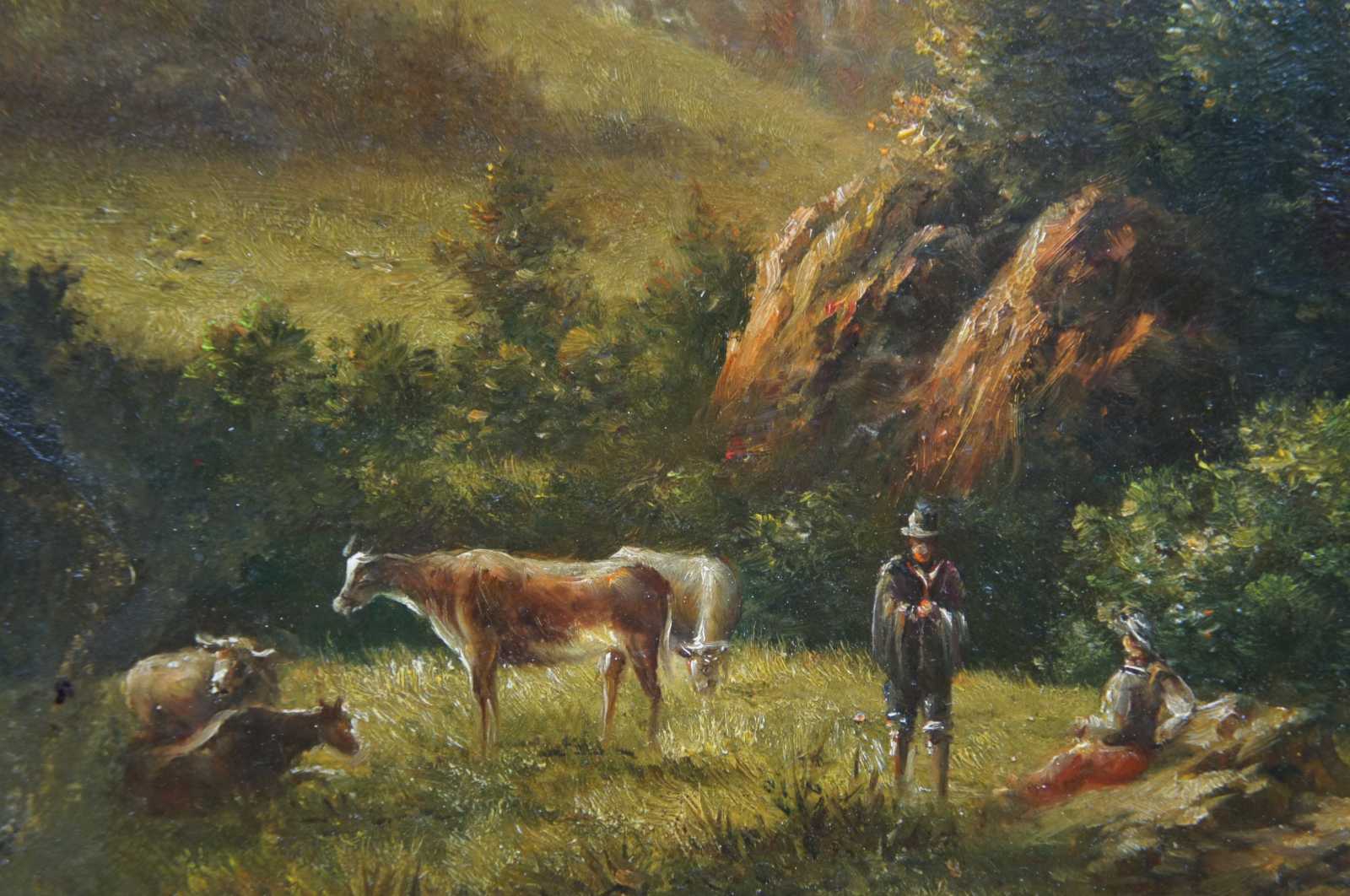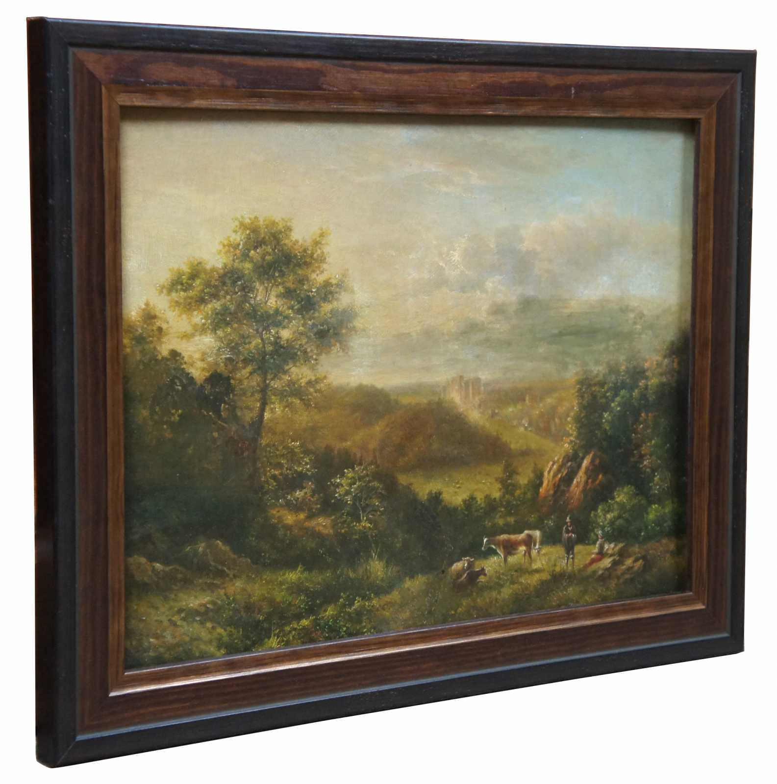A lovely antique European oil on board. Features two figures and cattle in a rural landscape with a castle or cheateau in the background.