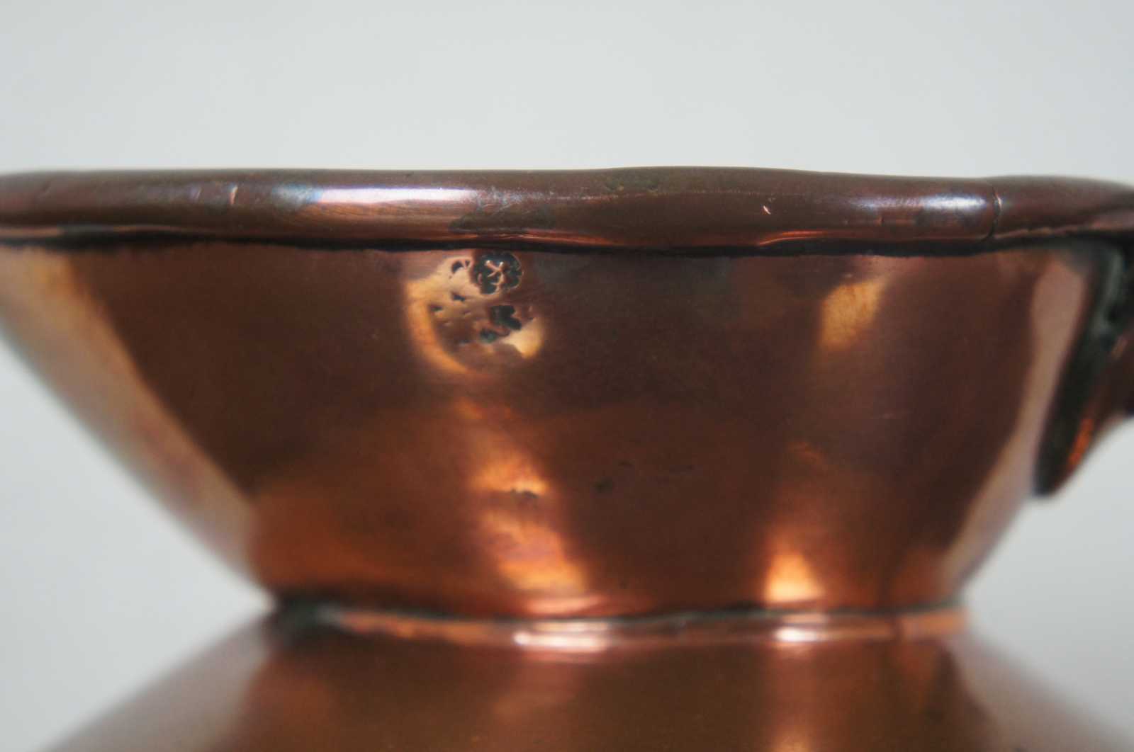 Antique English one gallon haystack dovetailed copper pitcher. Featurs a round design with pronounced handle and footed base.