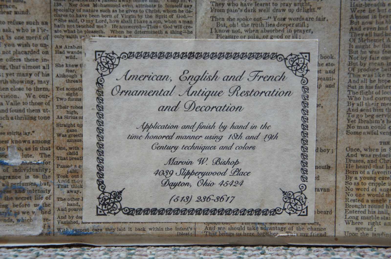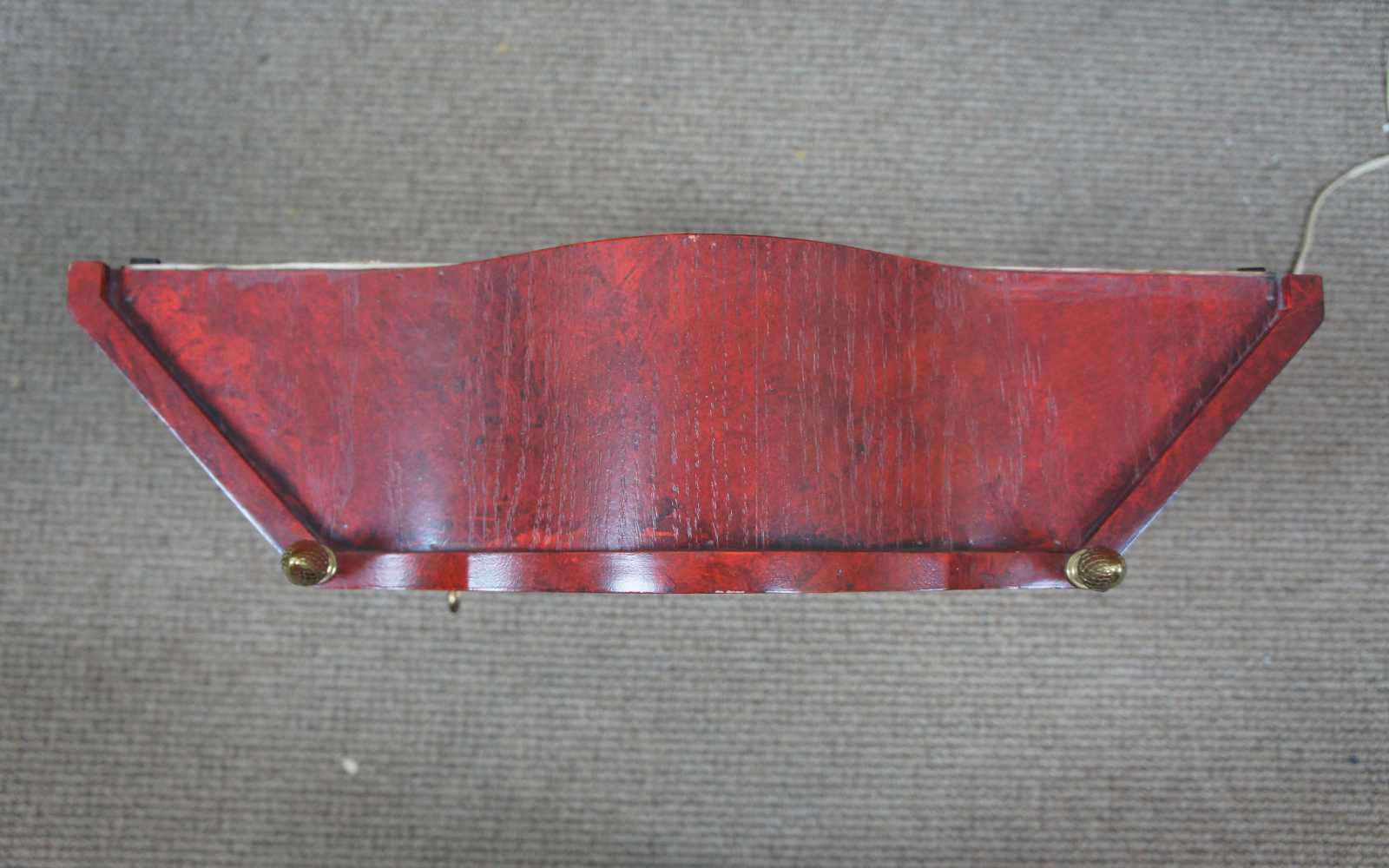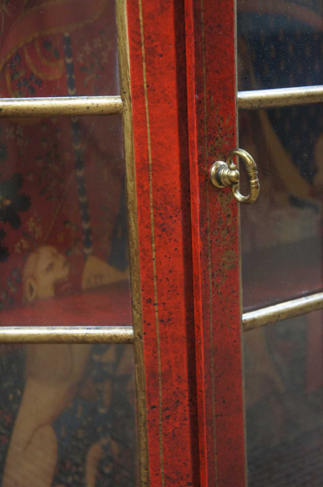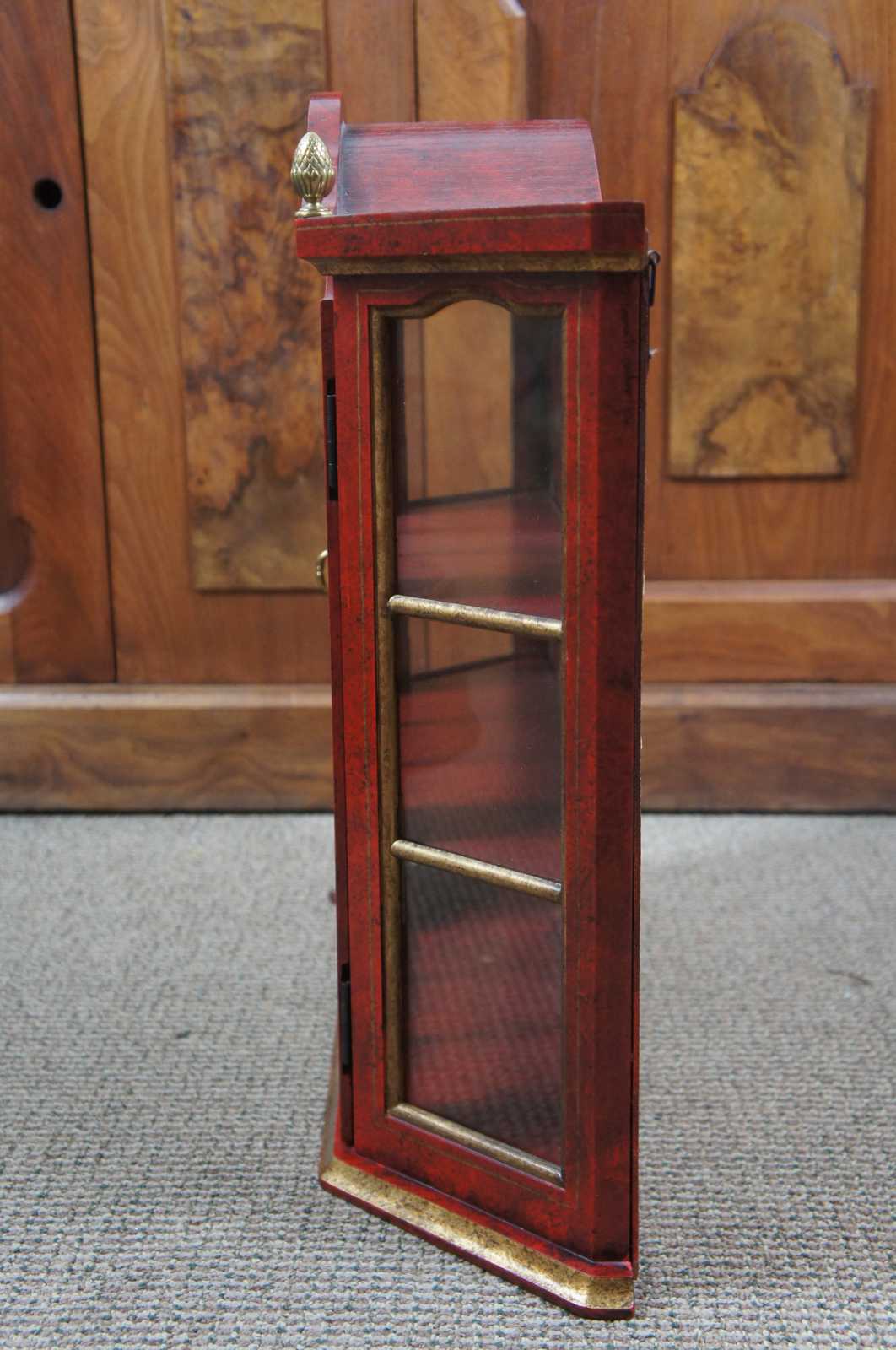 Vintage circa 1970s. wall curio cabinet or display case. Features traditional styling with red and gold distressed paint, glass paneled door and acorn finials. Interior is lined with a Heraldic or Victorian scene.