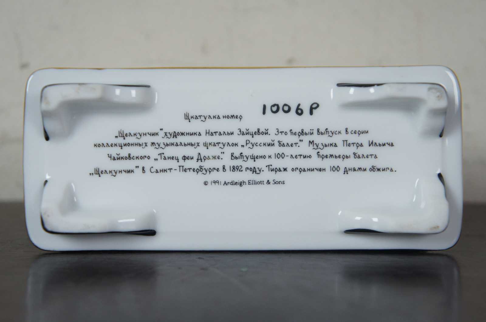Numbered Ardleigh Elliot & Sons porcelain music/trinket box, part of the first issue in the Russian Ballet Musical Artbox Collection. Plays “Dance of the Sugar Plum Fairy” from “The Nutcracker.”