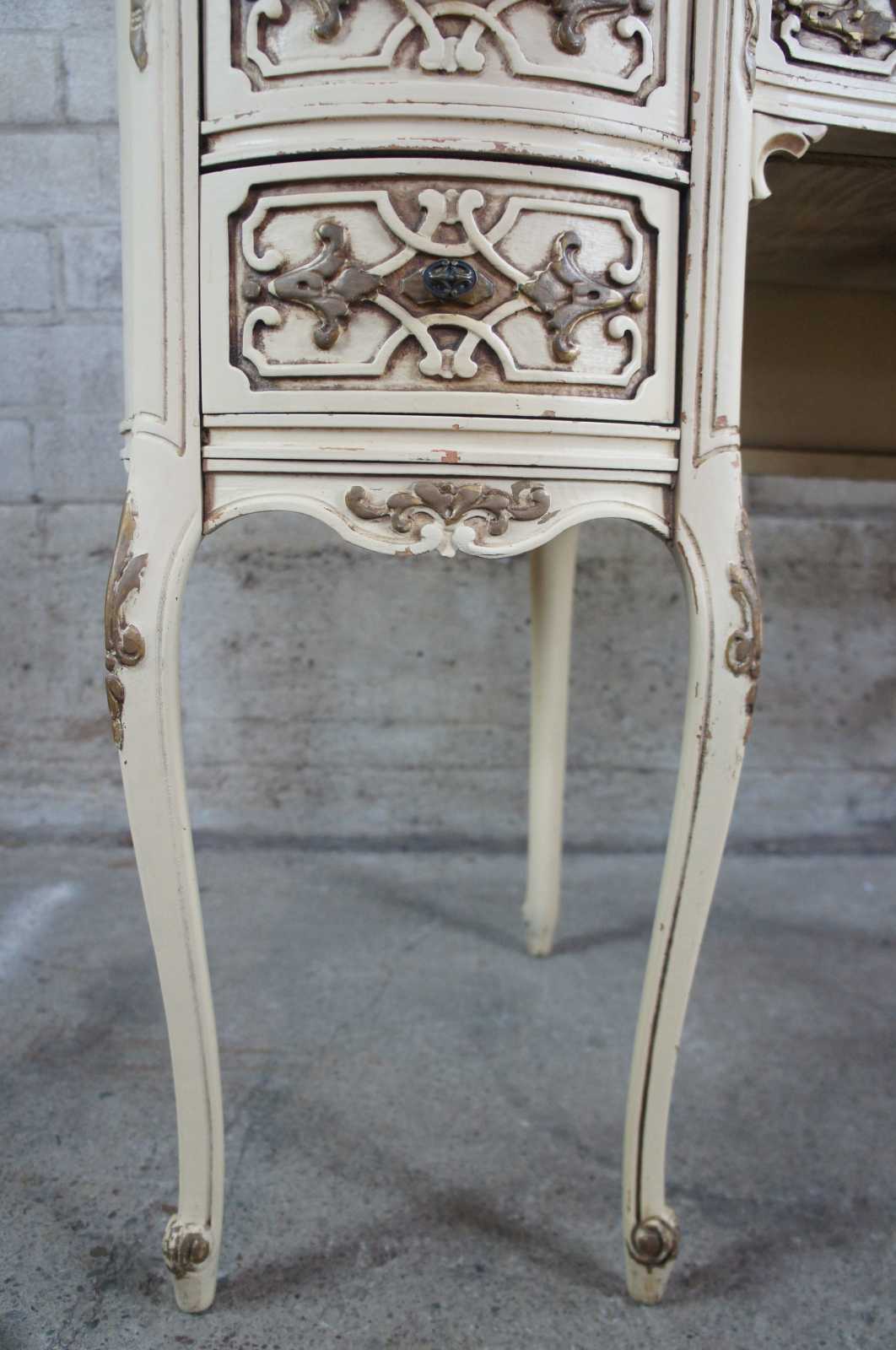 Early 20th century French Provincial writing desk and chiar. Finished in white and gold with a natural walnut top. Features Louis XV carvings, long cabriole legs and ornate details throughout.