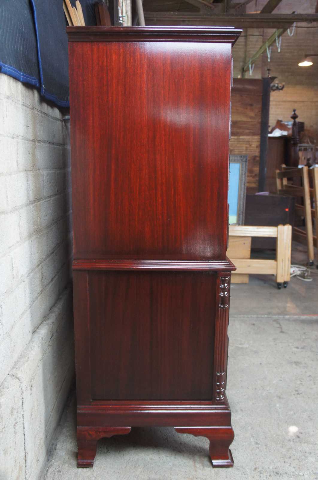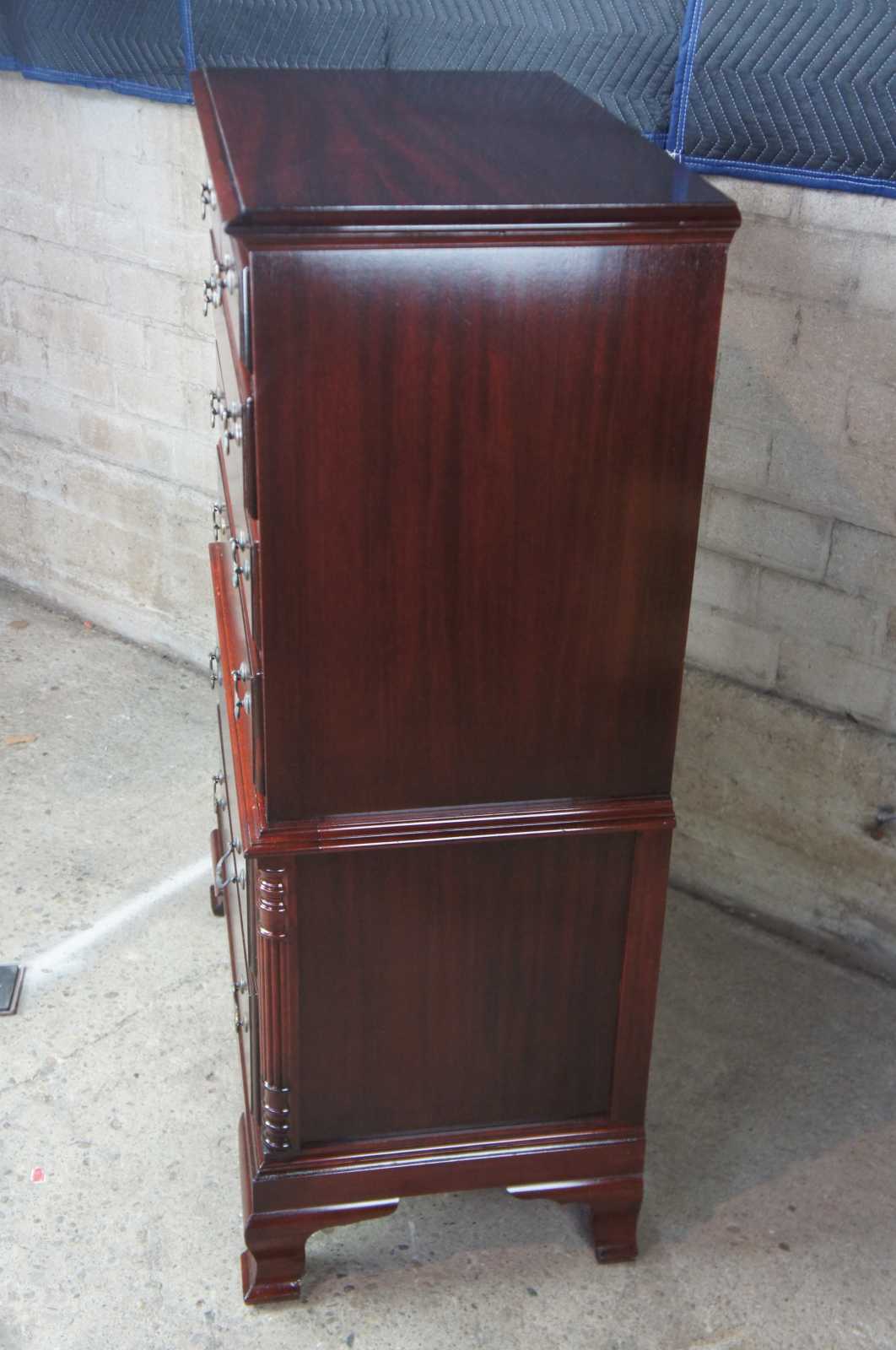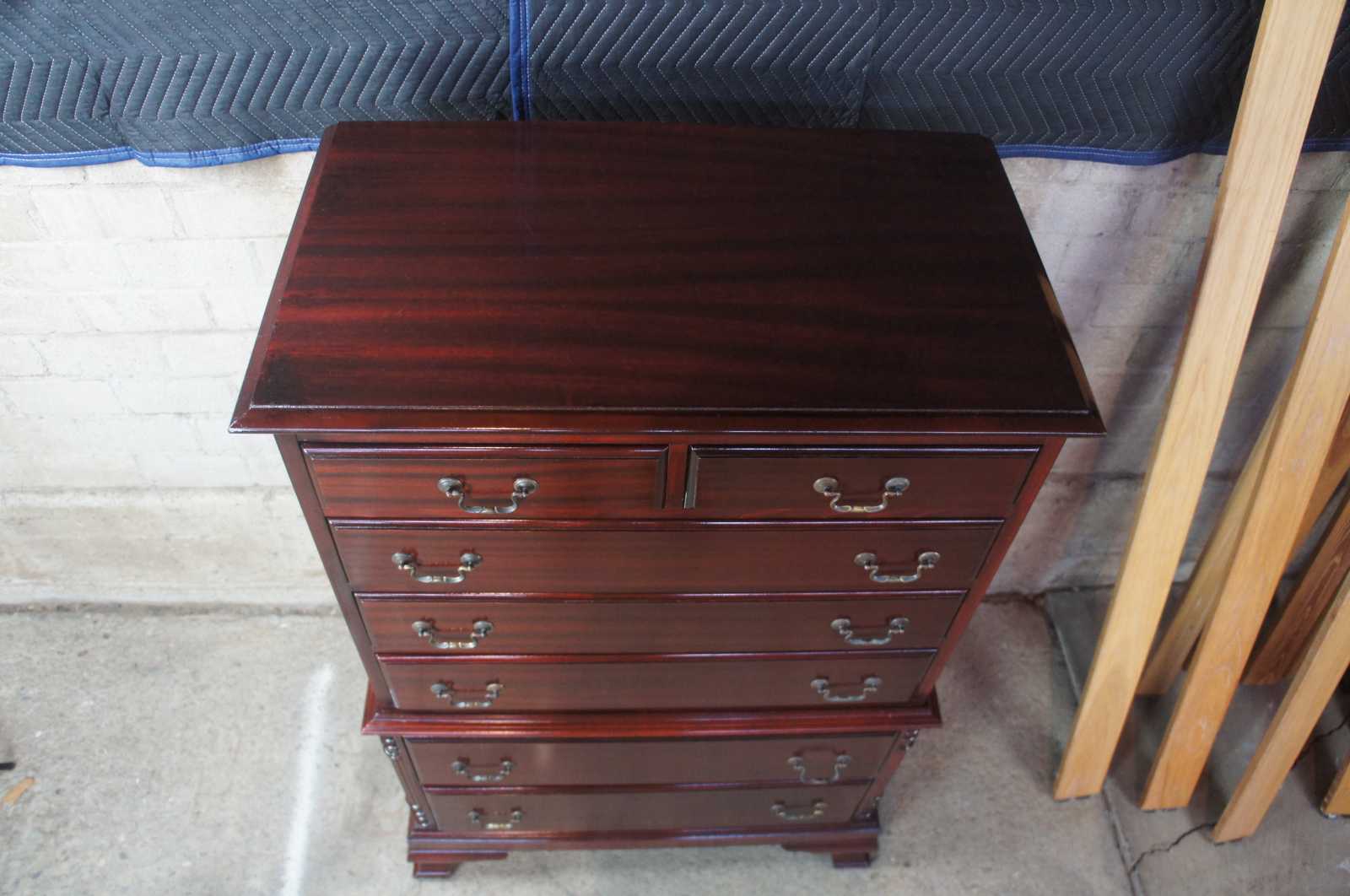 Circa 1970s mahogany highboy / chest on chest dresser. Features seven drawers , half turned and carved ballisters at corners, bracket feet and brass hardware. Sold by Rikes Furniture.