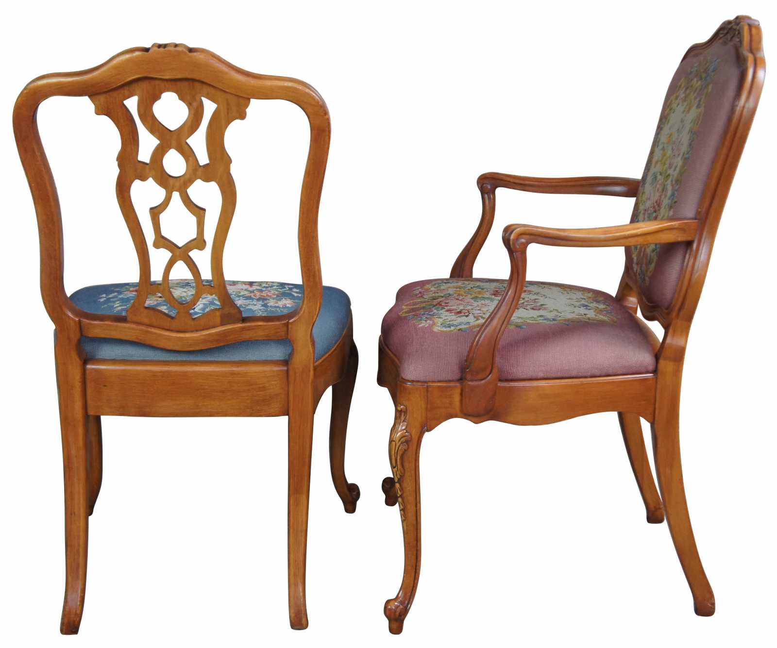 Circa 1940s Mount Airy needlepoint dining chairs. Made from walnut with open pierced splat, carved accents, cabriole legs and needlepoint seats. Mount Airy of North Carolina's roots go back to 1888 when the lumber and woodworking industry was booming. They had three large factories and quickly evolved into specialized furniture suites. They enjoyed a successful run until 1997 when a fire completely destroyed their facilities.