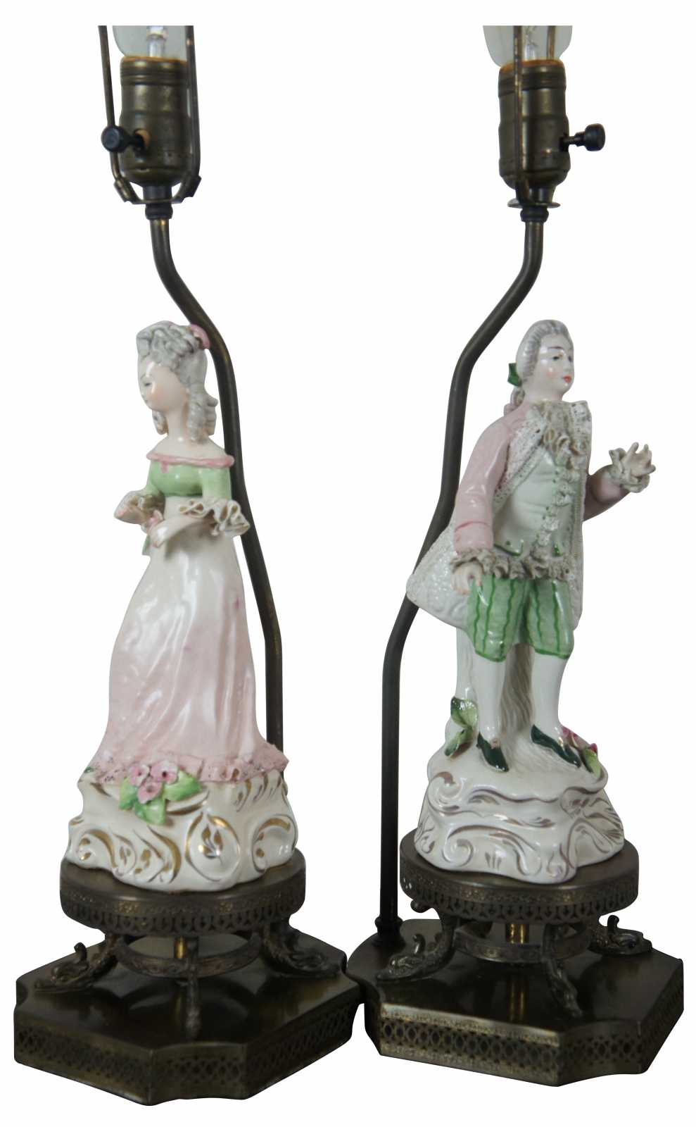 Pair of 20th century porcelain man and woman figurine lamps. Each is neatly placed on a brass stand, mounted by delphins (dolphins) over a reticulated base.