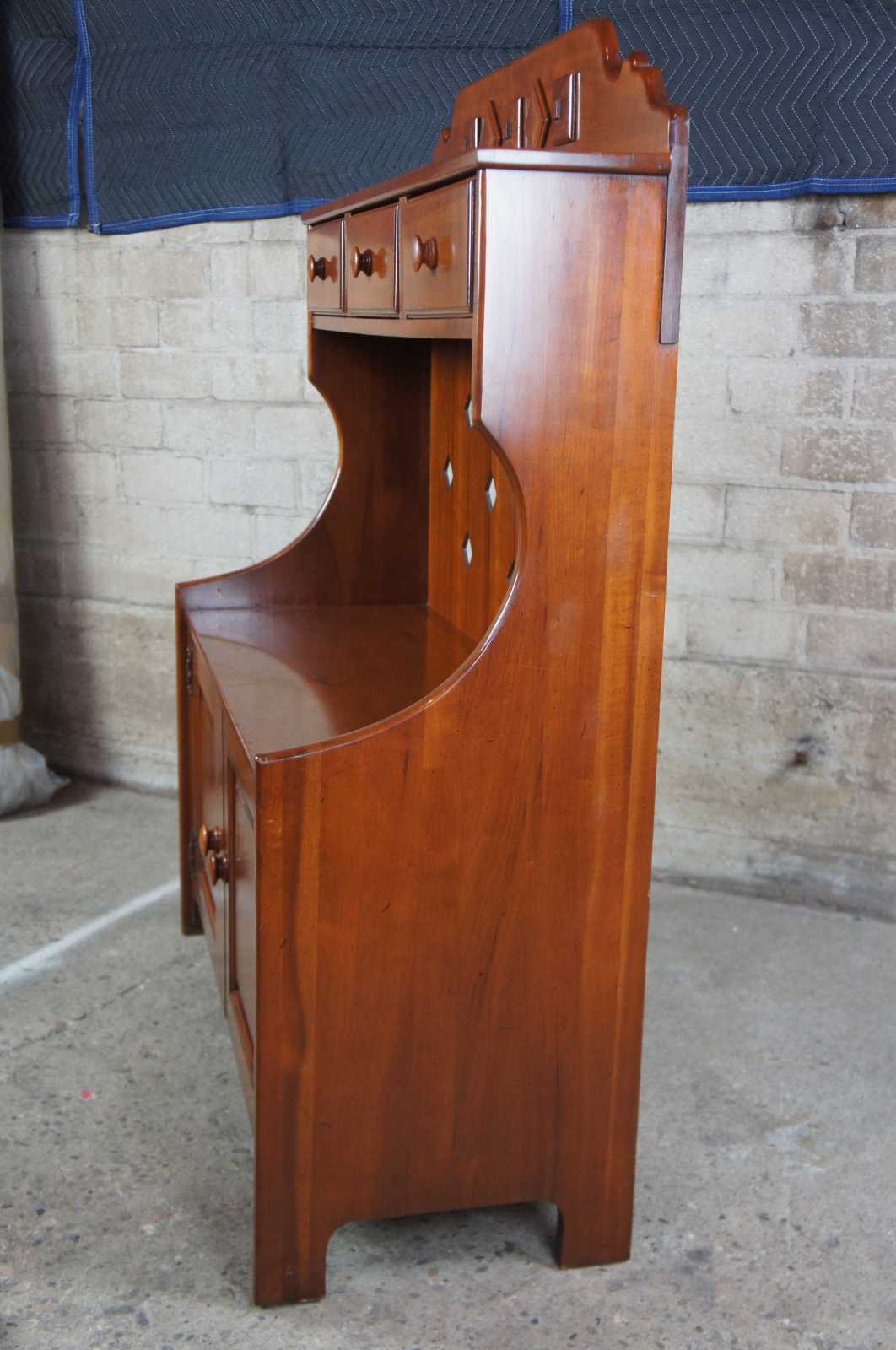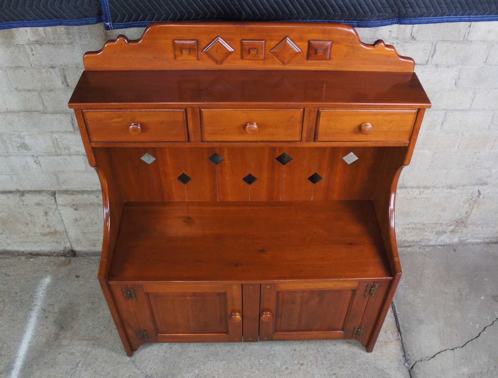 1959 Franklin Shockey hand burnished pine dry sink or bucket bench. Made from pine, with three drawers and lower cabinet. Features diamond cut outs along back and shaped carving on the upper back splash. Marked Franklin Shockey along the back, Lexington North Carolina.