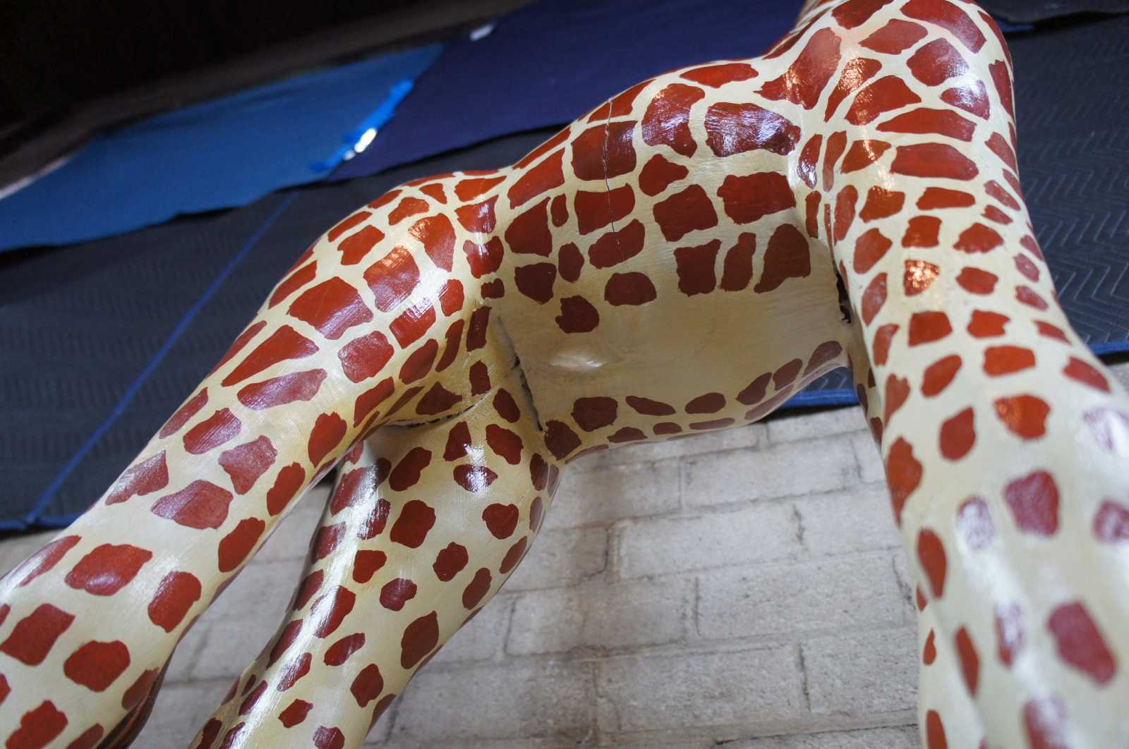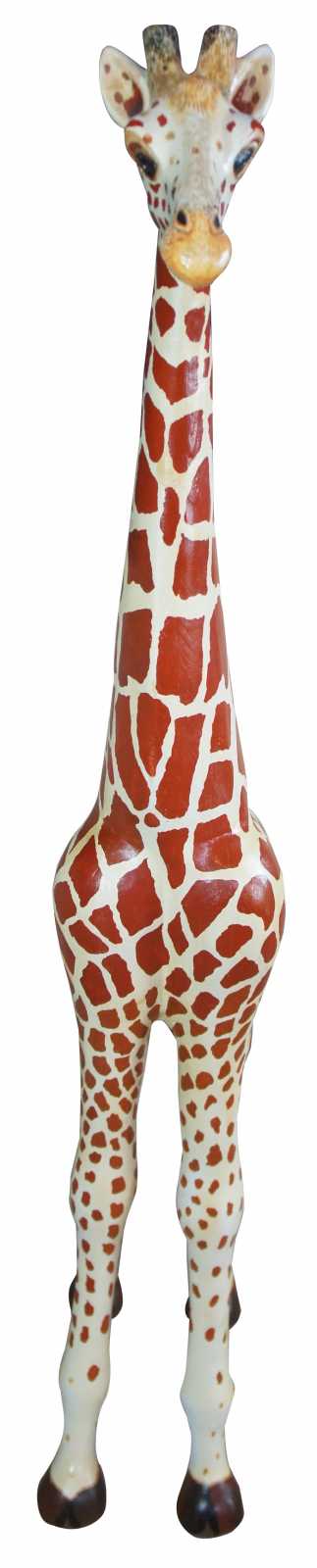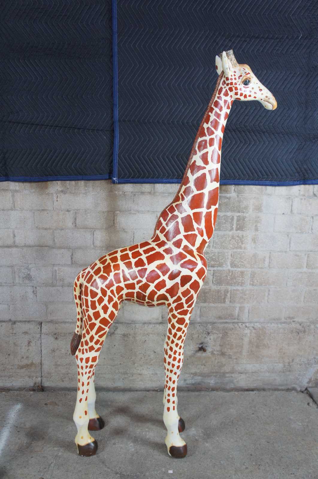 Hand made carved pine giraffe statue. Features a hand painted finish, stands the size of a large adult.
