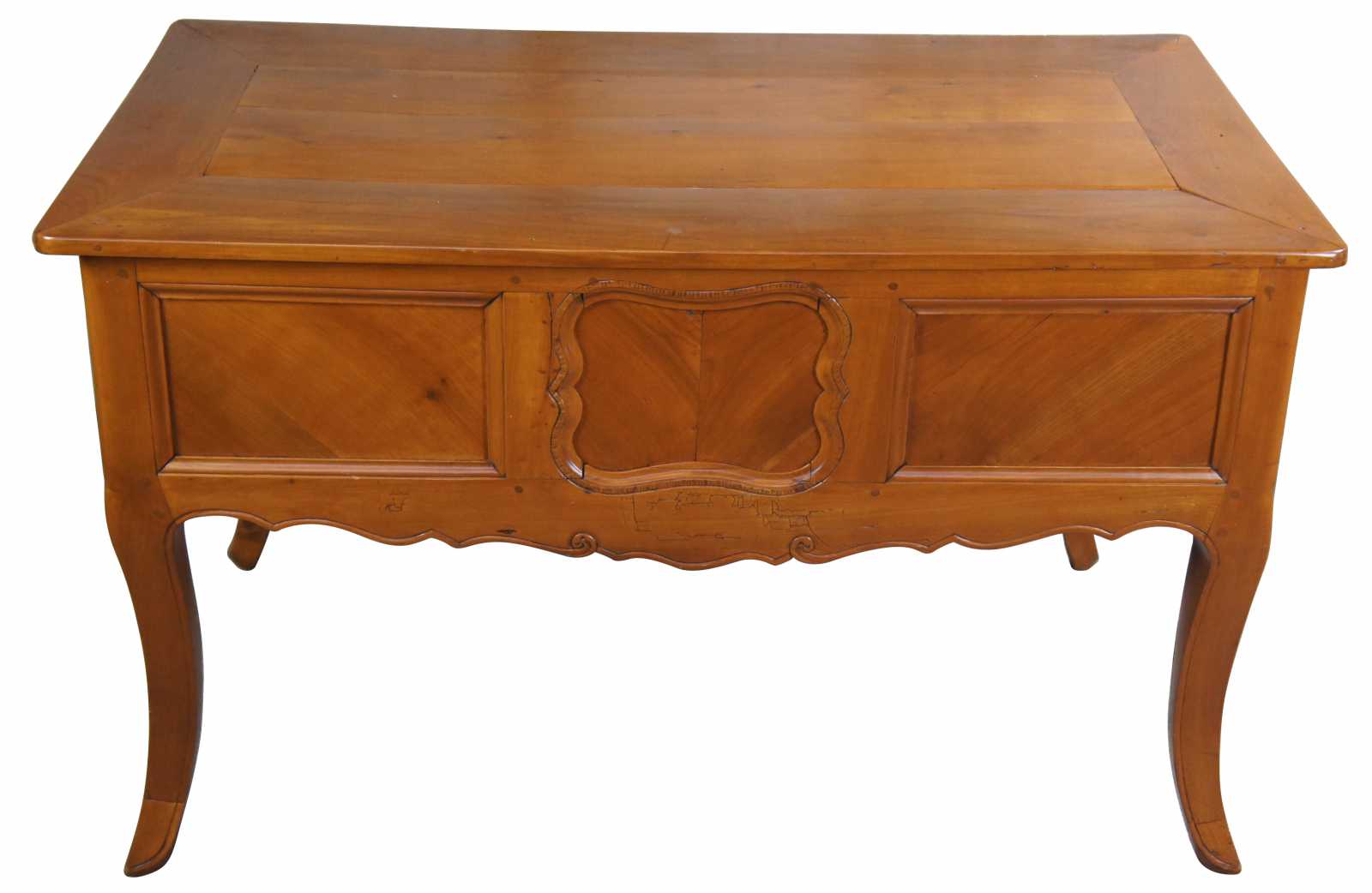 Late 18th century French fruitwood writing desk. Features two drawers, brass hardware, scrolled aprons, and cabriole legs.
