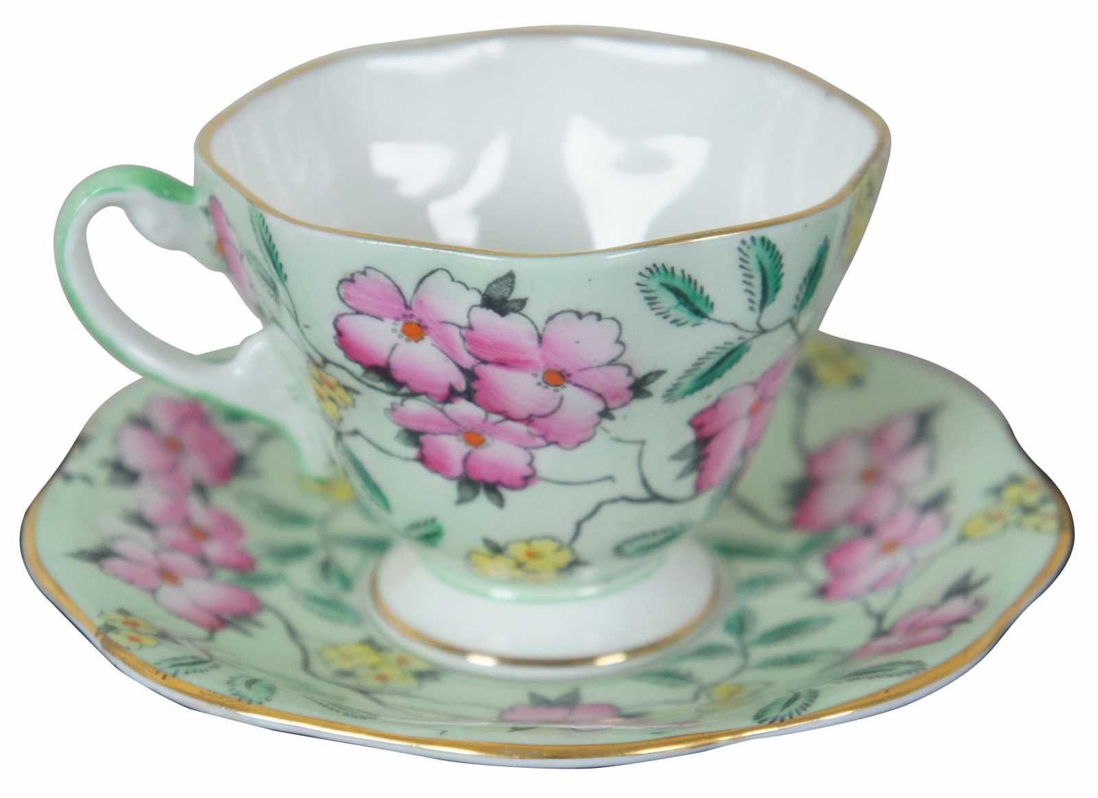 Bone china teacup and saucer by EB Foley; Springdale pattern featuring pink and yellow flowers.
