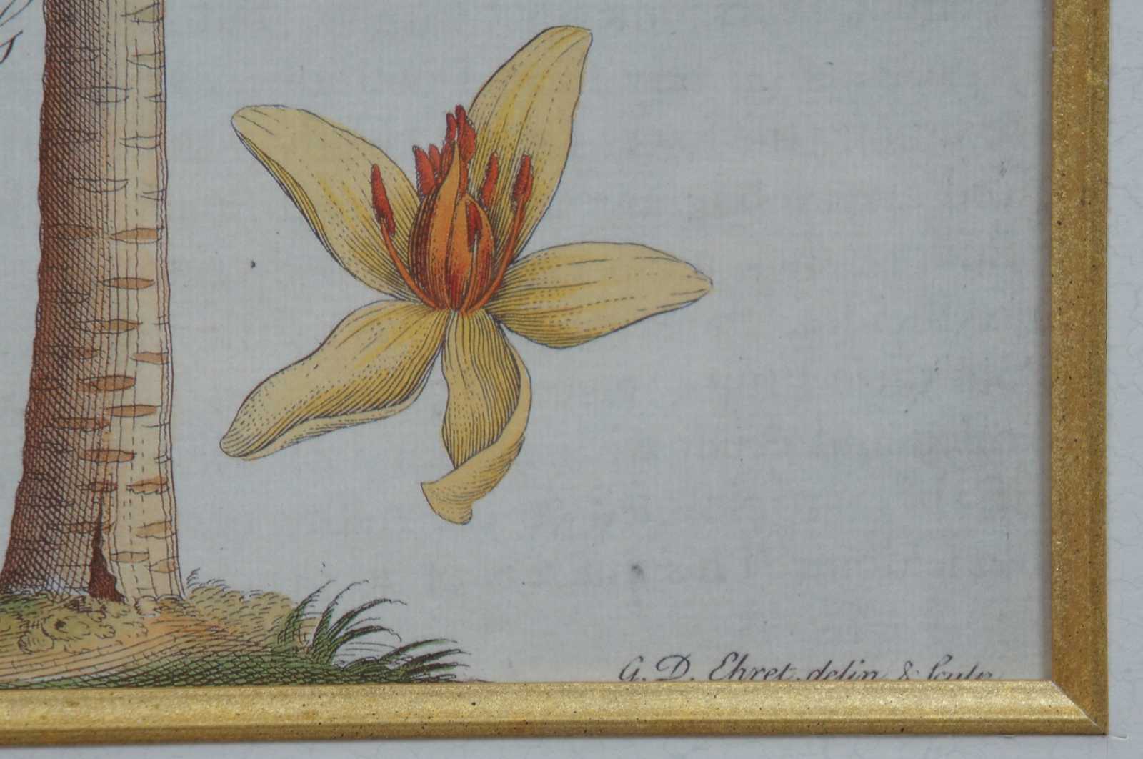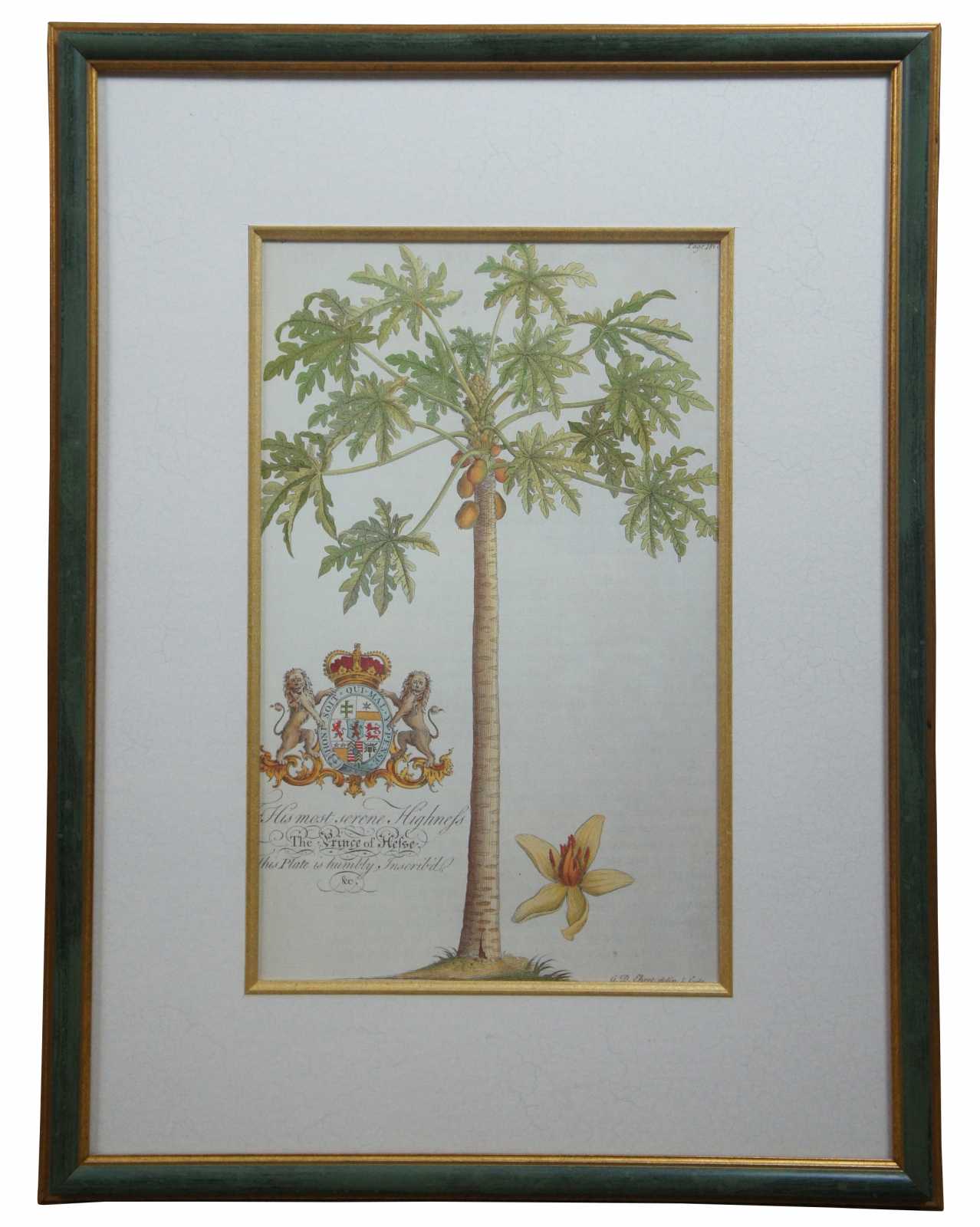 Two fantastic framed botanical prints stemming from Welsh botanist Griffith Hughes' [1707–1758) research publication "The Natural History of Barbados [pub. 1750]. The book captures Hughes' recorded observations of the natural botanical features of the island over a period of of several years. The illustrative prints are taken from illustrations done by famed German botanist, botanical illustrator and entomologist, George Dionysius Ehret (G.D. Ehret) and sculpted to plate by J. Mynde [1740-1770], sculptor. These are vintage (mid-20th century) lithographs derived from the plate printing process.