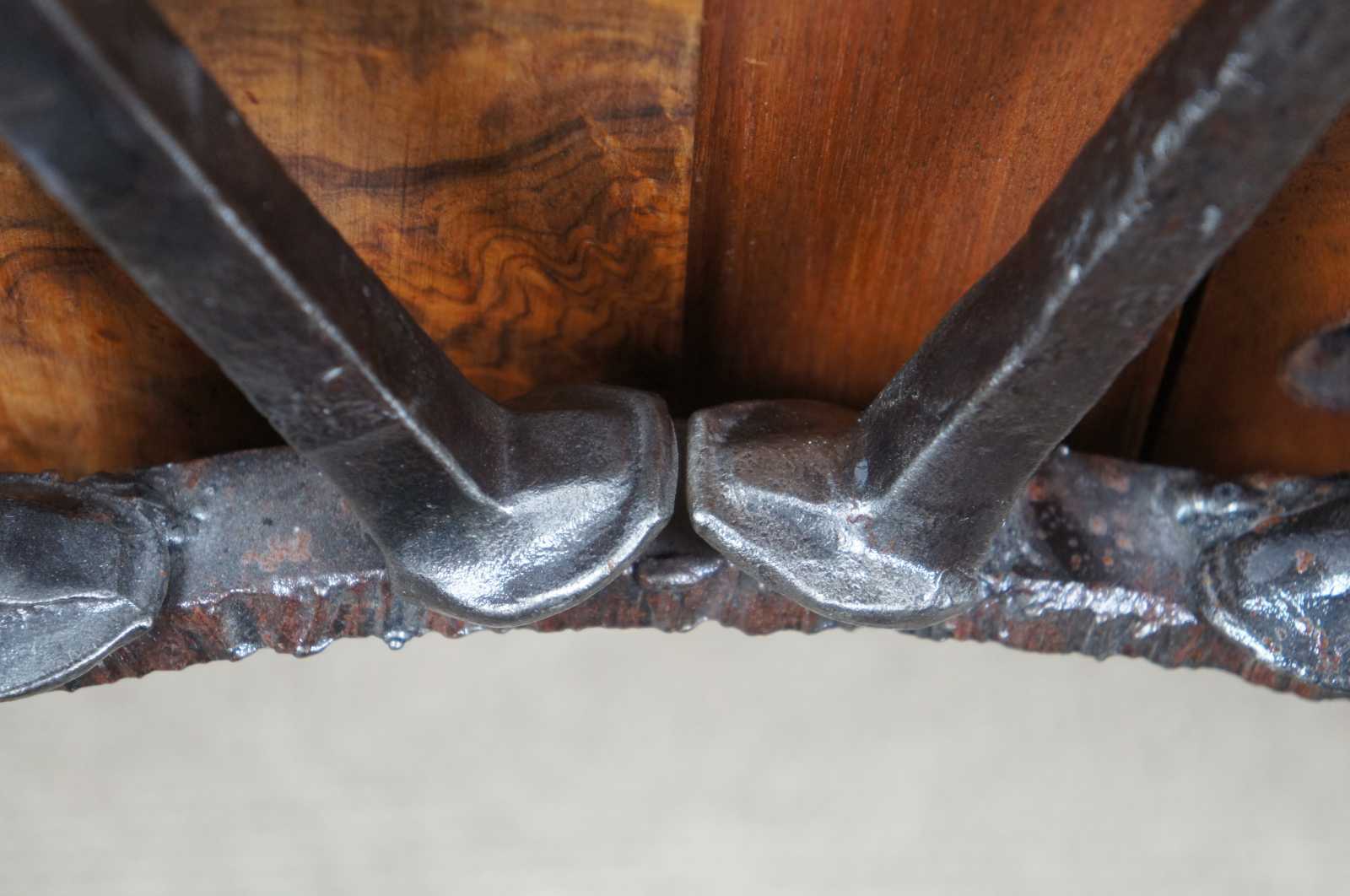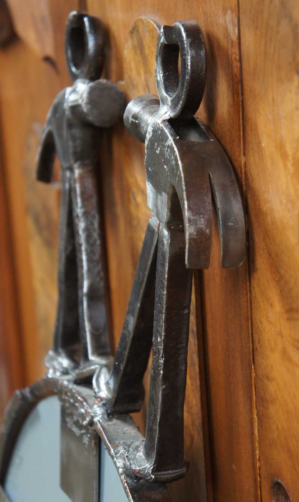 Circa 2004 industrial round iron mirror by Maser. Features welded men, made of hammers and railroad nails.