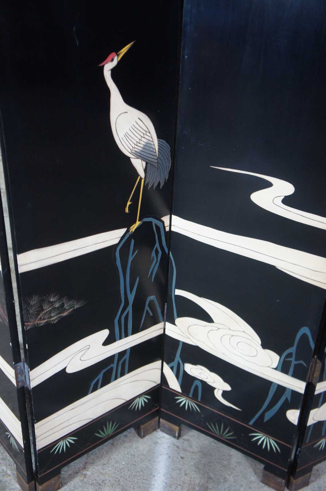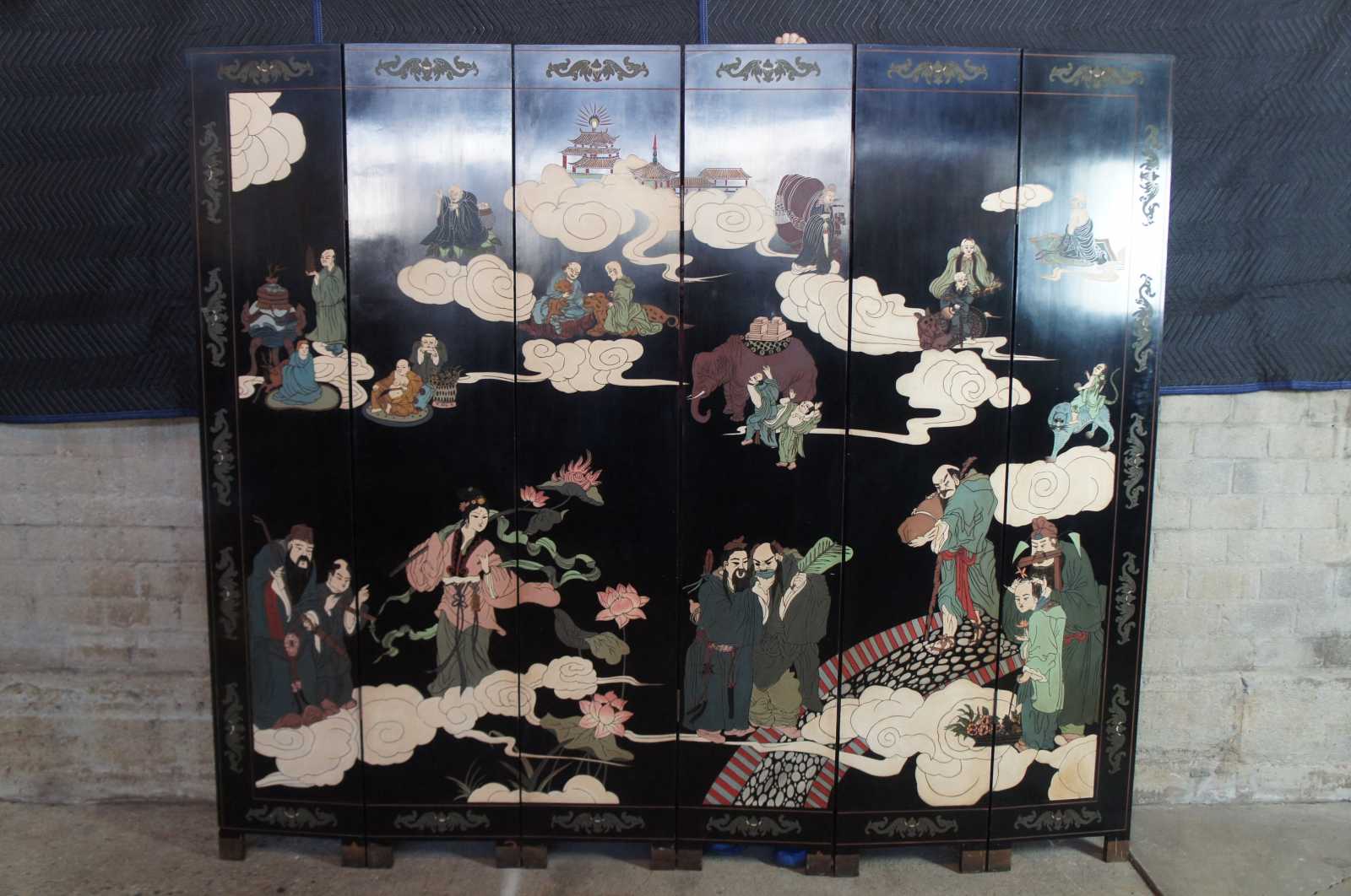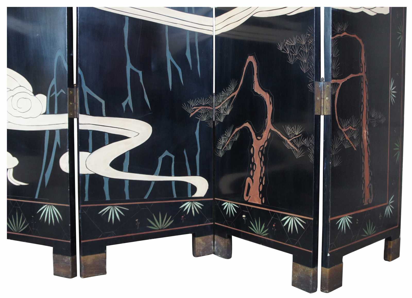 Mid 20th century monumental Coromandel black lacquer screen. Features two decorative designs; including cranes amist the treetops and clouds on one side; and along the other, gods or dieties in a field of clouds with animals, pagodas and other traditional details. Ornately carved with exceptional detail.