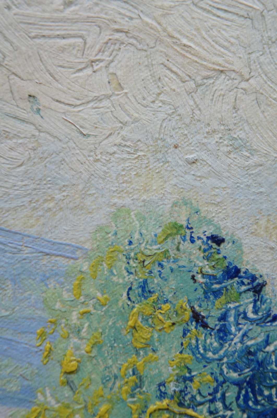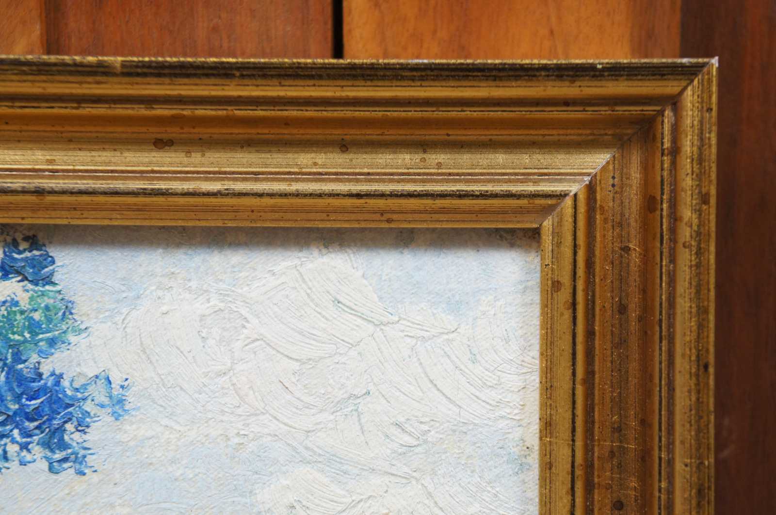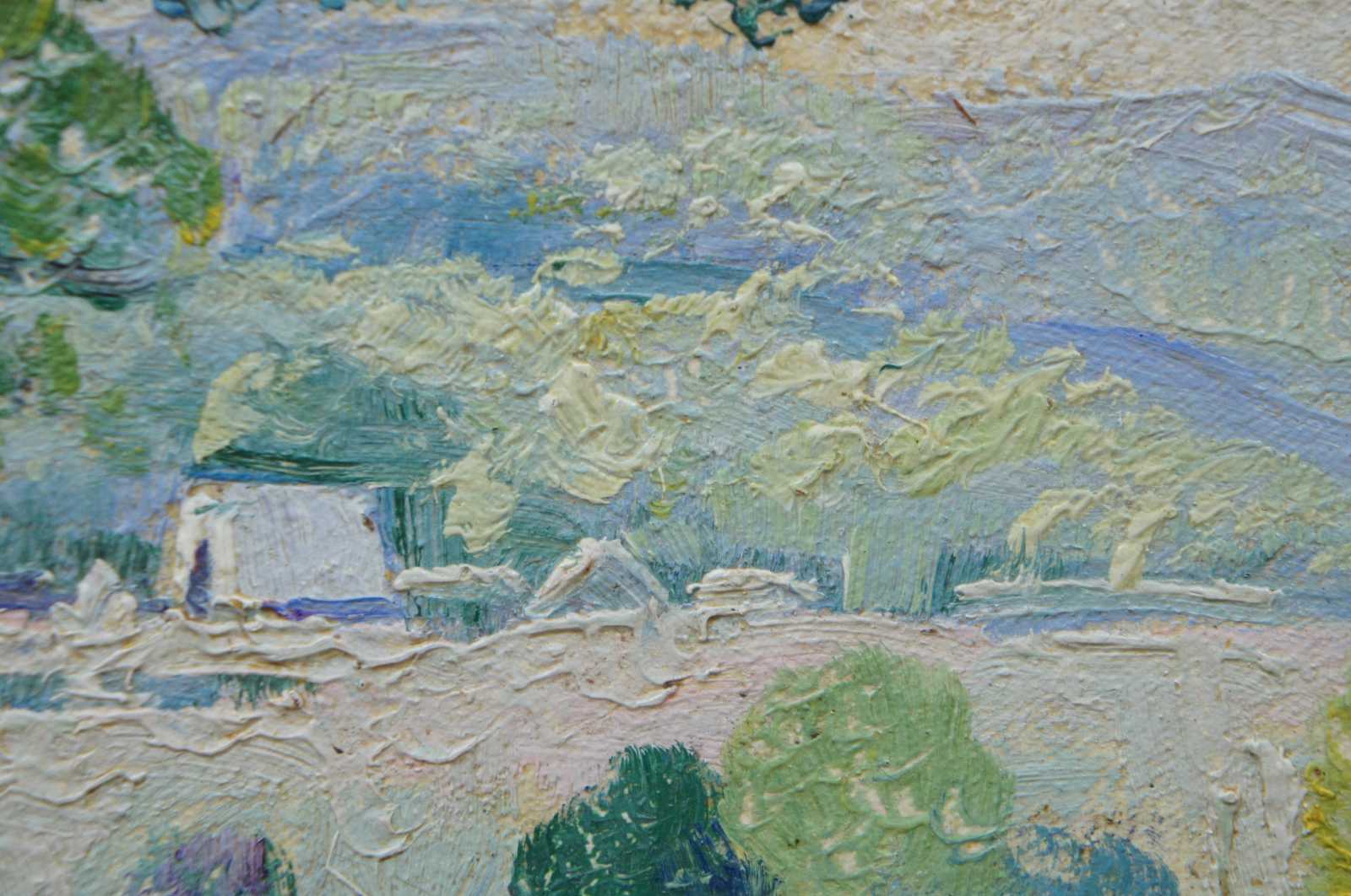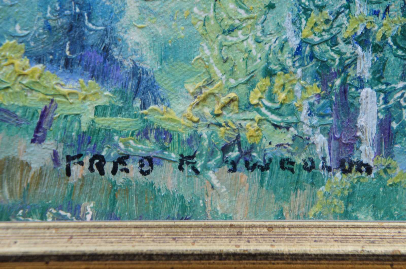 Oil on board impressionist landscape painting featuring a fence in the foreground and distant white cottages Signed Frederick Swedlun (Ernest Frederics). Frederick "Ernest T. Fredericks." Swedlun was born in 1877 in McPherson, Kansas. He studied at the Chicago Academy of Fine Art and exhibited at the Chicago Art Institute and in the All-Illinois art shows. In Chicago, he created the pseudonym Ernest T. Fredericks and was known for his regional landscape paintings. Later he moved to Eureka Springs, AR where he resumed using his birth name and where he and his son taught art classes.