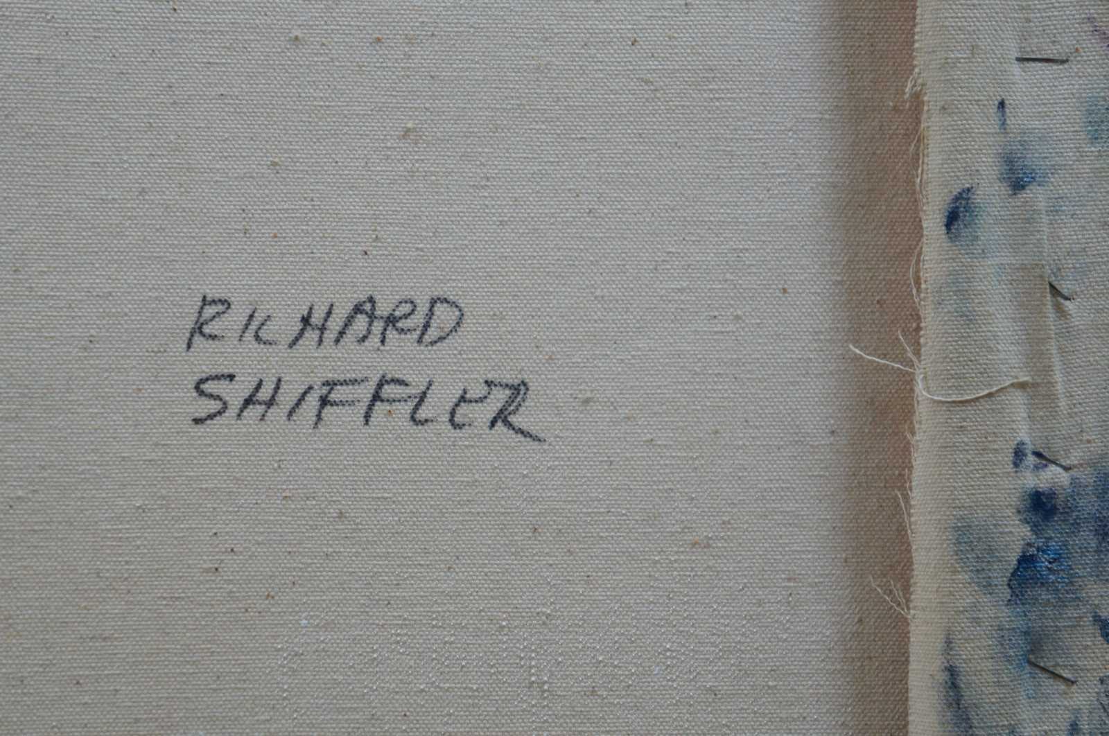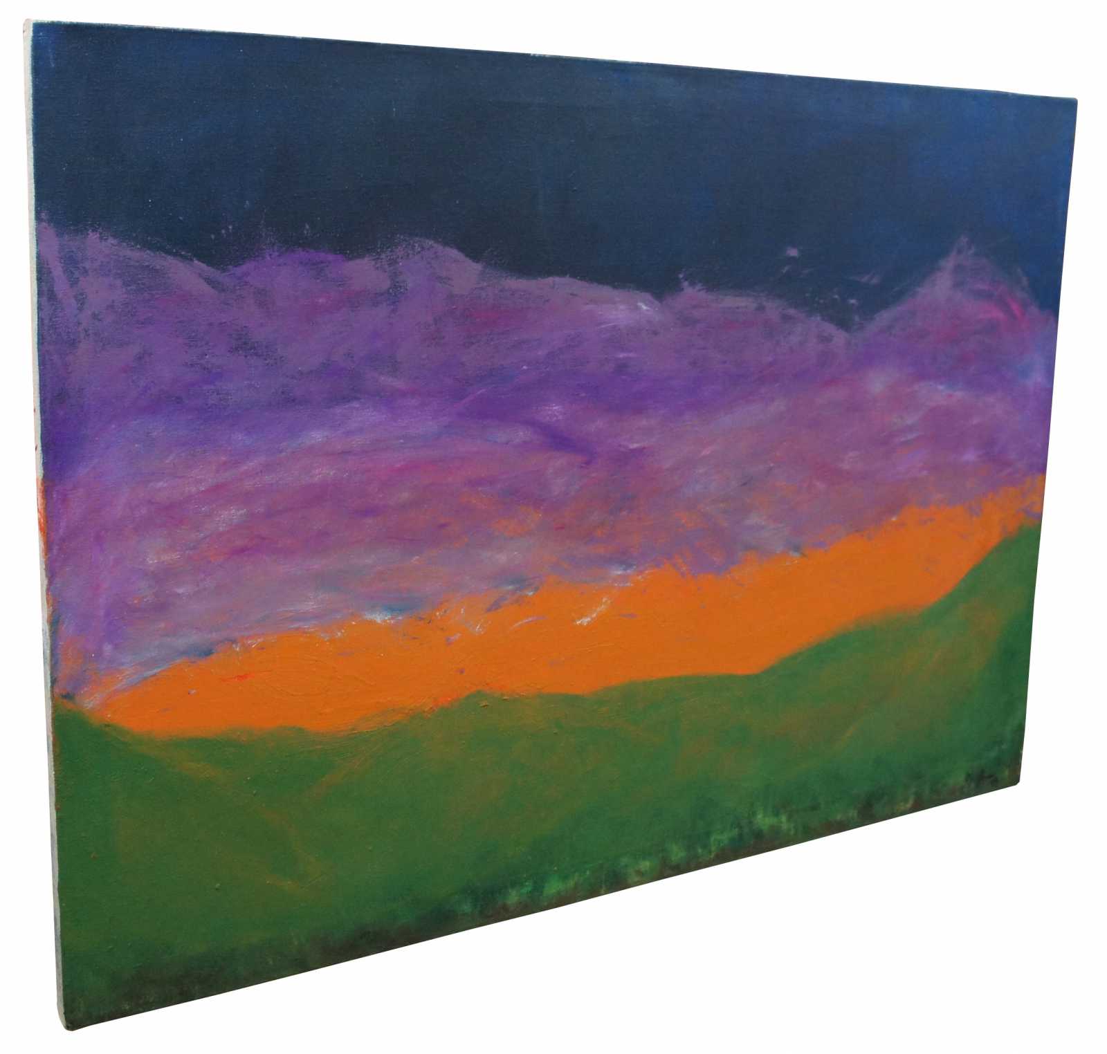 Abstract landscape painting featuring a sunrise or sunset in orange, purple and blue over green grass. Richard Shiffler was an artist and musician. He died in 1994.