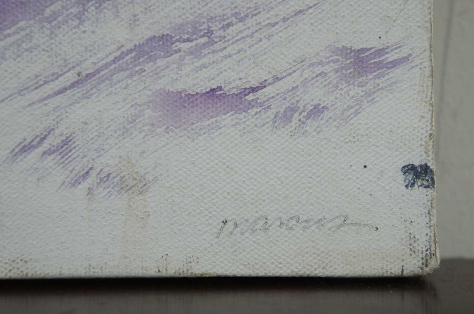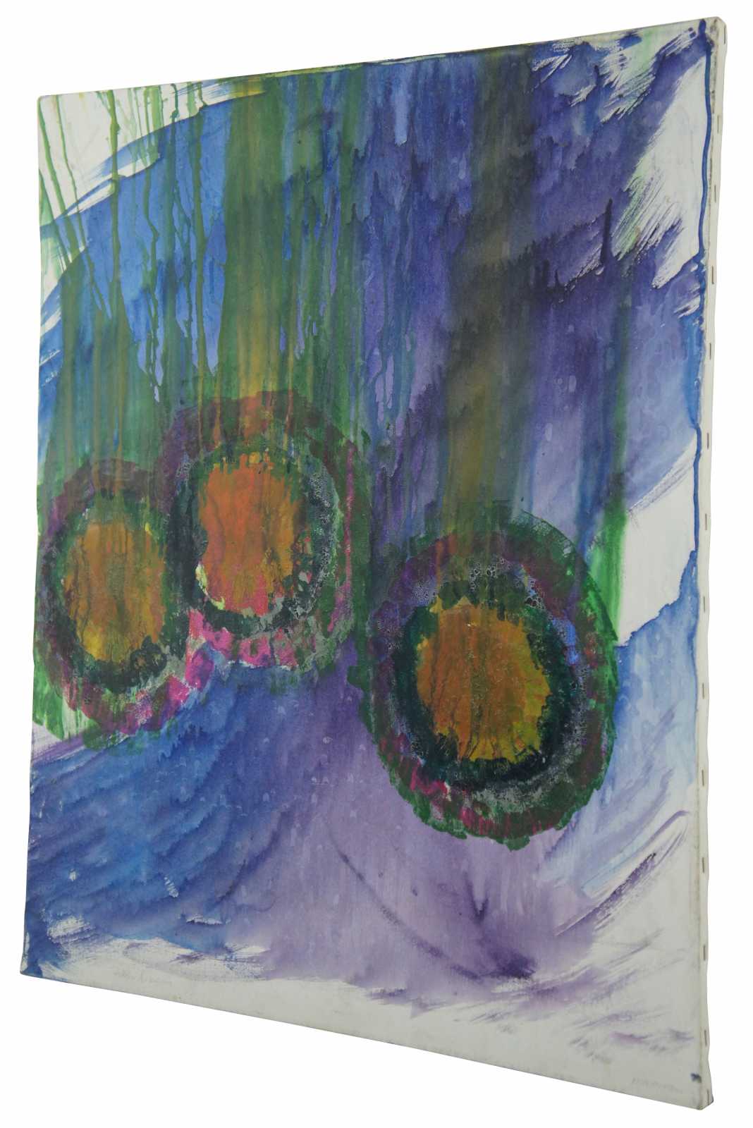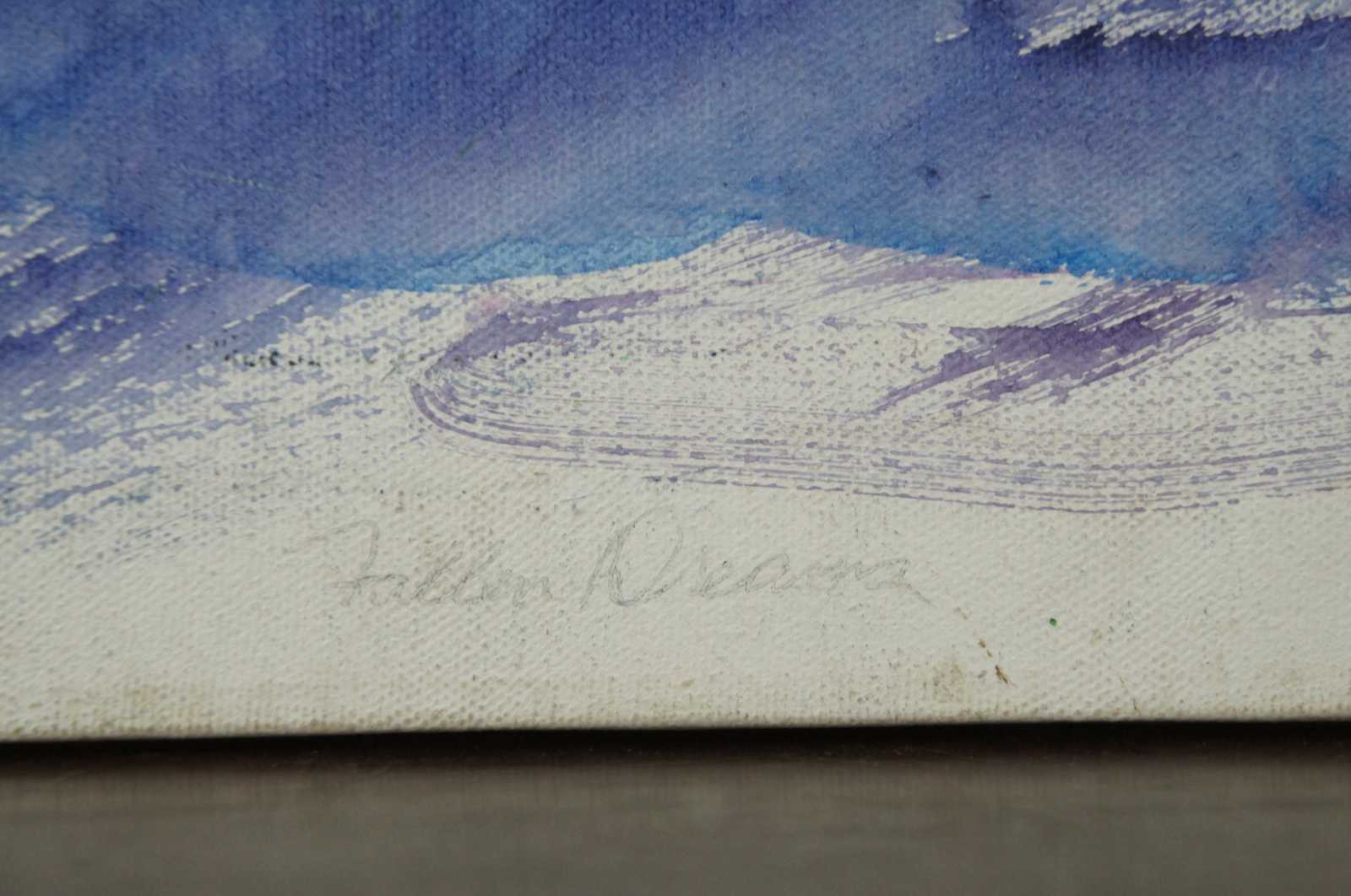 Abstract painting featuring three pink and orange orbs sinking into a blue and purple foreground, titled “Fallen Dreams” in lower left, signed by the artist lower right.