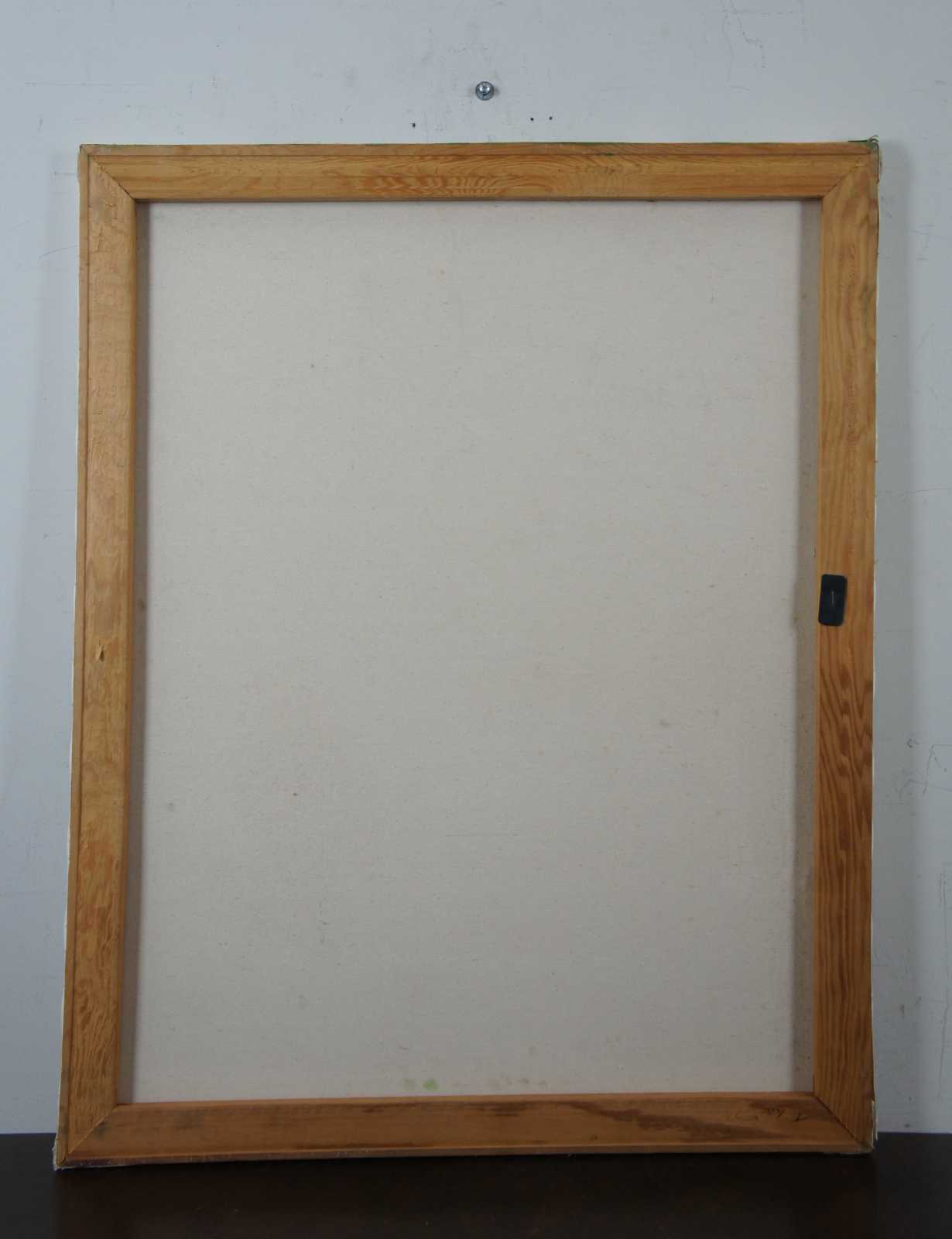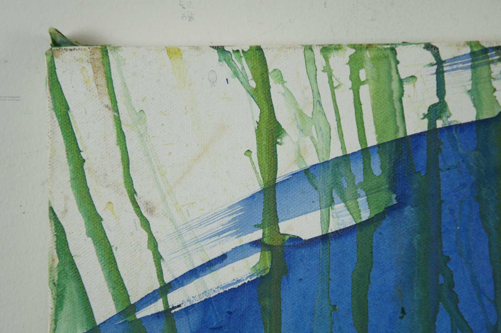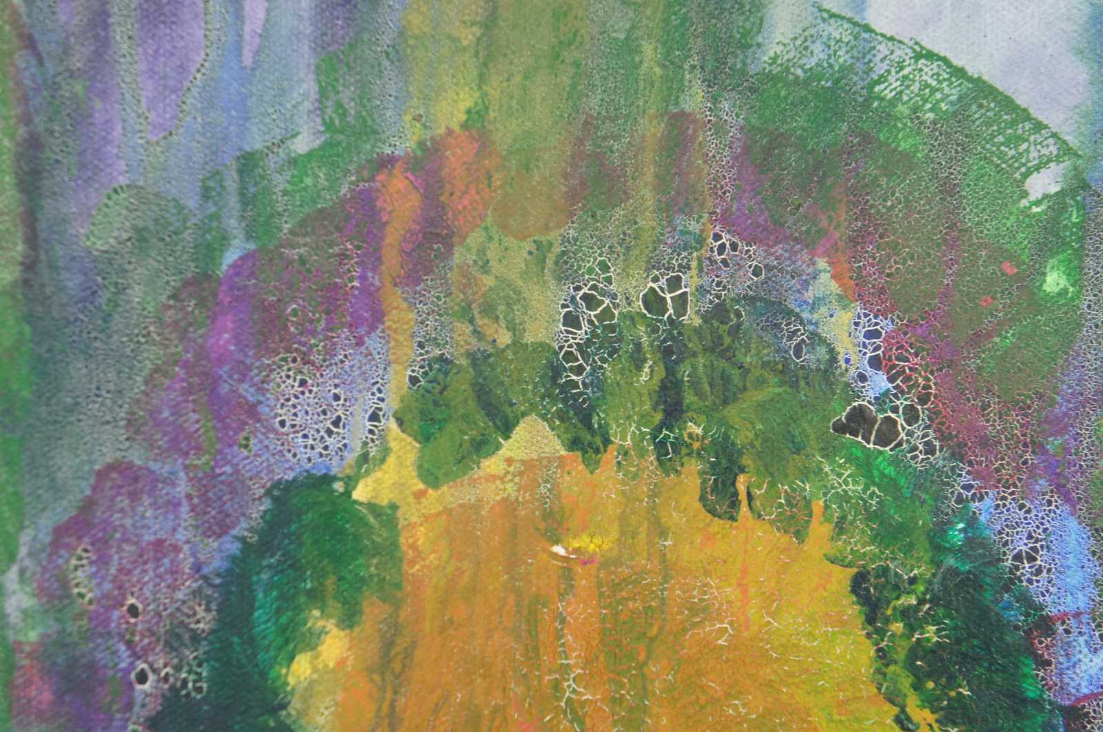Abstract painting featuring three pink and orange orbs sinking into a blue and purple foreground, titled “Fallen Dreams” in lower left, signed by the artist lower right.