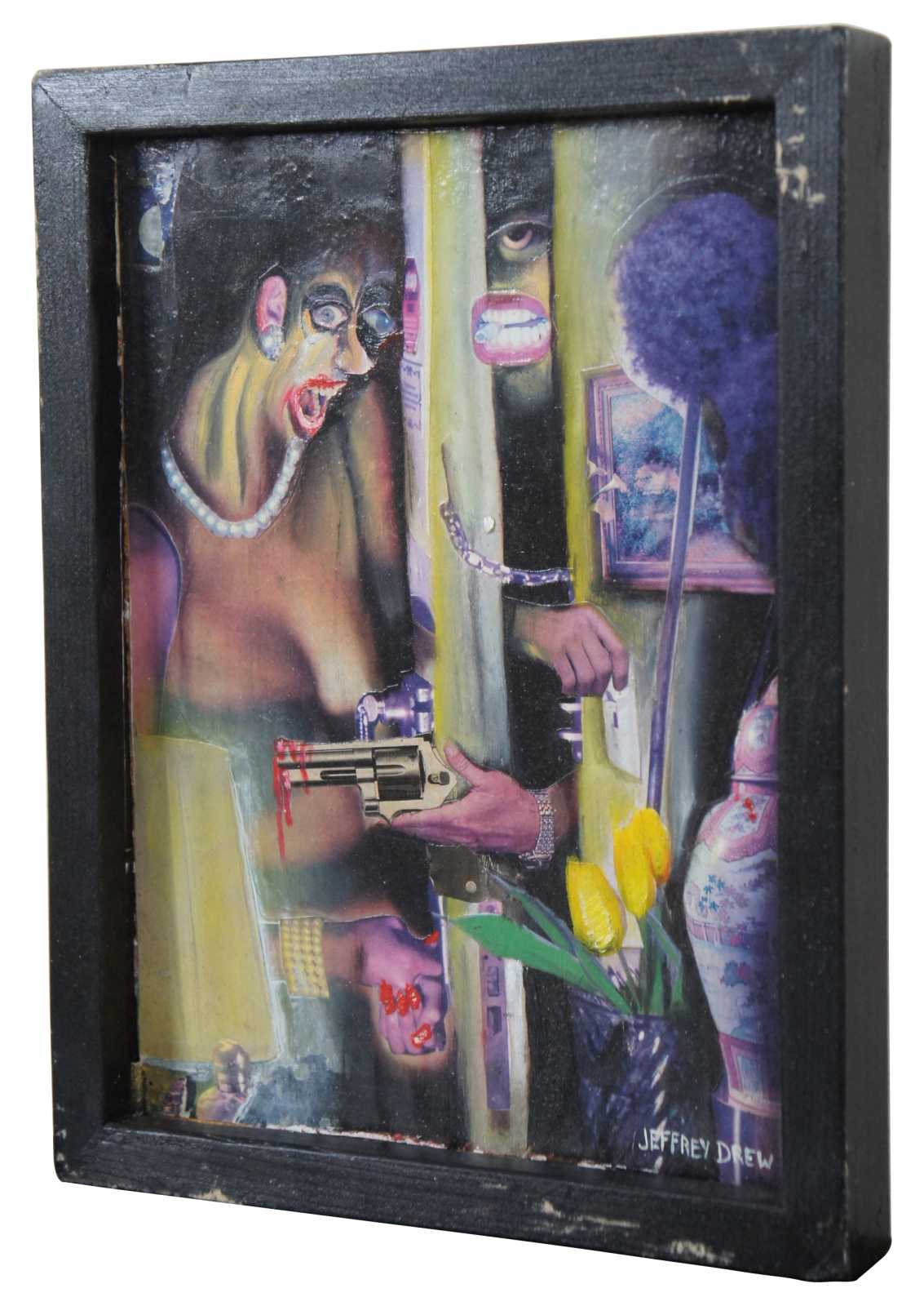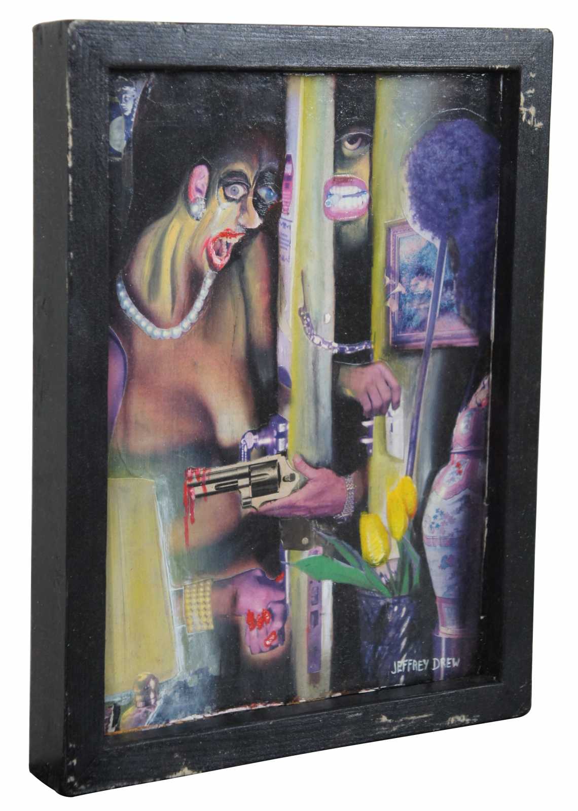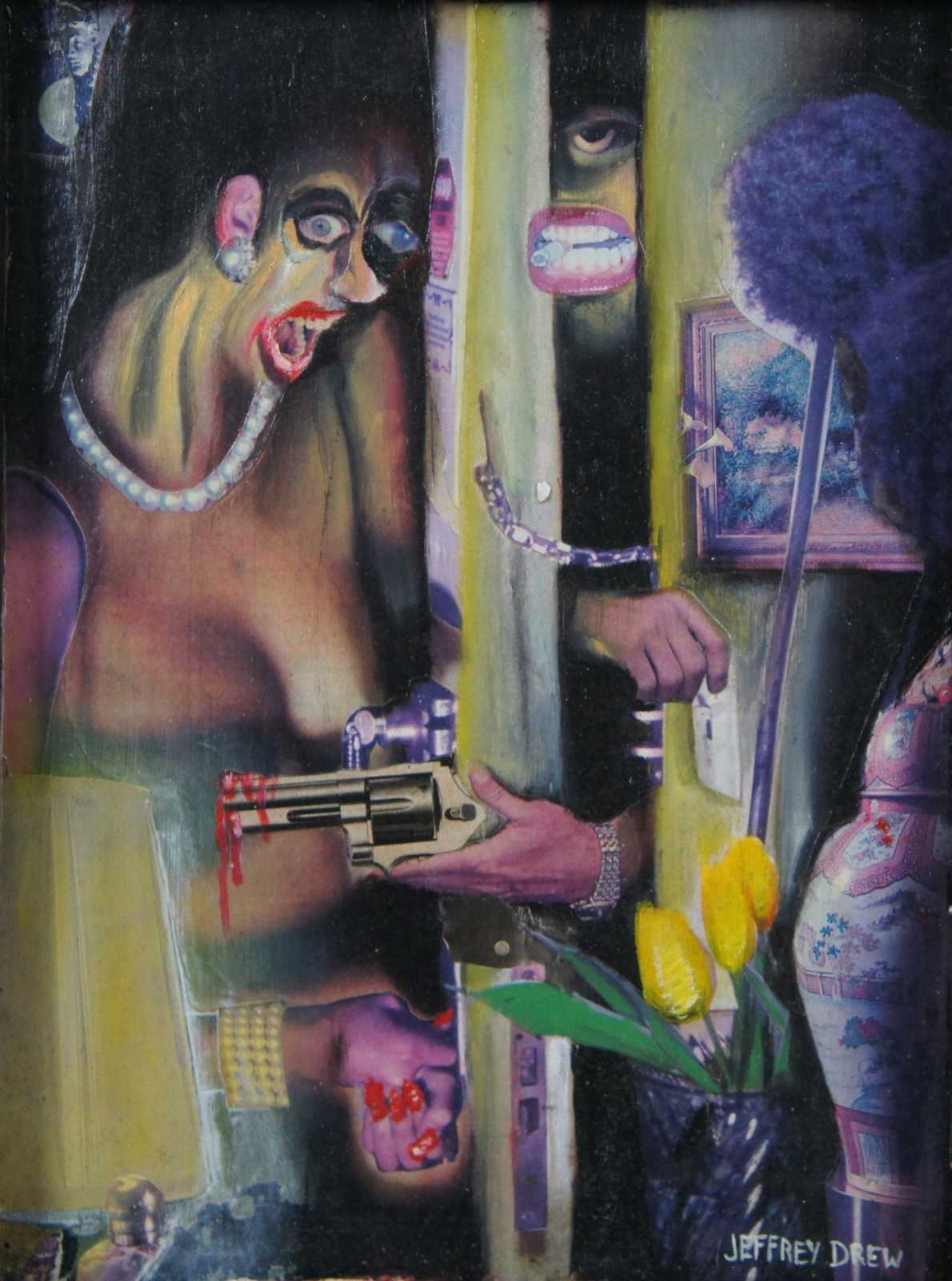 “Hold Up in Apt 3A” 1996 by Jeff Drew, a surrealist collage and oil on board featuring a partially obscured figure pointing a gun at a woman through a half open, chained apartment door. / Jeffery Drew (b. August 29, 1973) from Centerville, Indiana has been creating art since early childhood. He attended the John Herron School of Art in Indianapolis, IN from 1992-1997. After school he began his work as a freelance illustrator and designer. Drew designed his first cover for Albuquerque’s “The Weekly Alibi” in 1999 and worked as a full time graphic designer there from 2004-2012. Drew’s artistic output includes not only illustration and commercial graphic design, but music and animation as well.