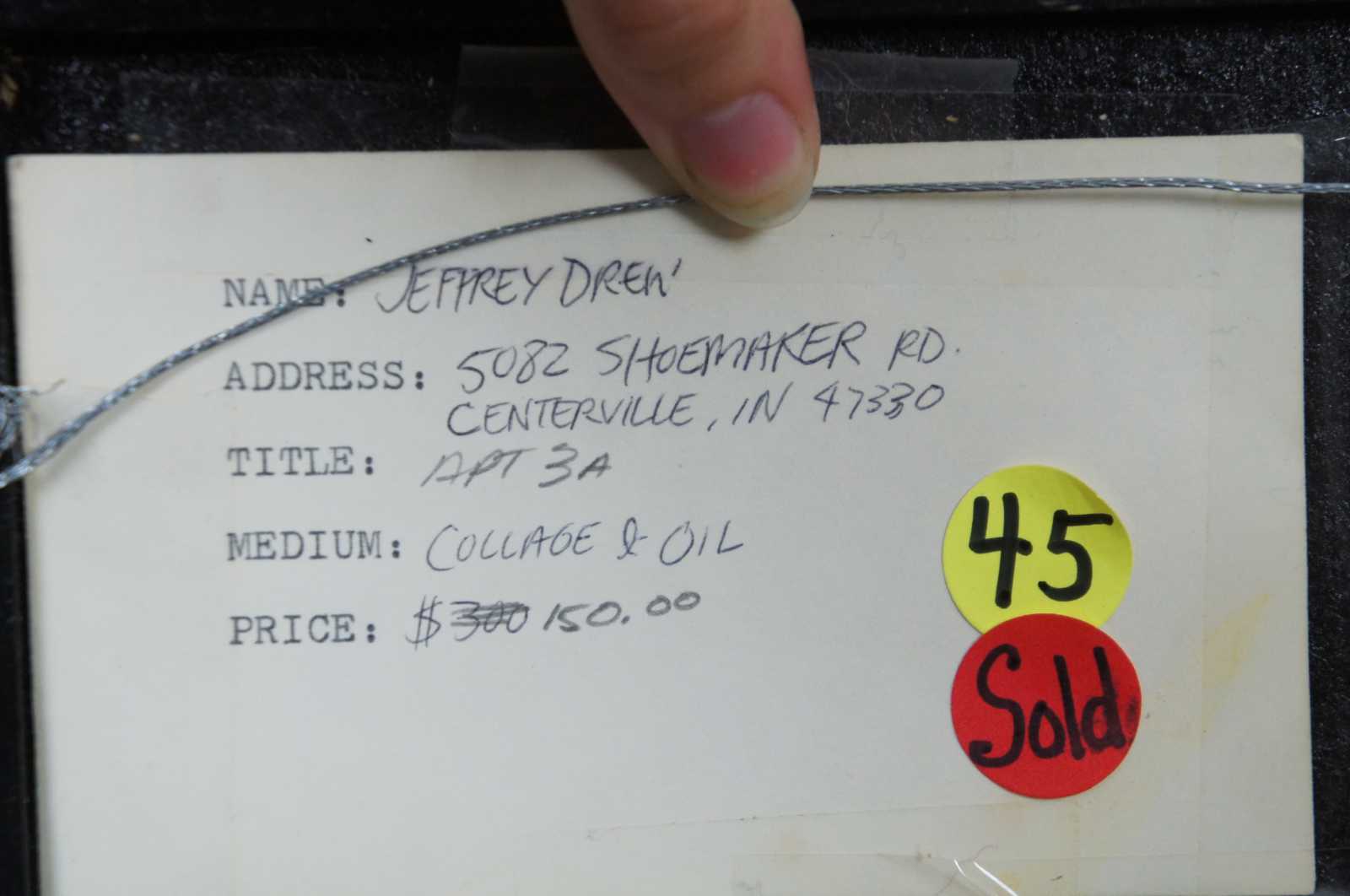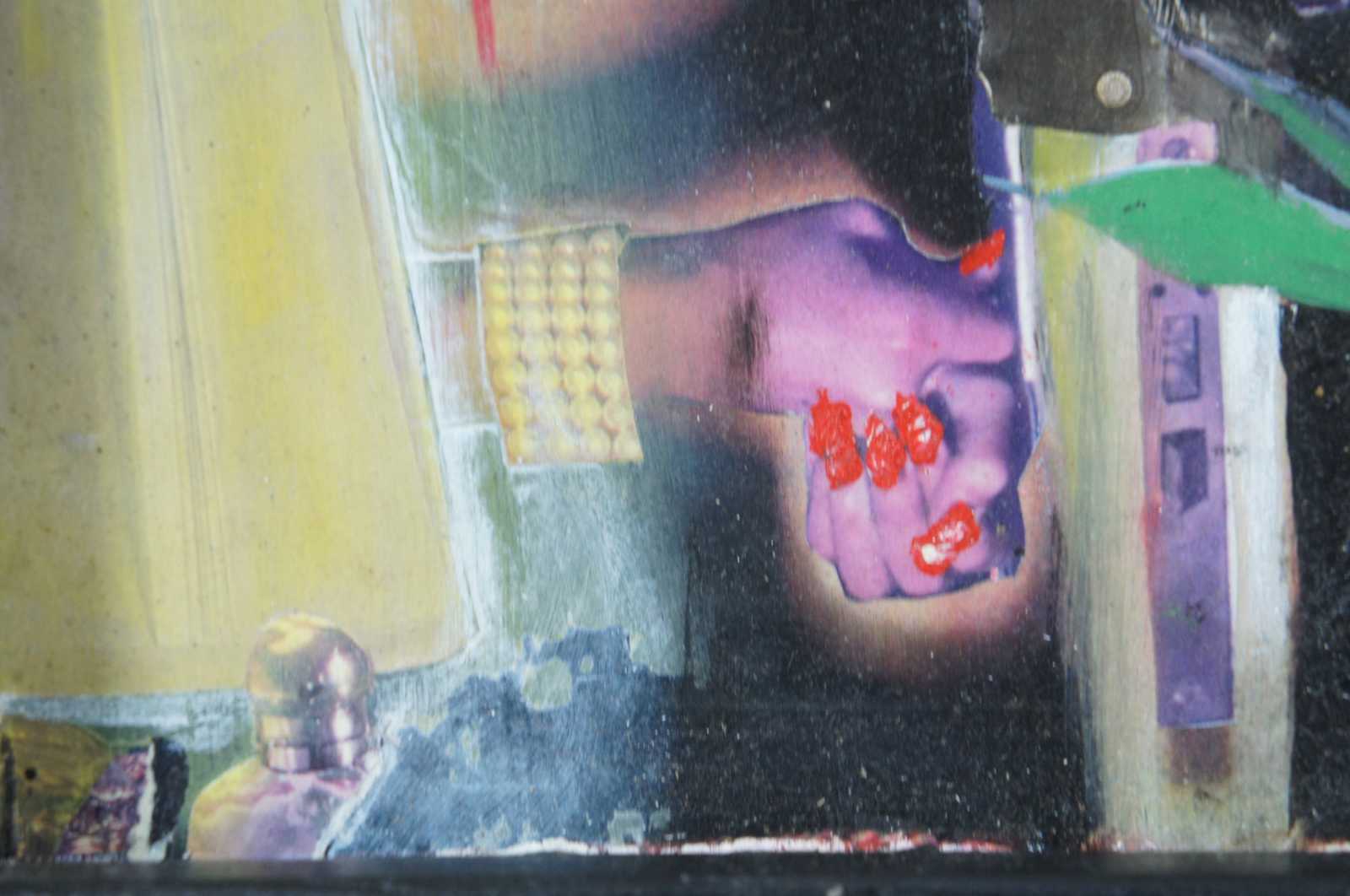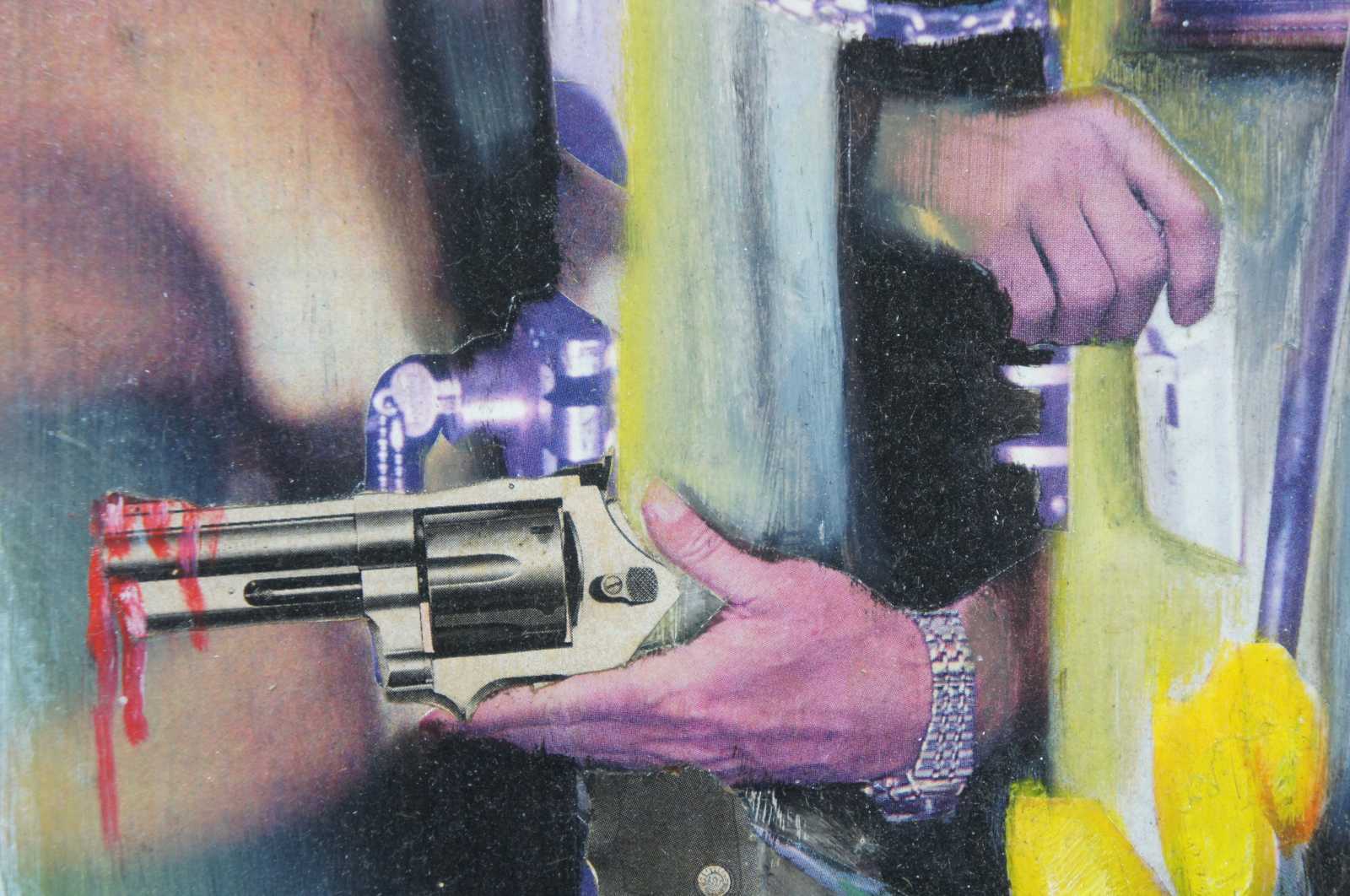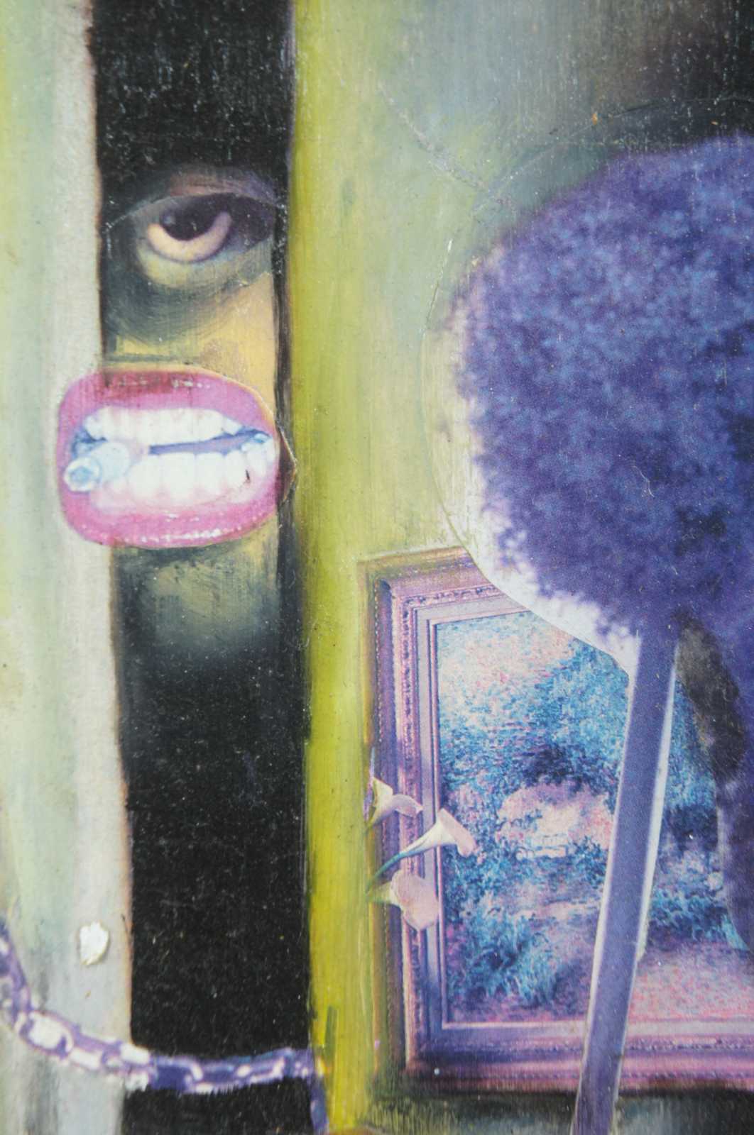 “Hold Up in Apt 3A” 1996 by Jeff Drew, a surrealist collage and oil on board featuring a partially obscured figure pointing a gun at a woman through a half open, chained apartment door. / Jeffery Drew (b. August 29, 1973) from Centerville, Indiana has been creating art since early childhood. He attended the John Herron School of Art in Indianapolis, IN from 1992-1997. After school he began his work as a freelance illustrator and designer. Drew designed his first cover for Albuquerque’s “The Weekly Alibi” in 1999 and worked as a full time graphic designer there from 2004-2012. Drew’s artistic output includes not only illustration and commercial graphic design, but music and animation as well.