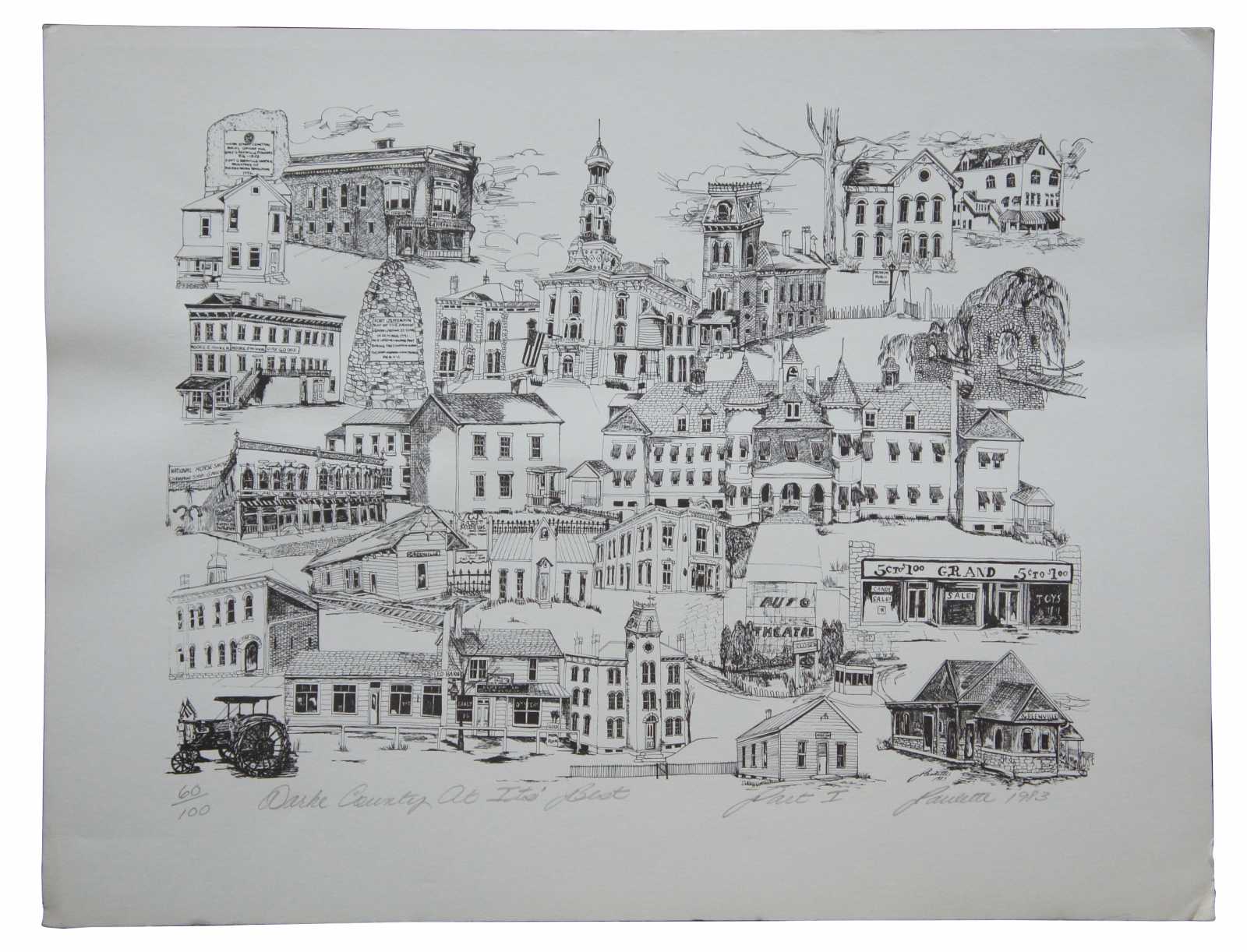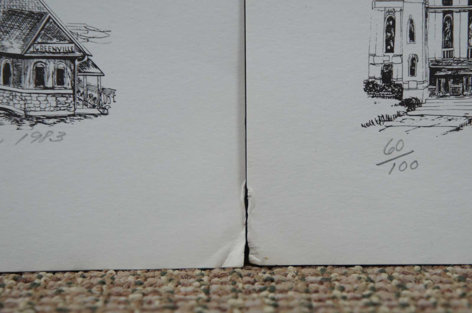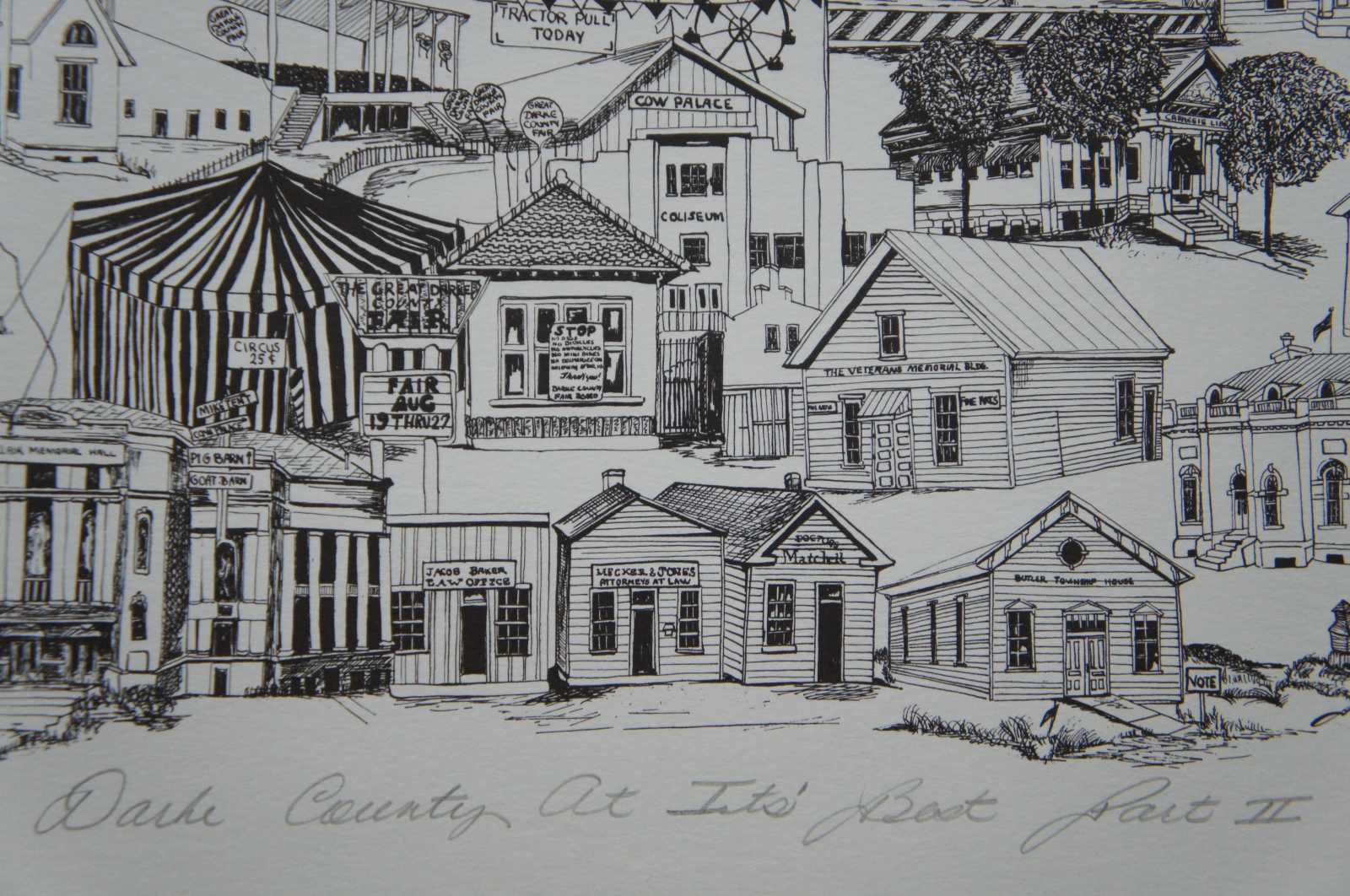 “Darke County at Its Best” (Greenville Ohio) parts I and II, limited edition prints numbered 60/100 and pencil signed by the artist, Paulette McGriff 1983. / Paulette McGriff Zawosky (1951 - 2003) was a well known Darke County, Ohio artist, photographer, and quilter. Her pen and ink drawings feature many of Darke County’s activities and locations. These took 1st and 2nd place.