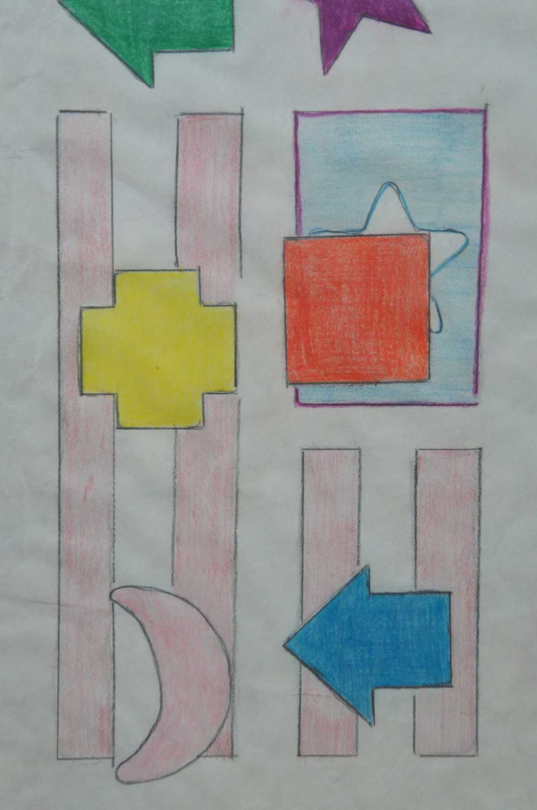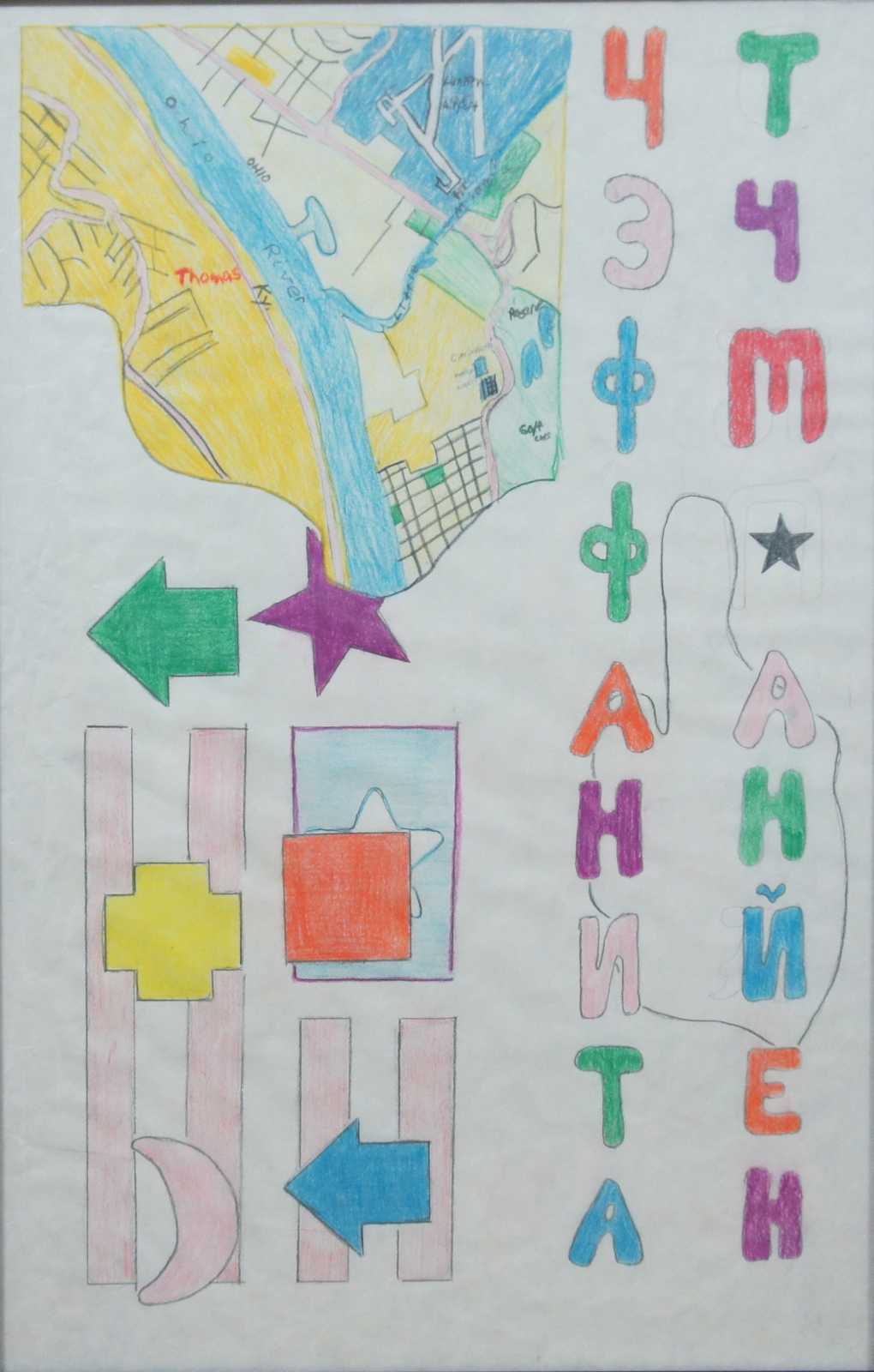 Colored pencil on paper drawing of a portion of the Ohio River around Cincinnati’s Lunken Airport, assorted overlapping shapes, and letters from the Russian alphabet.