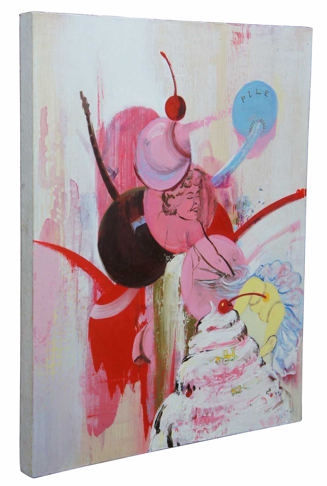 “Pile” 1992 is an early oil on panel work by Margaret Curtis, featuring a female figure enmeshed in a whimsicle ice cream sundae. / Born in Hamilton, Bermuda, Margaret Curtis is a painter and visual artist. She has been creating feminist-based work since the late 1980s. Curtis has been included in shows at The Brooklyn Museum, The Andy Warhol Museum, The Huntington Beach Art Center, The Mint Museum and The Wexner Center. Career highlights include being featured in Marcia Tucker’s 1994 Bad Girls exhibition at the New Museum of Contemporary Art in NYC; her work was curated by Lilli Wei and by Laurie Simmons; she enjoyed numerous solo and group shows at P.P.O.W. gallery in NYC where she was represented for many years. In addition to solo exhibitions throughout New York and the American South, her work was the subject of a retrospective exhibition at the Amelie A. Wallace Gallery at Stony Brook University in New York and was recently featured in Appalachia Now, a regional survey at the Asheville Art Museum.