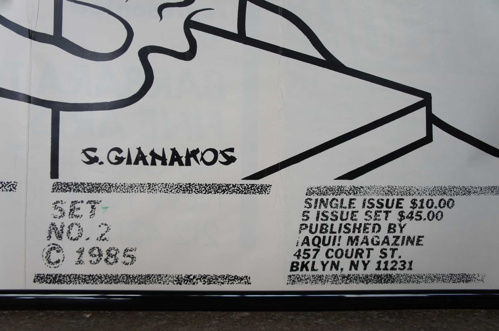 During the 80s, the colorful, illustrative oversized posters of AQUI Magazine were lining the streets of New York City, sold at bookstores such as MoMA bookstore and Printed Matter, and displayed at art institutions around the world. From 1983-86, Cliff Baldwin, Julie Bradrick and Davi Det Hompson collaborated with silk-screener Norman Lassiter and published ten issues of AQUI in downtown Manhattan. AQUI provided the public with accessible quality art at the price of $10 a poster, an affordable alternative to the traditional art gallery. The tabloid-sized, folded posters unfolded into one of two sizes: 45 x 69” and 35 x 45,” and featured silk-screened original artwork by Barbara Kruger, Les Levine, Steve Gianakos, General Idea, Gilbert & George, Davi Det Hompson, Julie Bradrick and Cliff Baldwin. To this day, the posters are significant because of their experimental typographic explorations and genuine promotion of democratic art making.