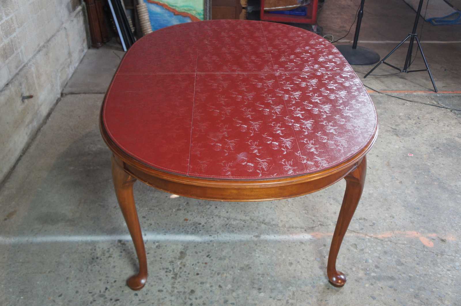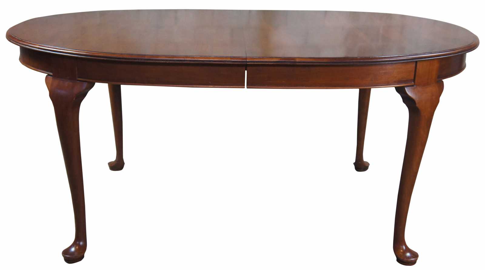Solid cherry oval dining room table by Penn House, circa 1971. Features a queen anne style with cabriole legs leading to pad feet. Table pads included.