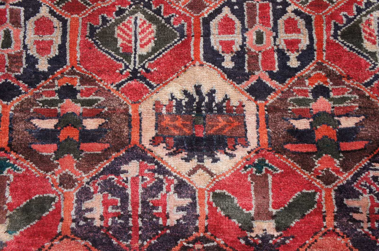 Fantasitc Antique hand knotted Persian Bakhtiar area rug. Inspired by Persian gardens with a field of red with a geometric floral pattern with greens, reds, tans, pinks, purples and orange.