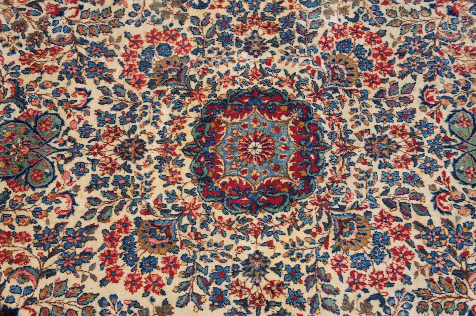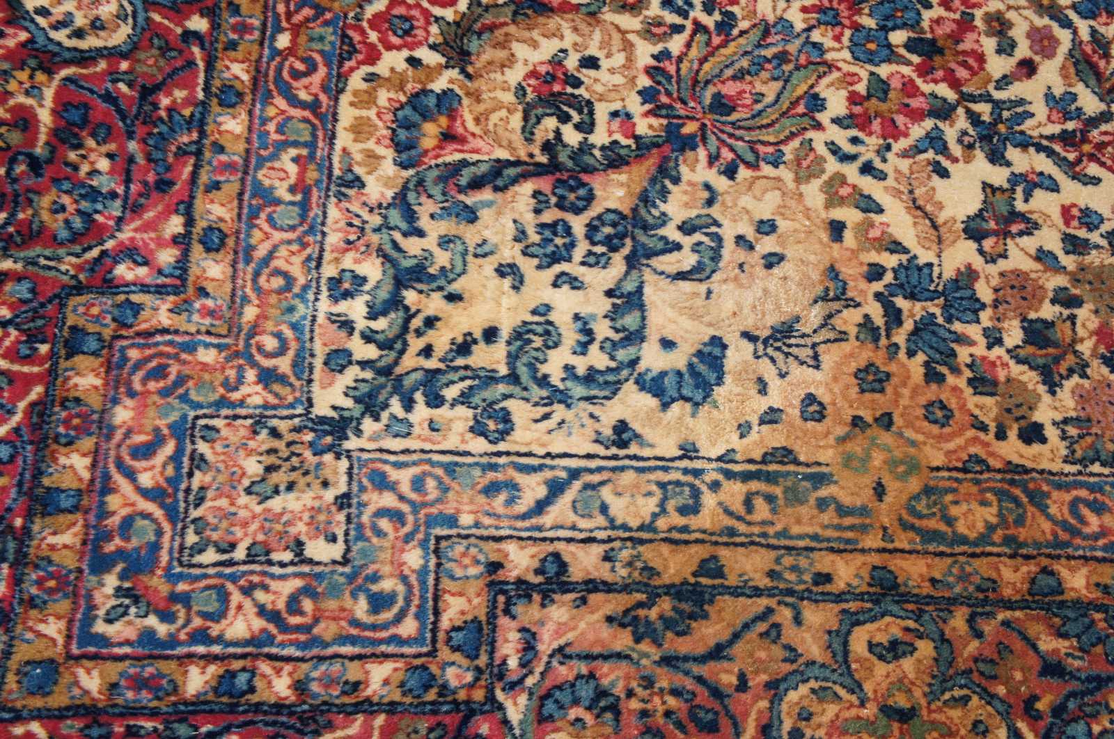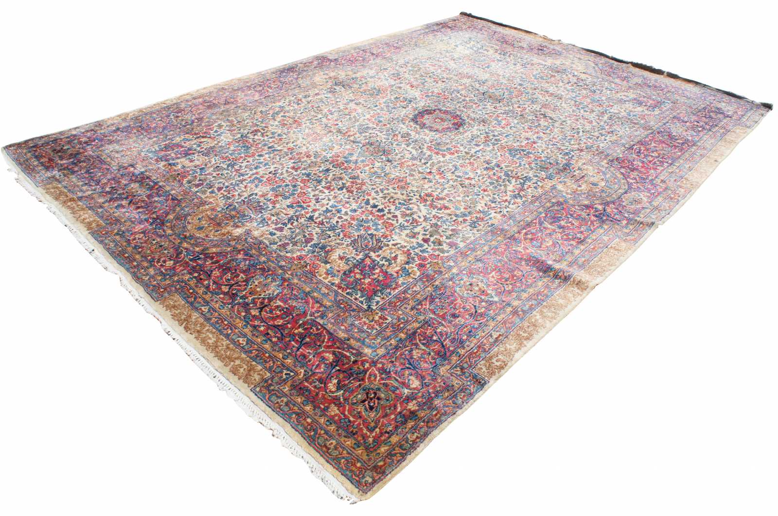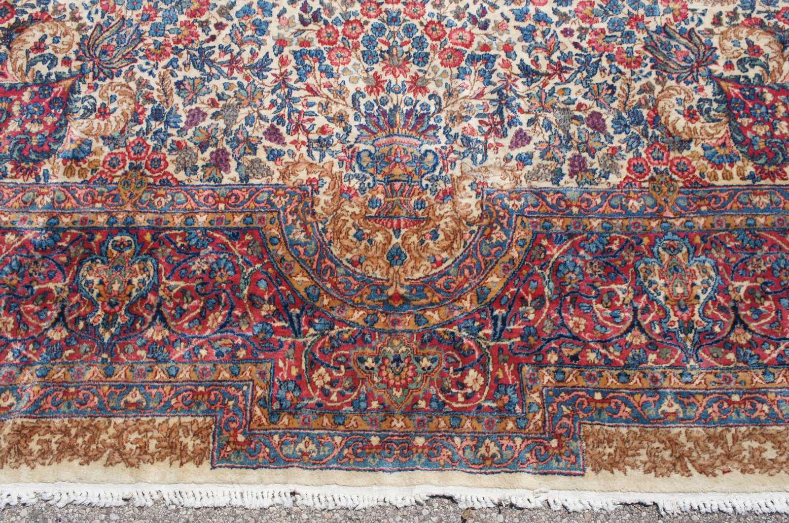 Beautiful botanical motifs establish a majestic formal atmosphere in this uniquely hued Persian Sino rug / carpet. Lavish floral with trophy urns and bouquets are arranged with exacting precision in geometric flowing arabesques. The color palette is quite novel, consisting of a field of tan or beige filled with florals of reds, pinks, tans, greens, blues, teal / turquoise, purples, yellows, gold, orange and brown. This large antique rug's heavy wool pile and construction make it ideal for any level of usage.