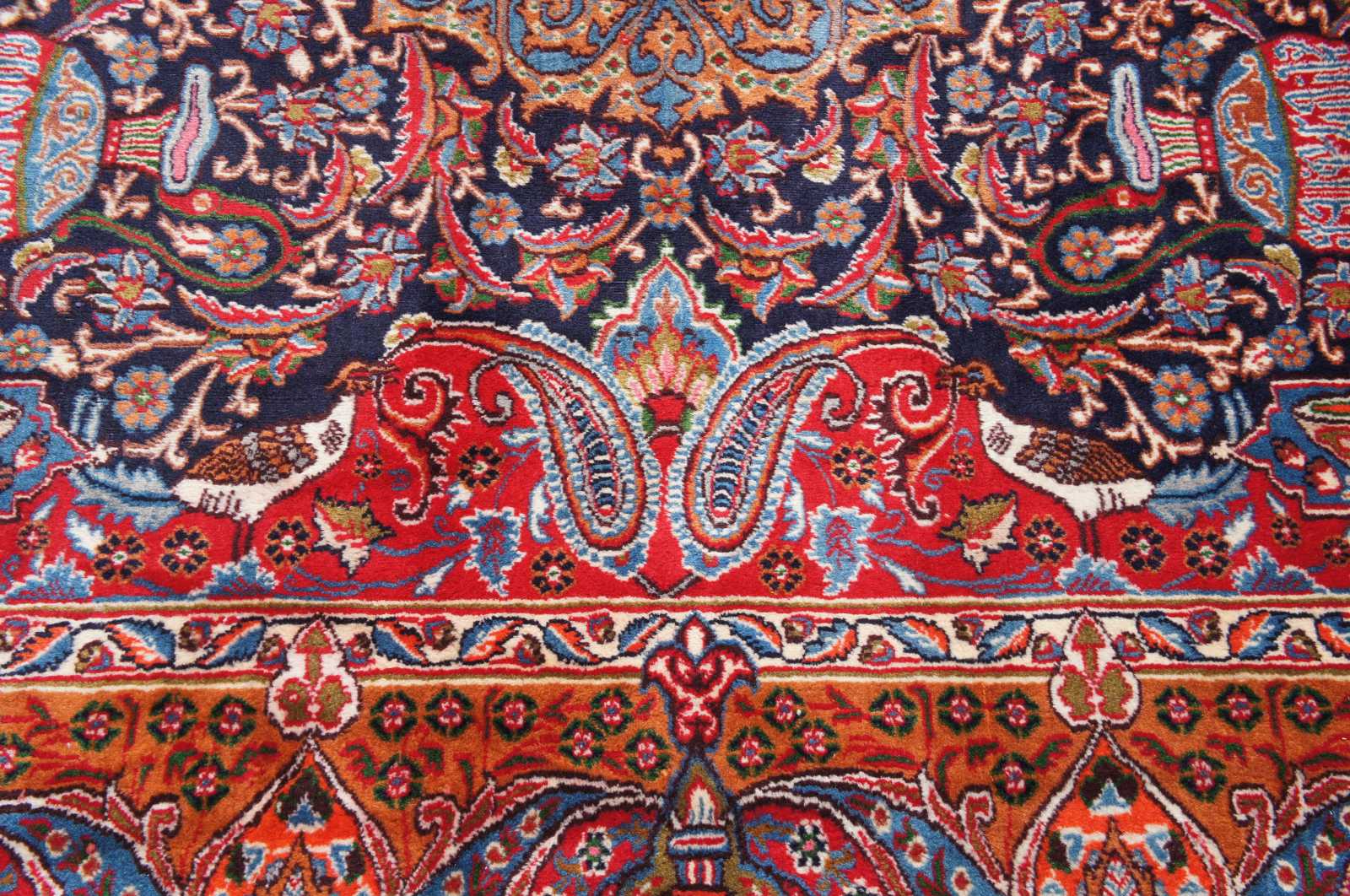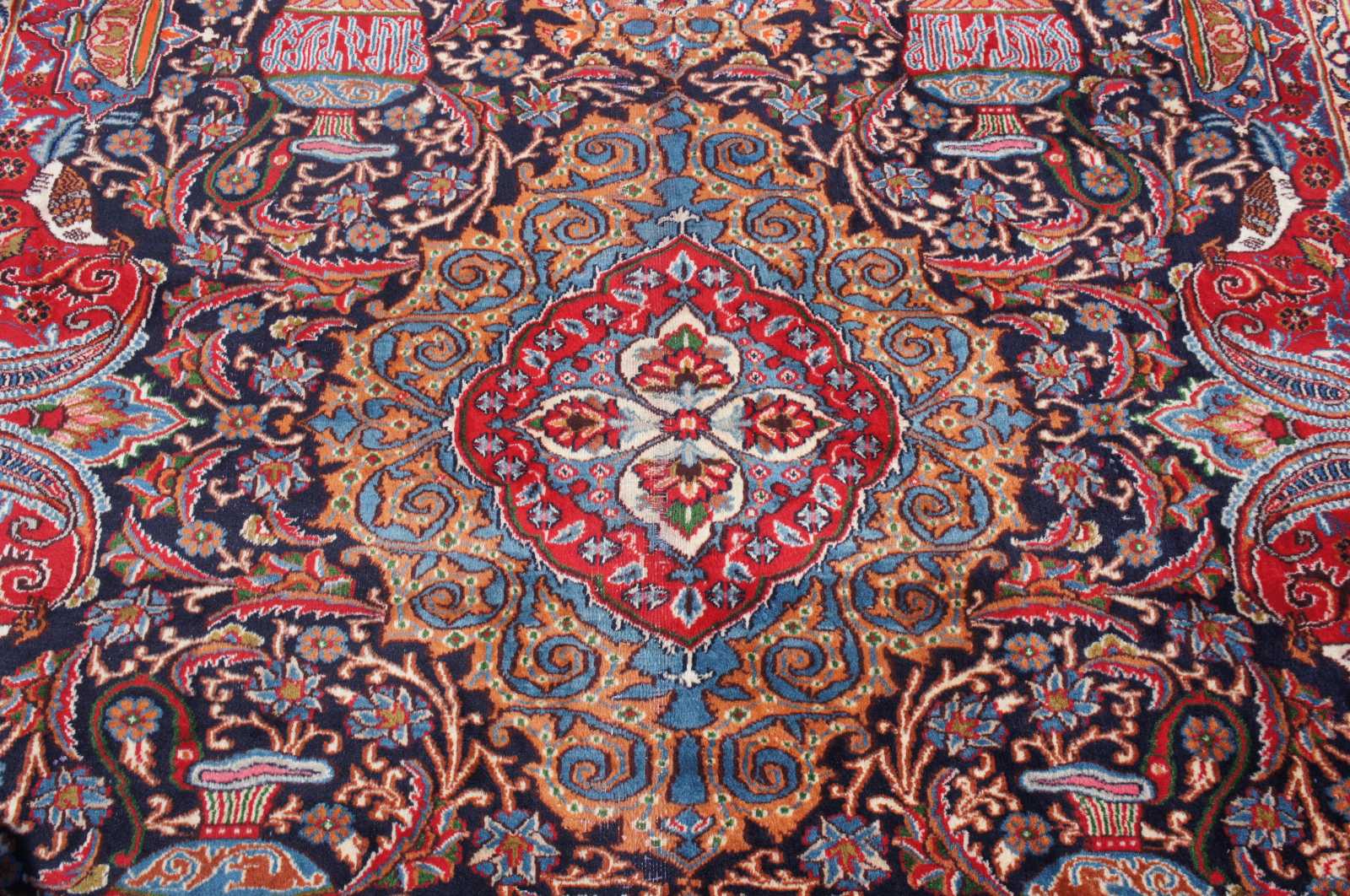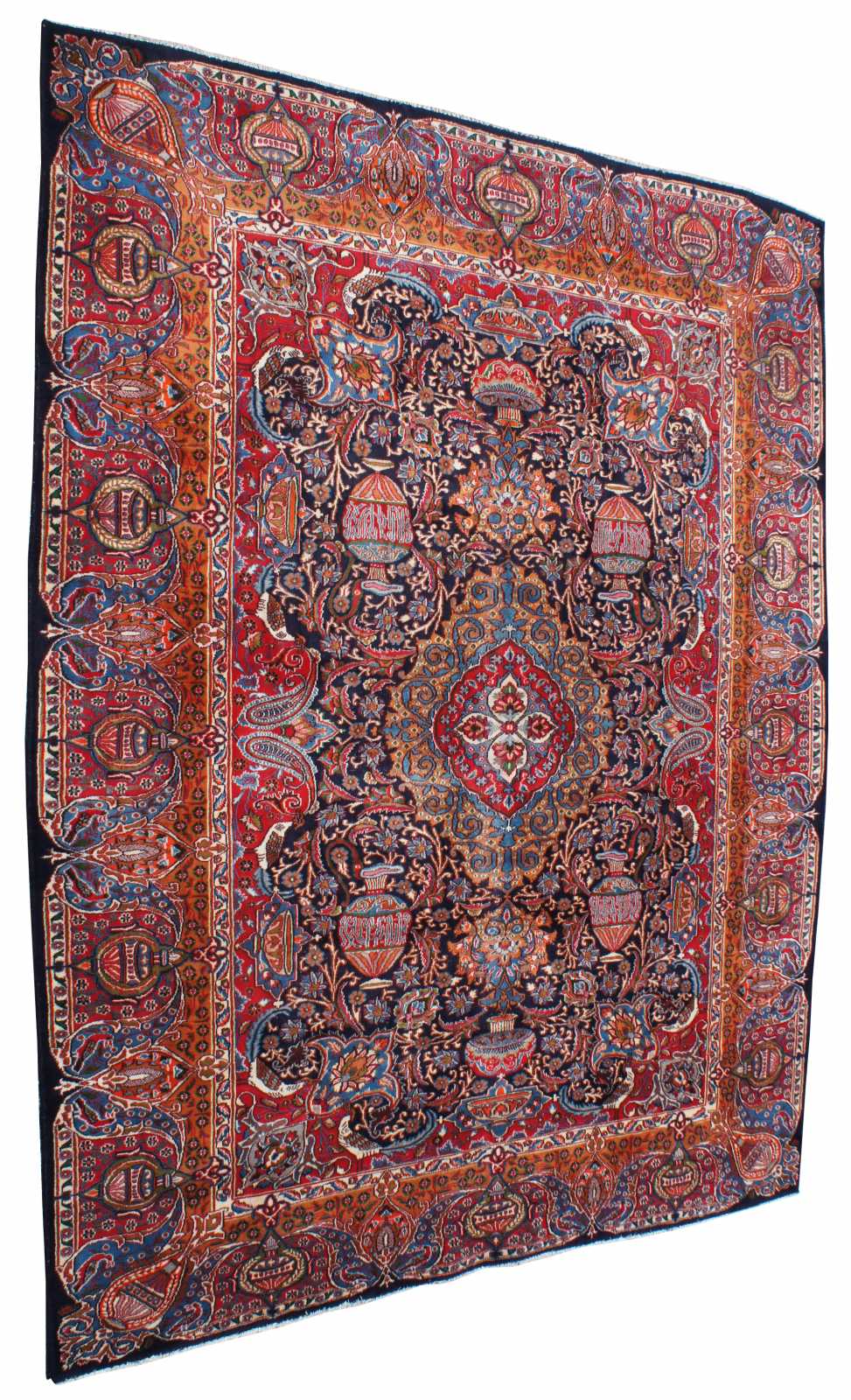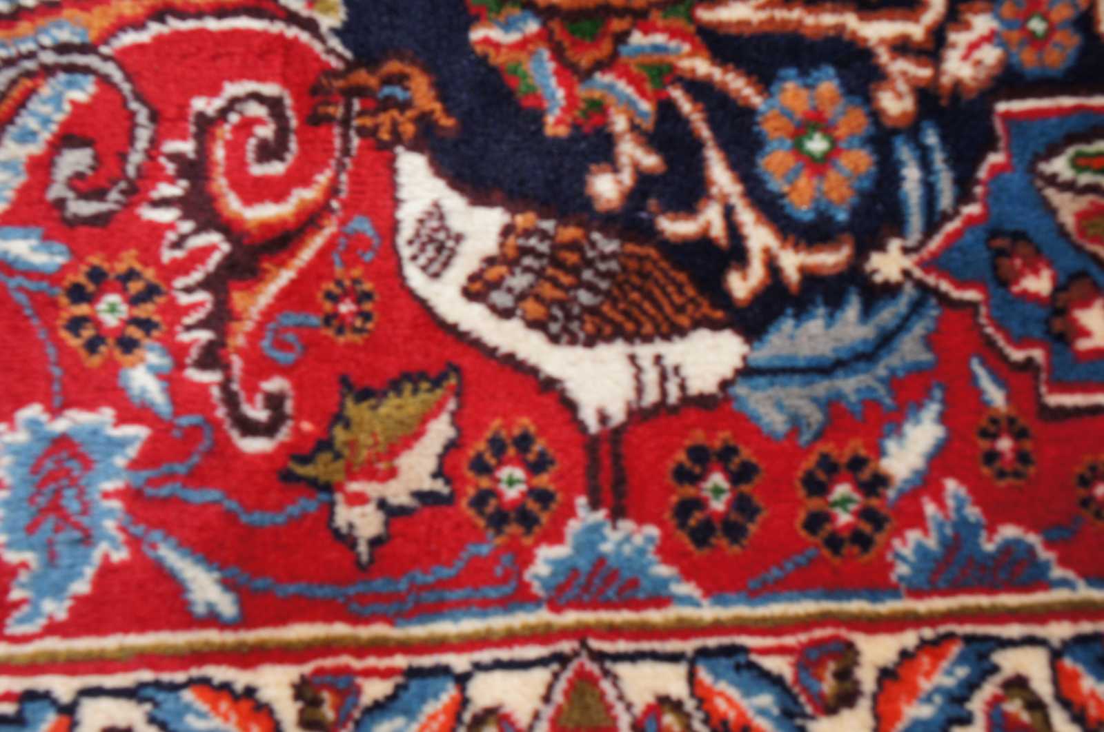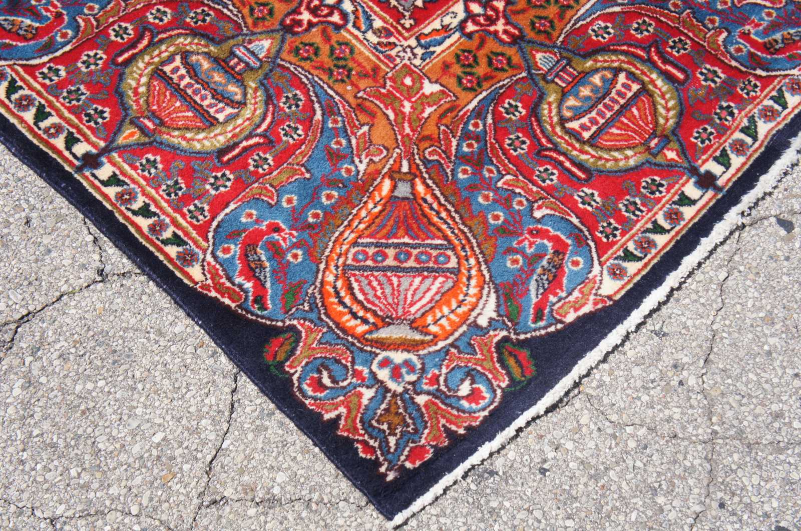 Antique hand knotted Persian rug featuring a field of reds and blues with ornaments, trophy urns / vases, various birds and floral accents. Shades of reds, blues, orange, cream / beige, greens and browns.