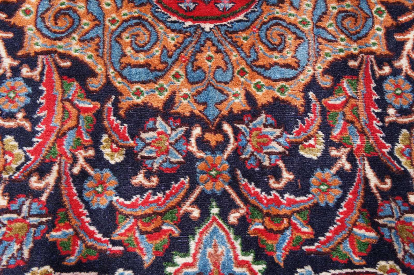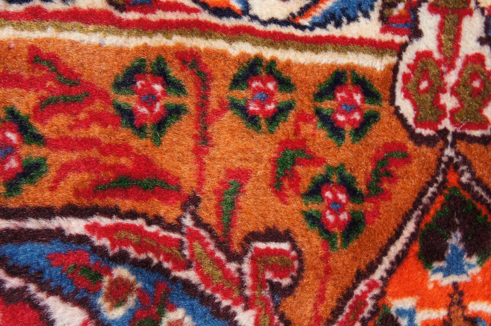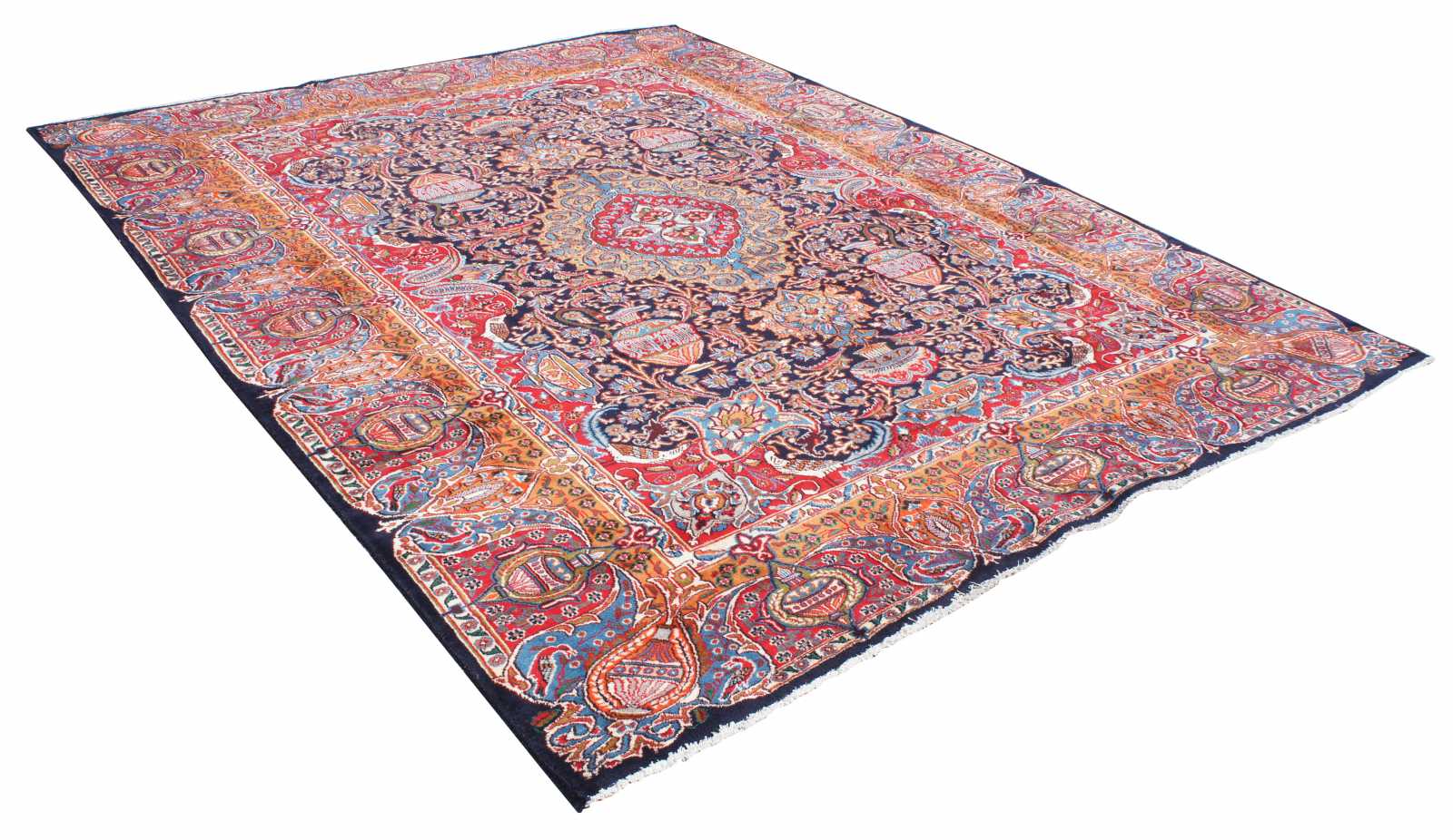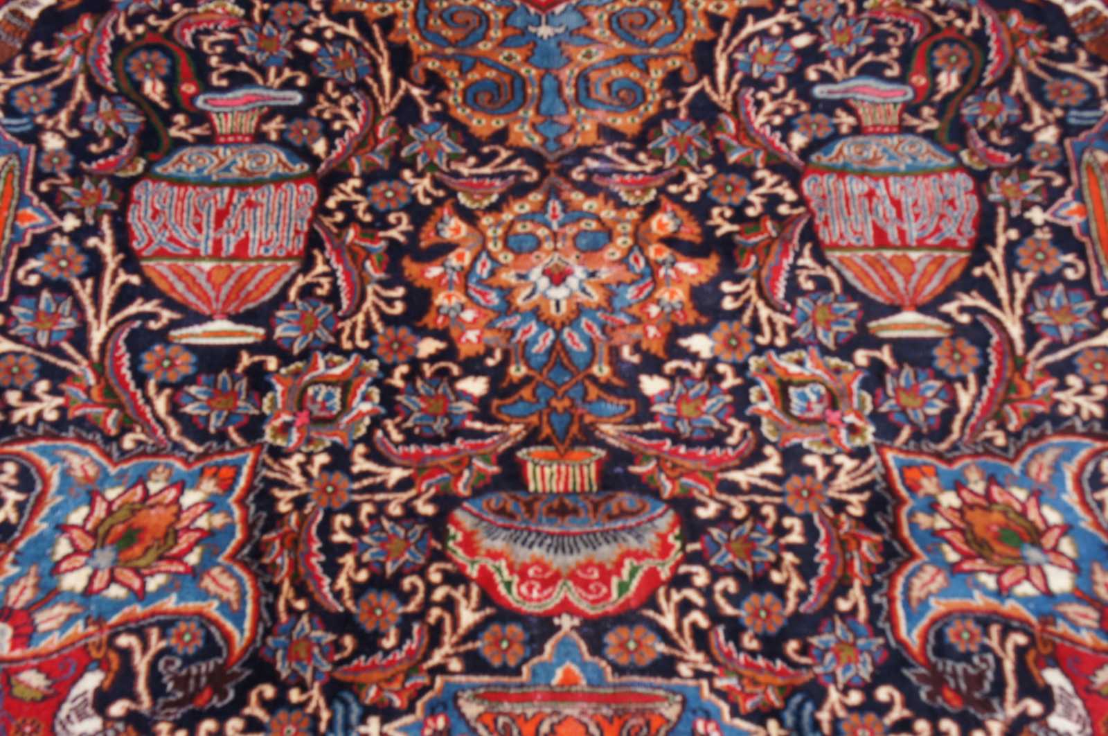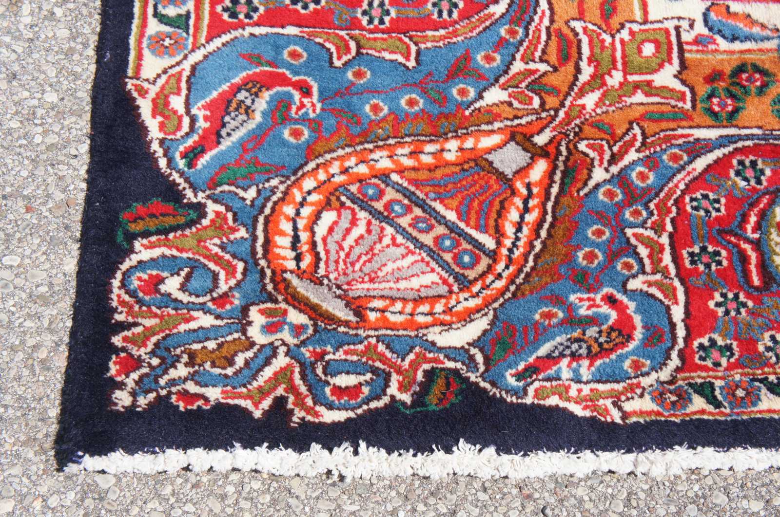 Antique hand knotted Persian rug featuring a field of reds and blues with ornaments, trophy urns / vases, various birds and floral accents. Shades of reds, blues, orange, cream / beige, greens and browns.