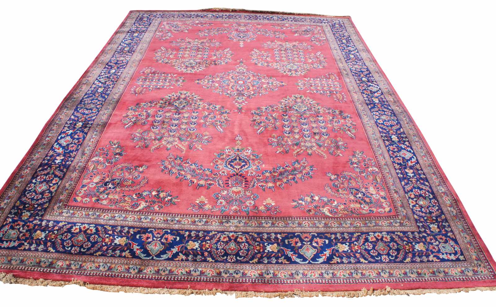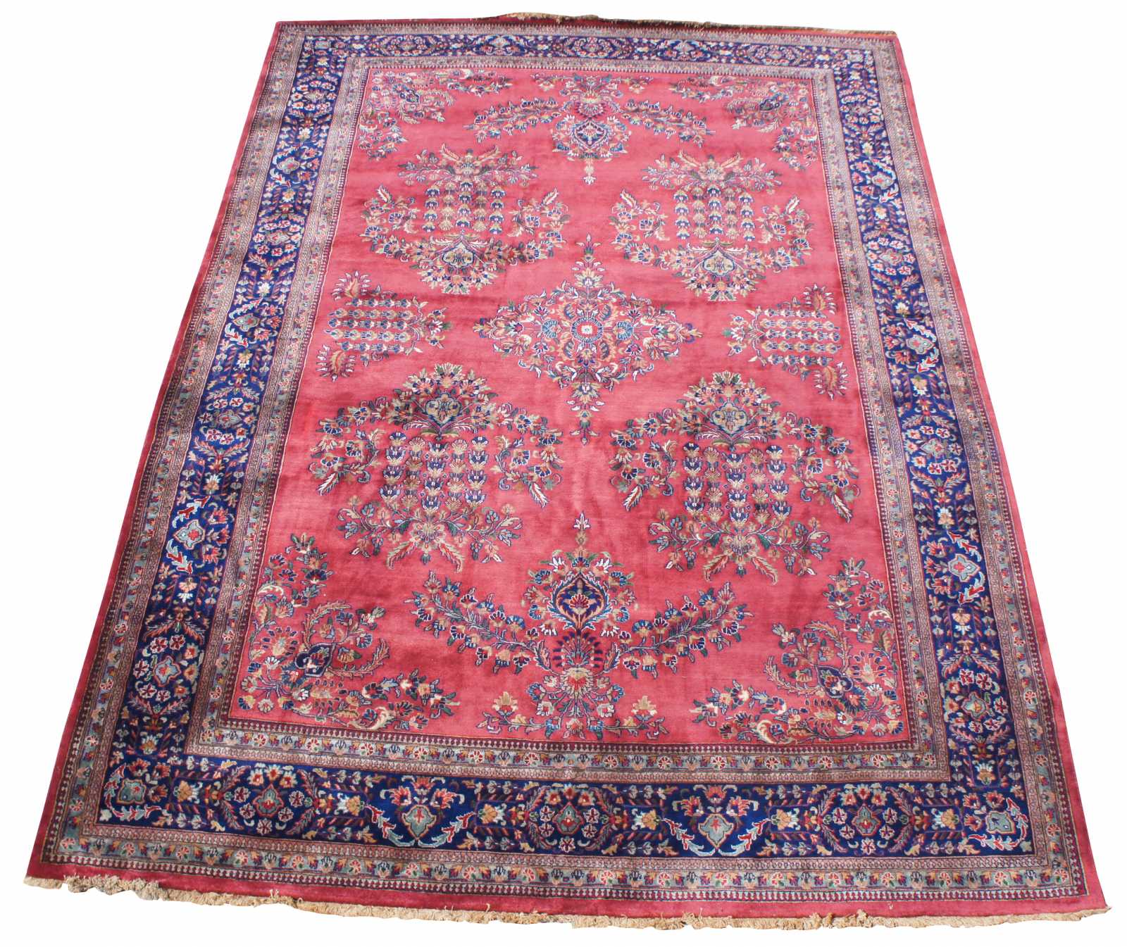 Antique hand knotted Sarugh area rug. Features a field of red with a floral spray of medallions and all over floral design, framed by a indigo / blue / purple border. Features blues, purples, reds, pinks, green and cream / beige.