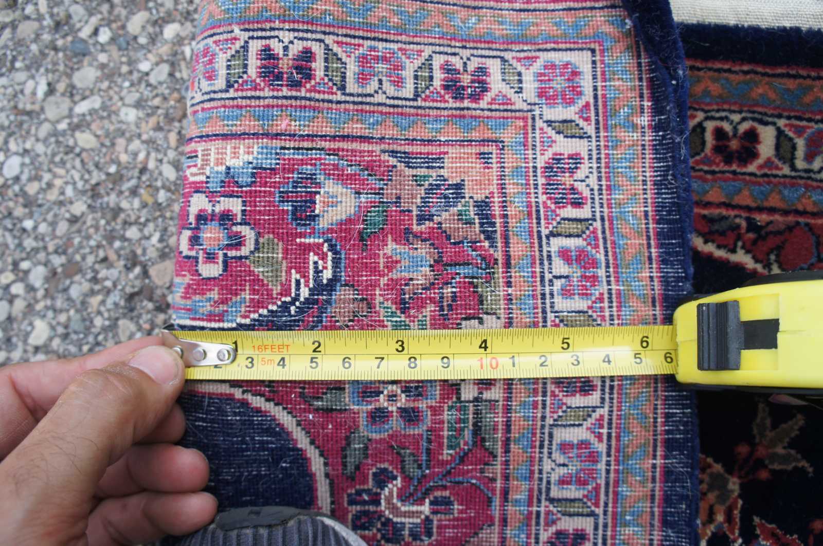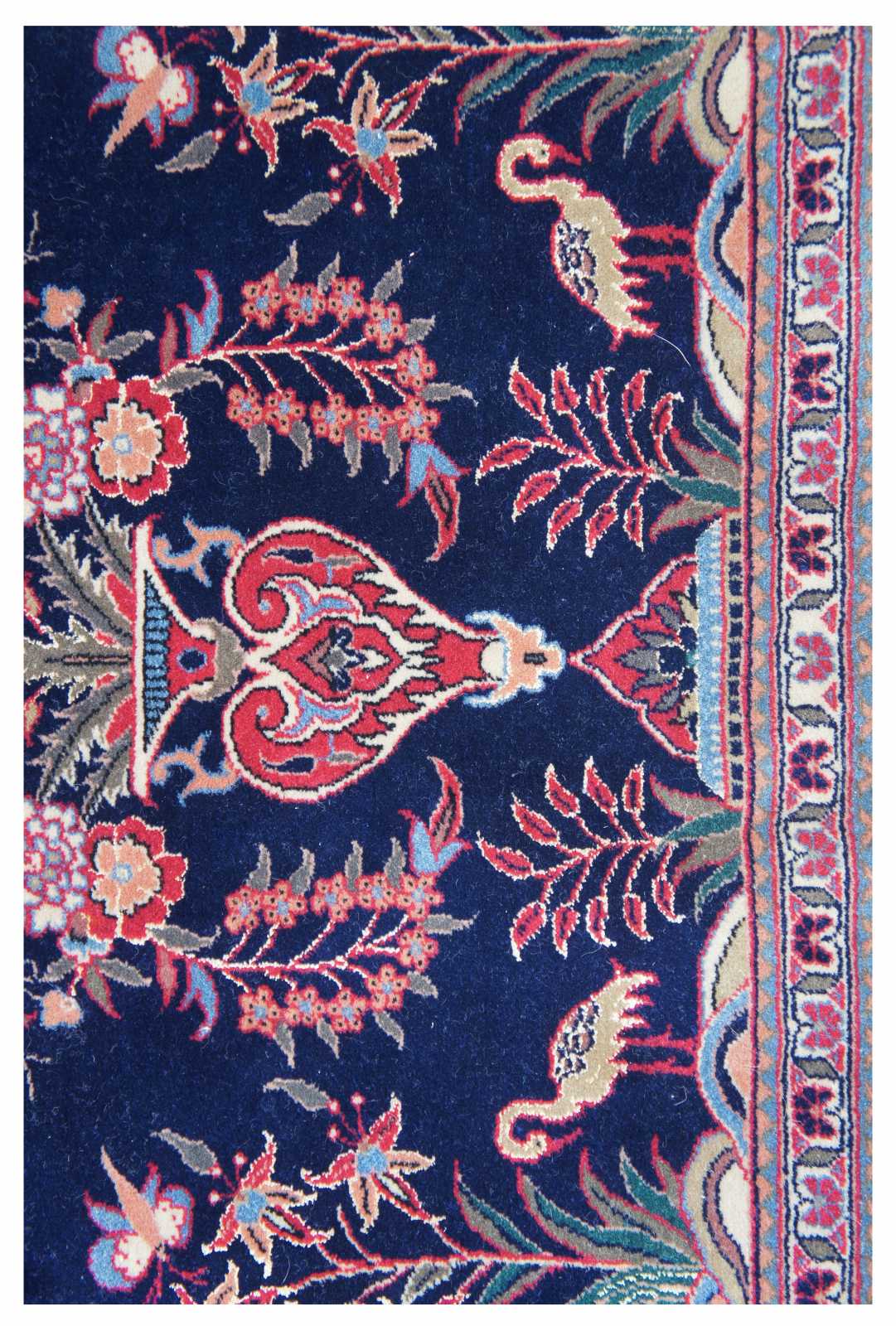 Vintage Persian Oriental vase rug featuring a field of navy blue with a large central vase arrangment of flowers with reds, blues, greens, orange and pink. The piece is accented with butterflies and birds (Flamingo or Stork? / Scissor Tailed Flycatcher?)