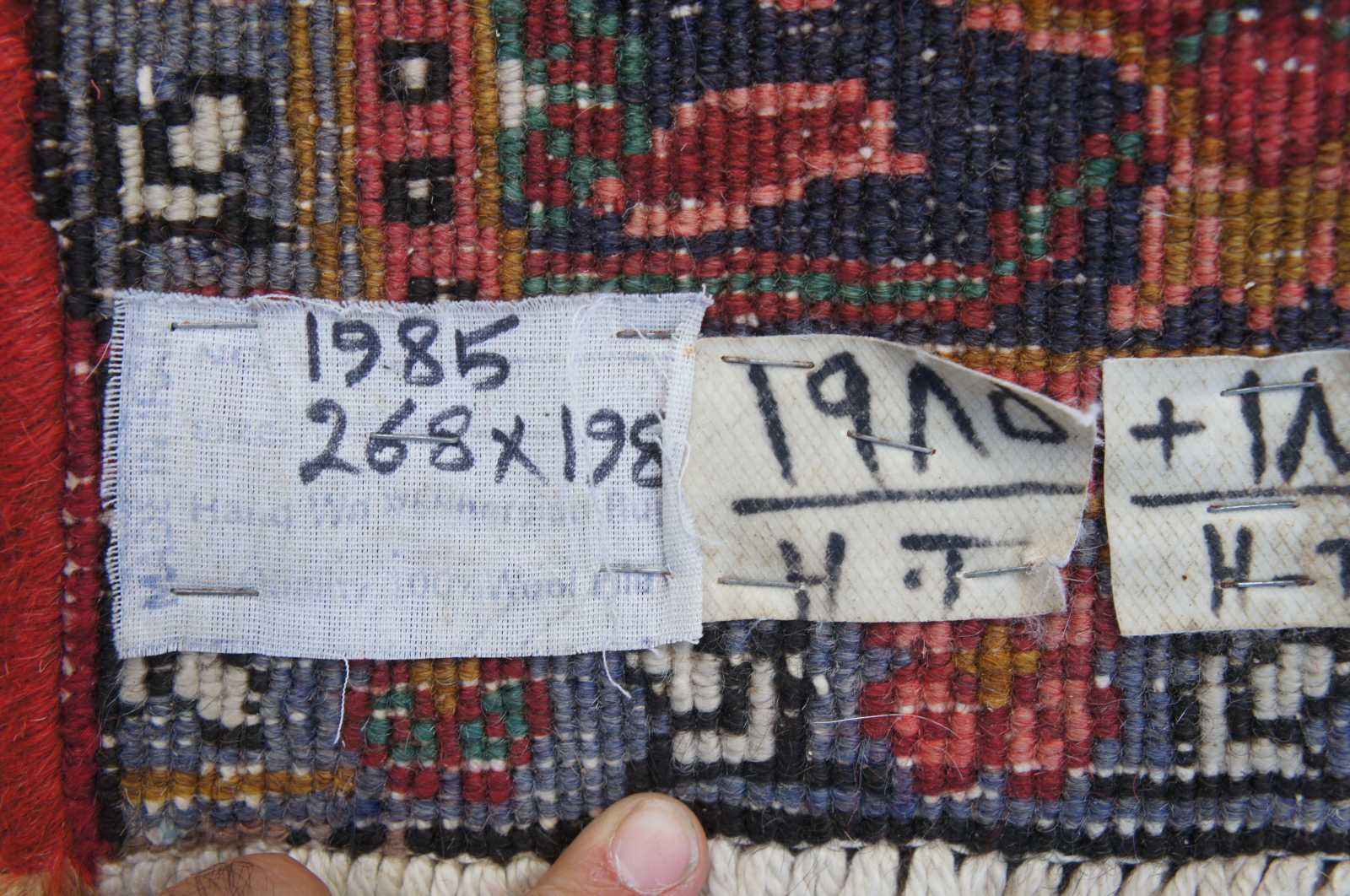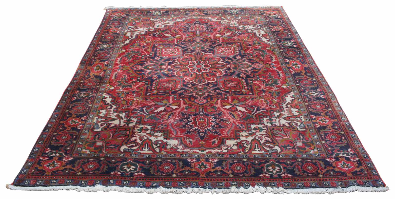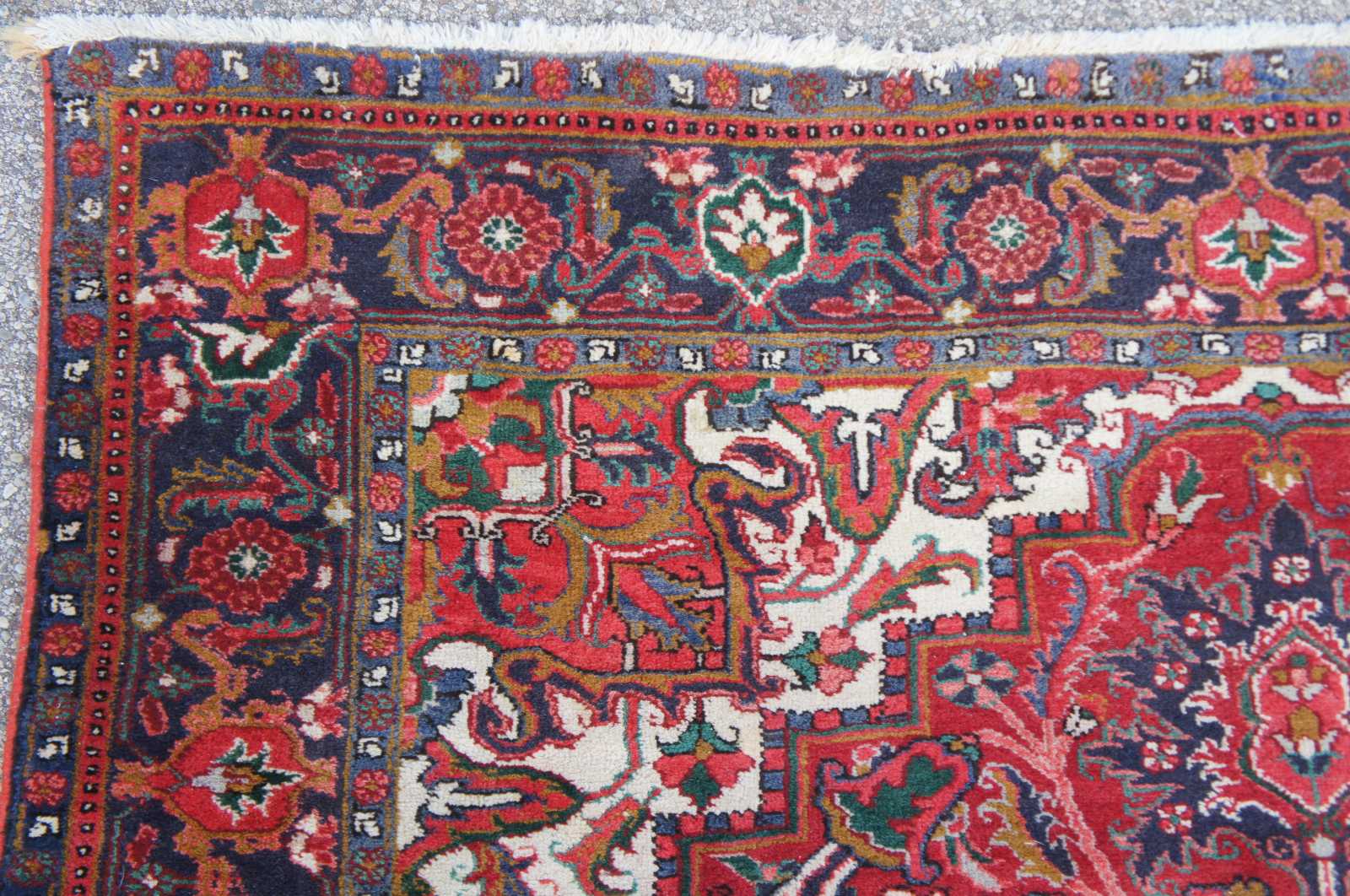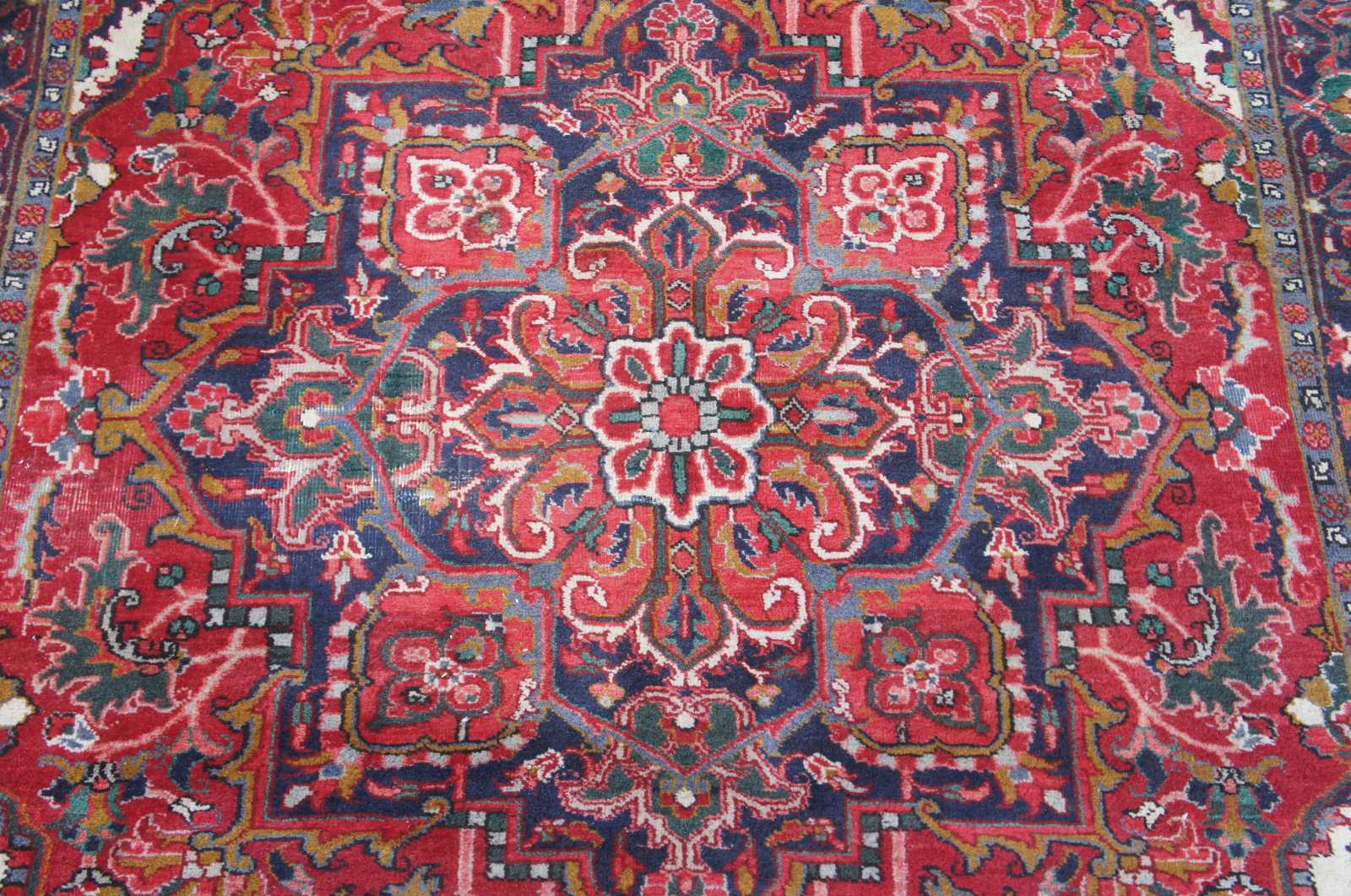 Vitnage 1985 Bakhtiar area rug. Made in Iran of 100% wool, featuring a large central medallion with a flloral motif over a field of reds with blues / teal, tans, pinks, greens, brown / gold, and indigo / purple.