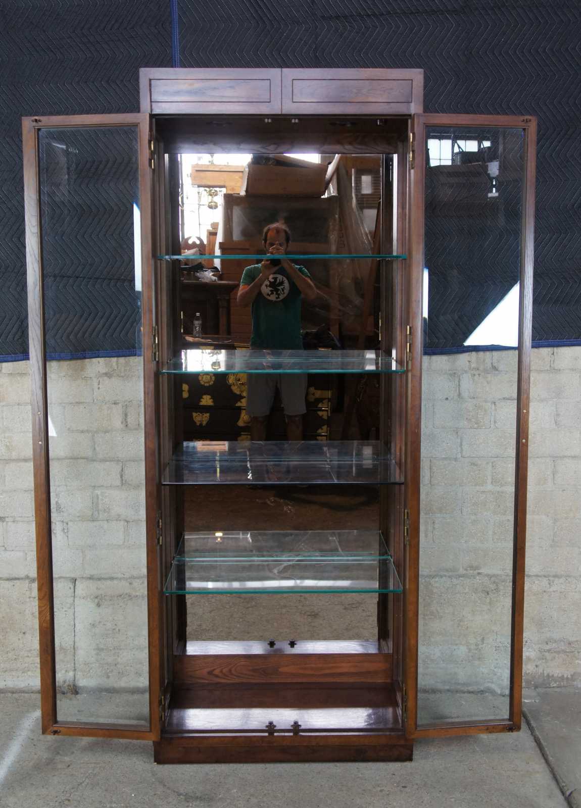 Circa 1970s Henredon Scene One curio cabinet. Made from oak with a campaign inspired look, includes brass hardware and glass shelves. Illuminated on the interior.