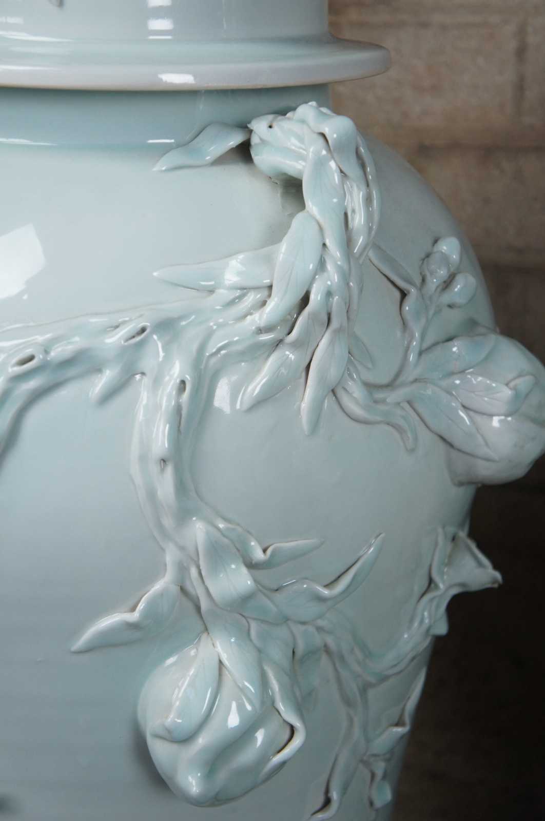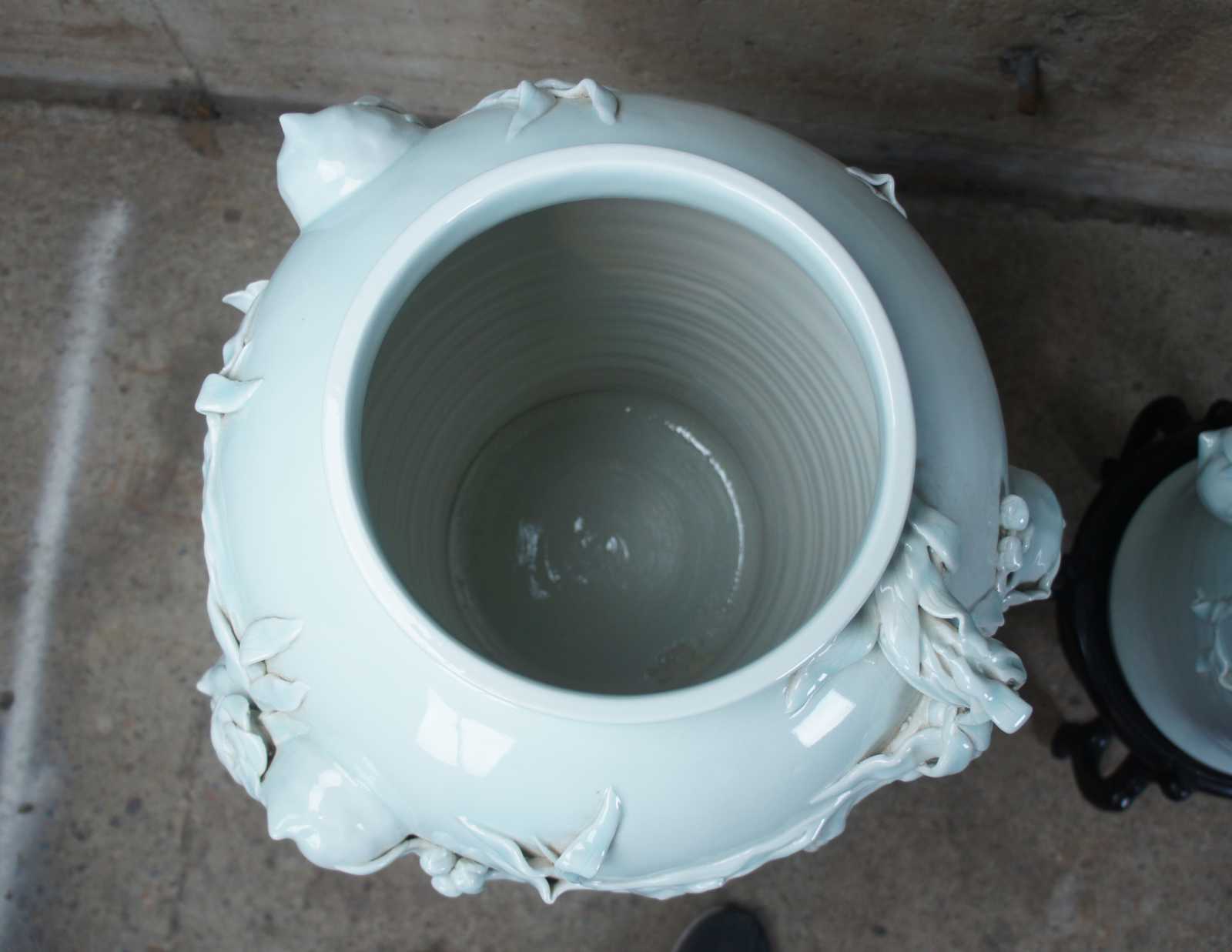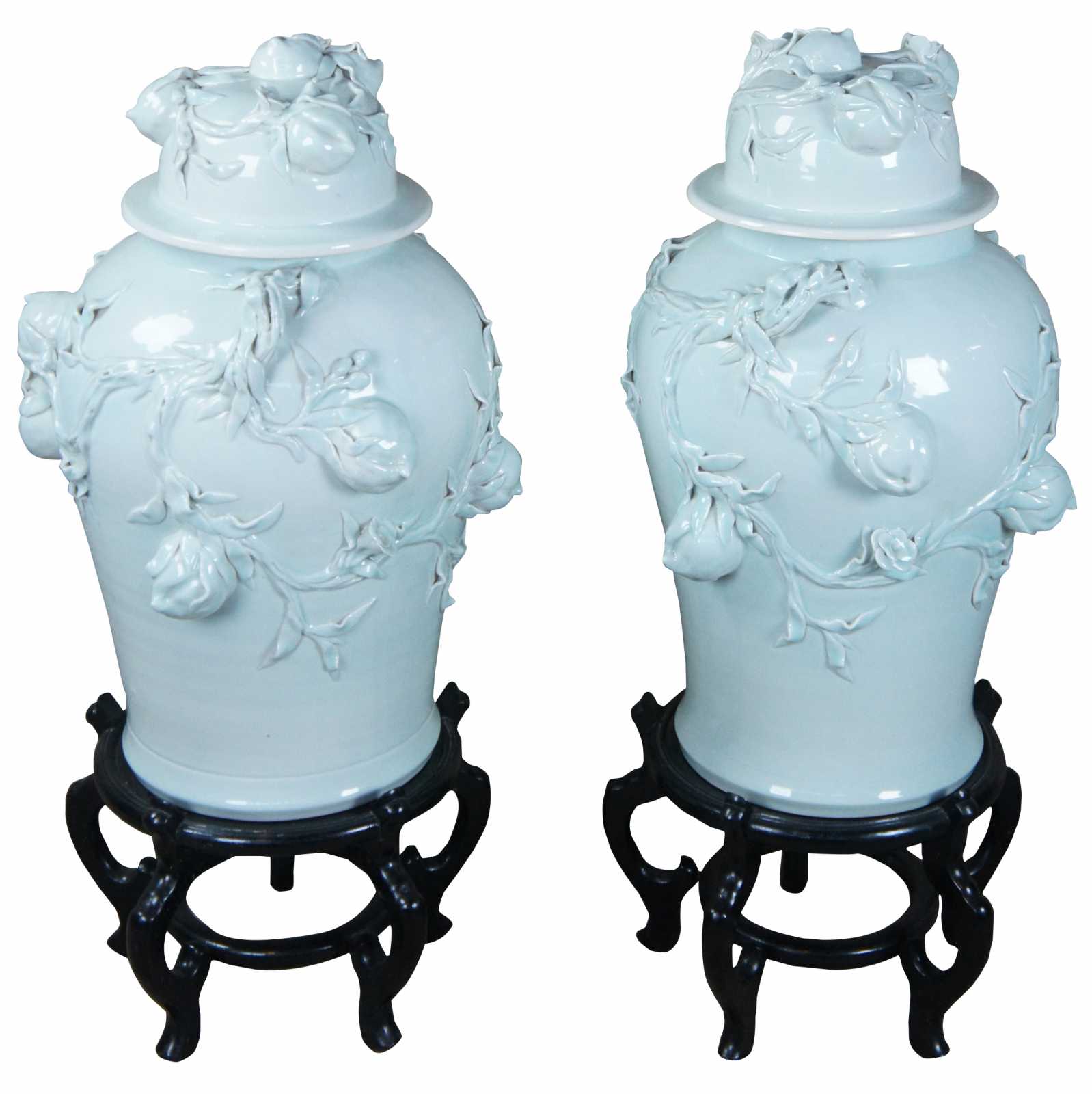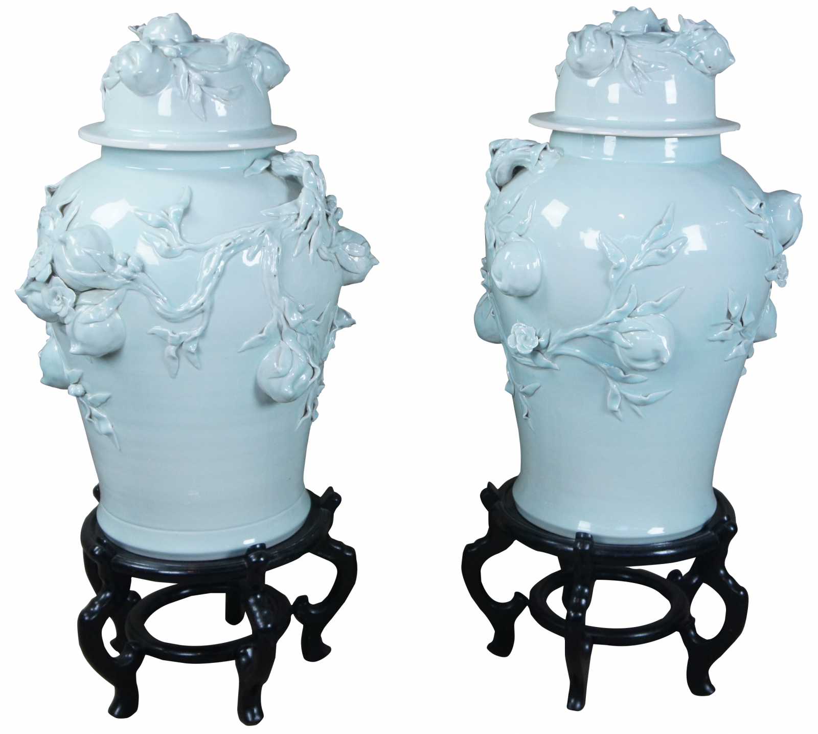 Late 20th century glazed ceramic palace urns on stand. Features two lidded ginger jars with high relief pomegranate motif. Each sits upon ornate black lacquer stand. Color is white with blue teal hue.